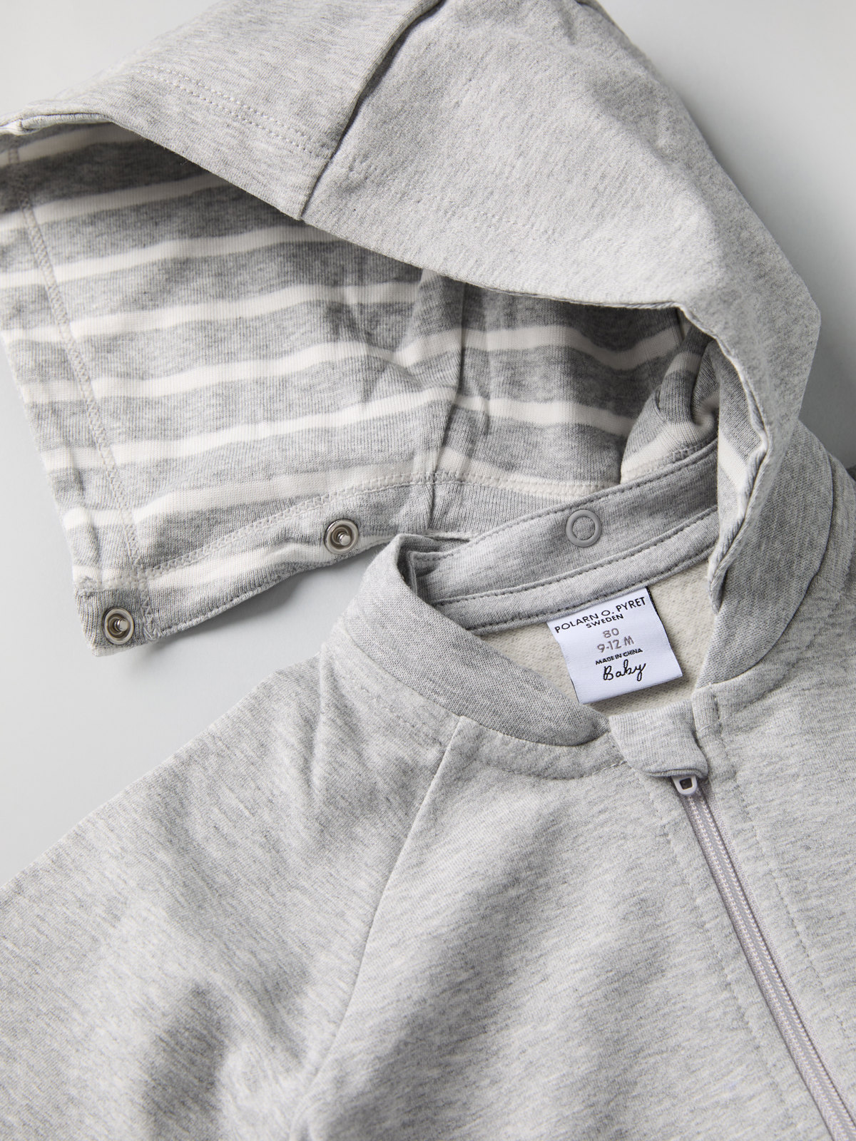 The all-in-one has a pouch pocket and an integral hood with soft cotton jersey lining in our classic stripes.