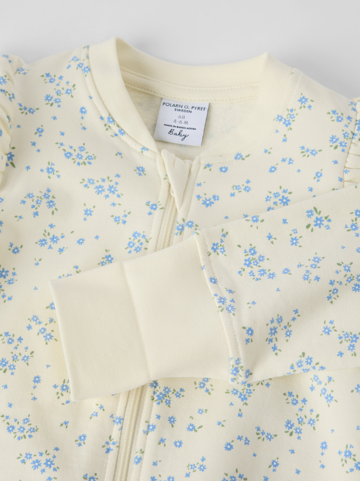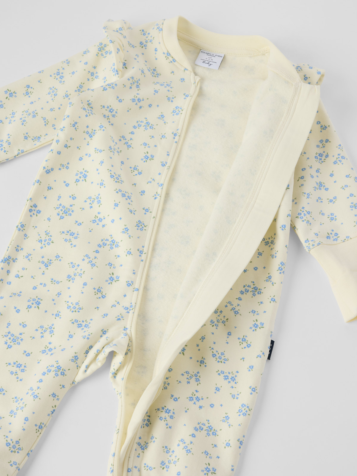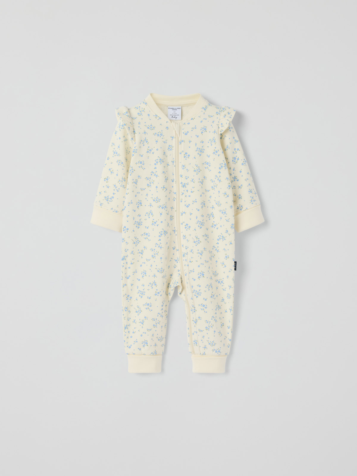 Floral all-in-one in organic cotton with a soft sweatshirt feel and brushed inside for baby. The suit features gentle cuffs at the sleeves and legs for a comfortable fit, plus adorable frills on the shoulders.