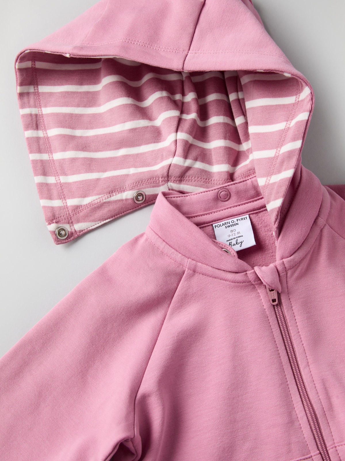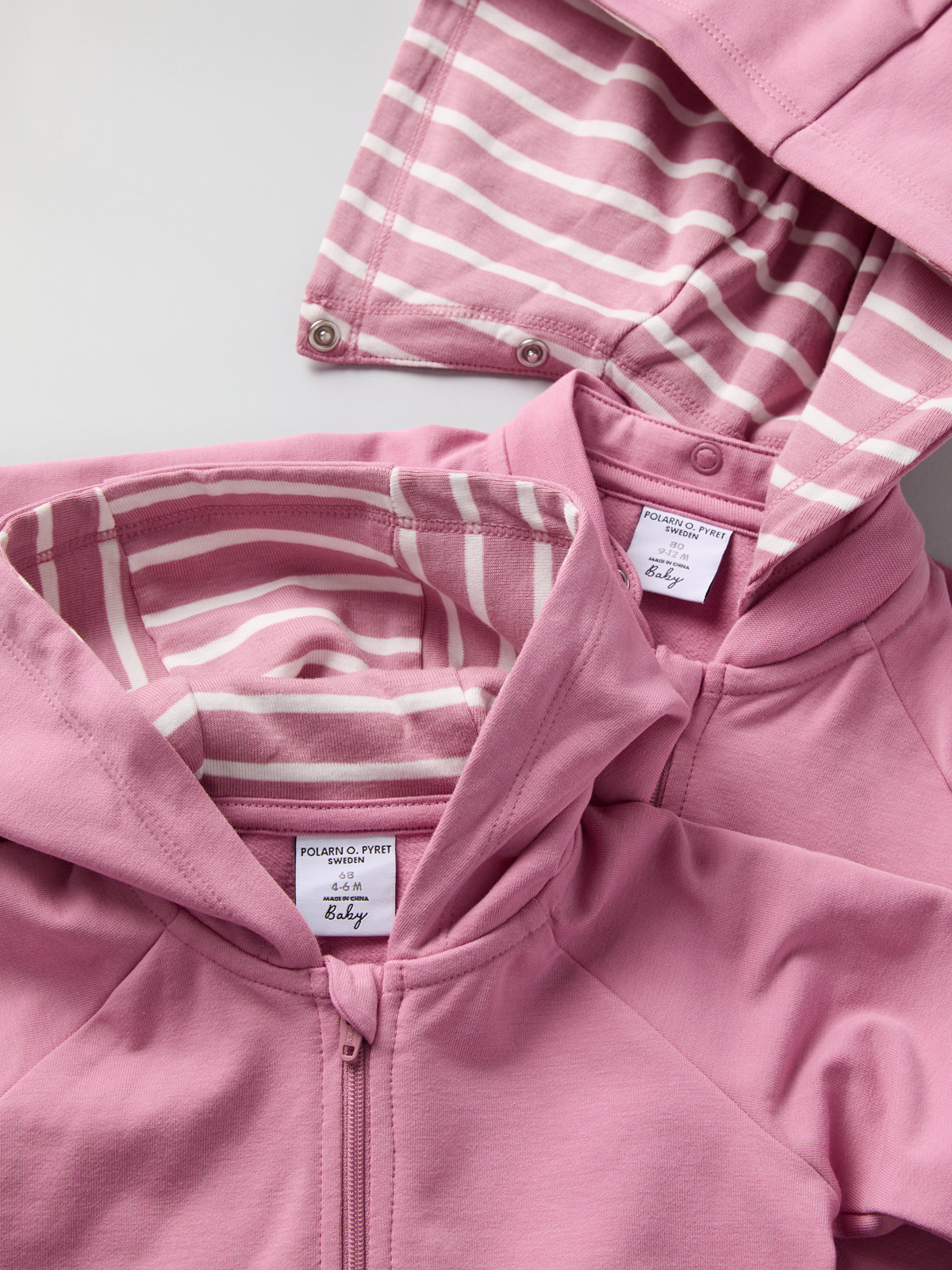 The all-in-one has a pouch pocket and an integral hood with soft cotton jersey lining in our classic stripes.