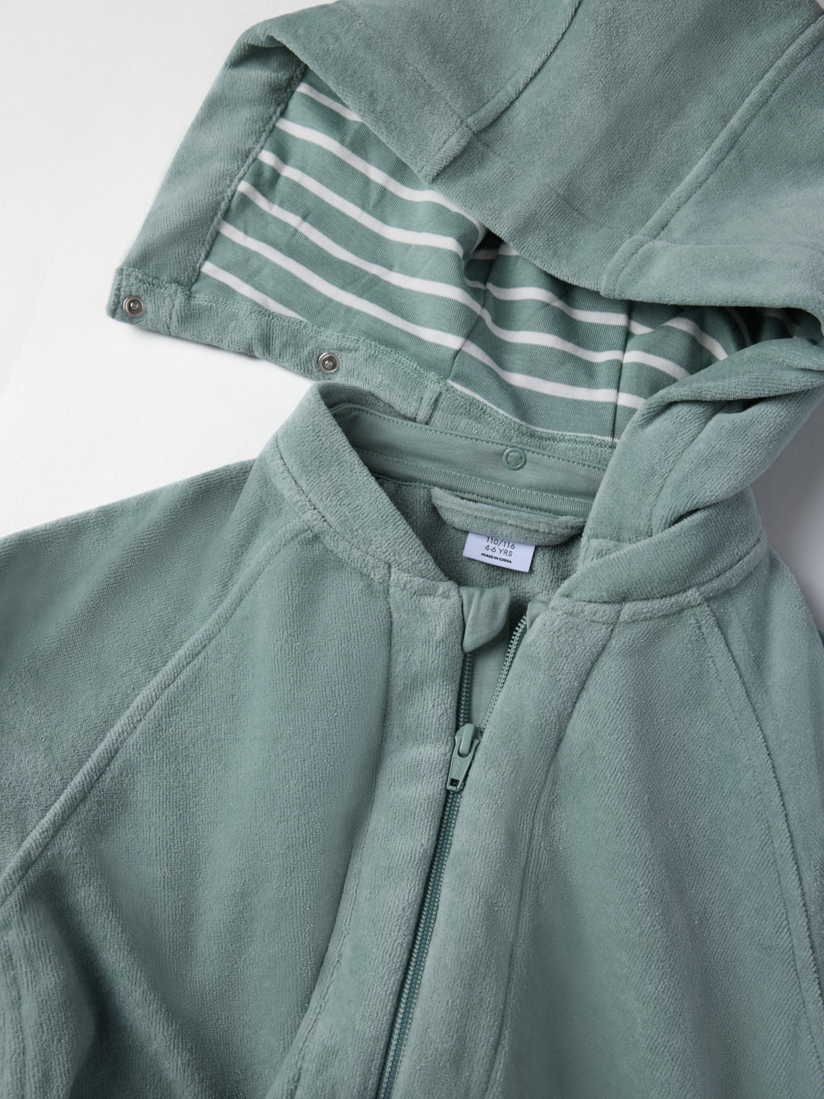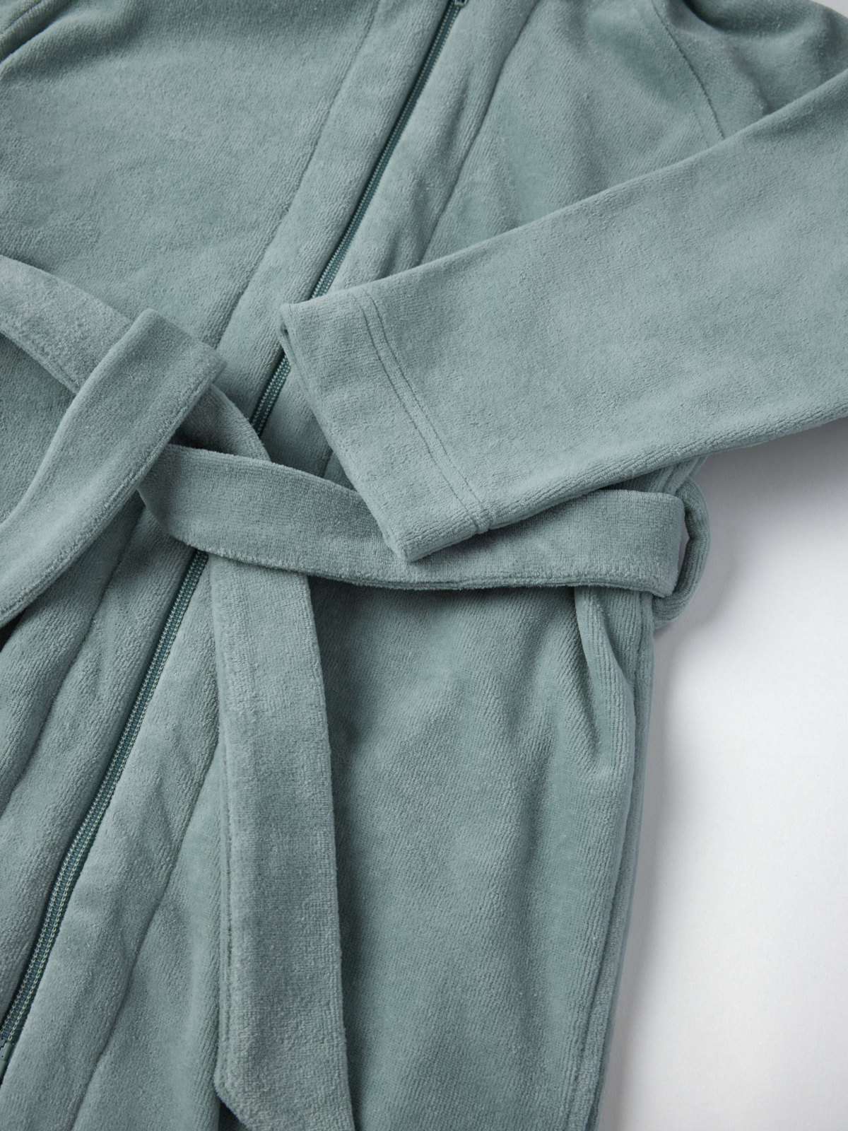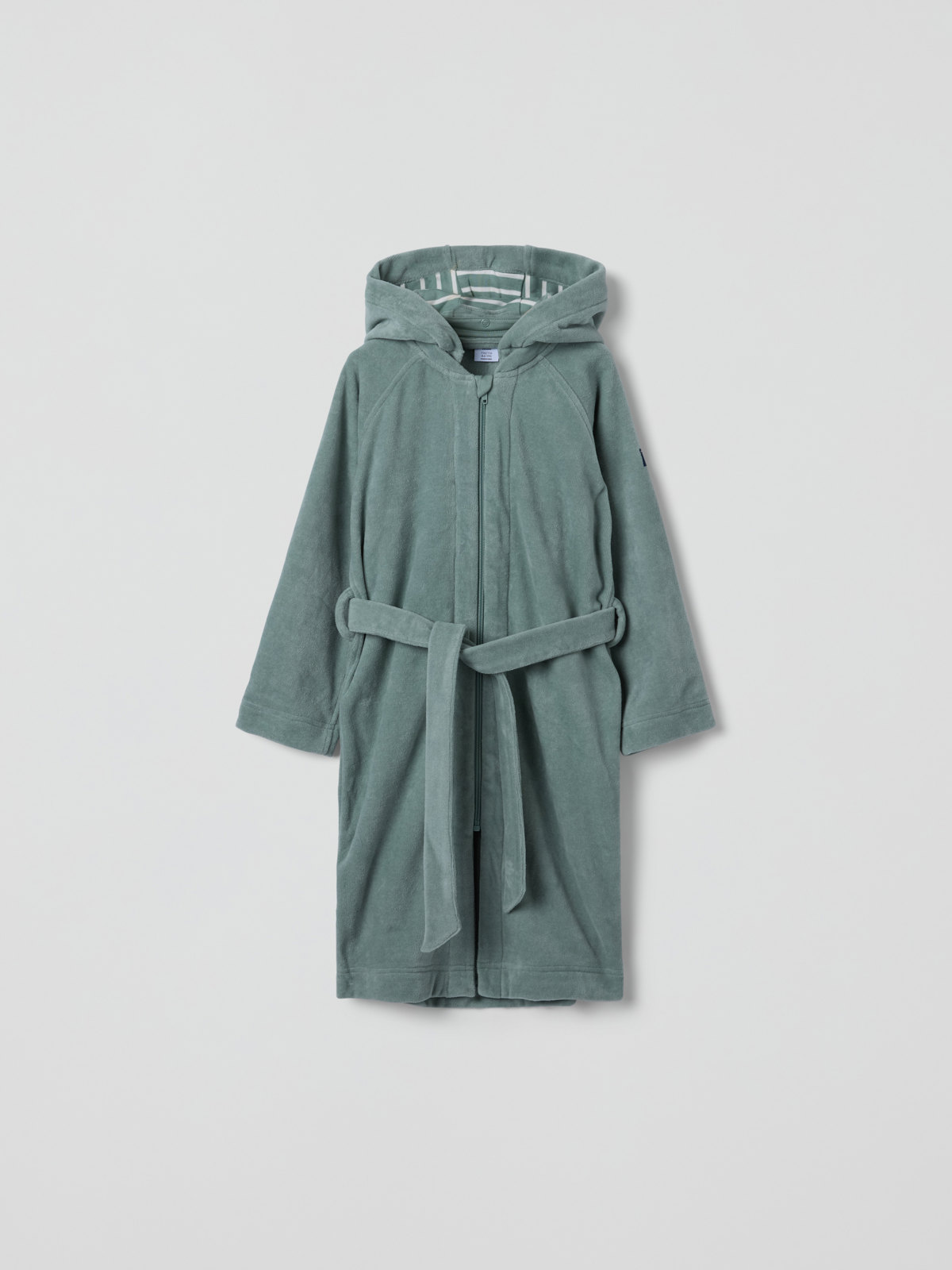 Solid color bathrobe in soft and comfy organic cotton and recycled polyester blend. It has an integral hood with soft cotton jersey lining in our classic stripes. The bathrobe goes down to the mid-calf, and has a zipper and tie closure.