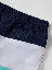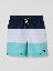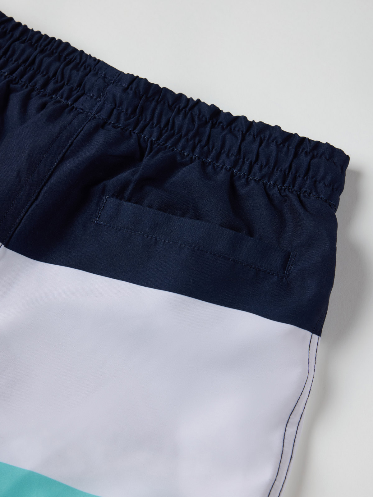 Block-stripe swim shorts with elastic waist and drawstring. The shorts have inner pants in soft mesh and a back pocket. They are made from recycled polyester.