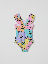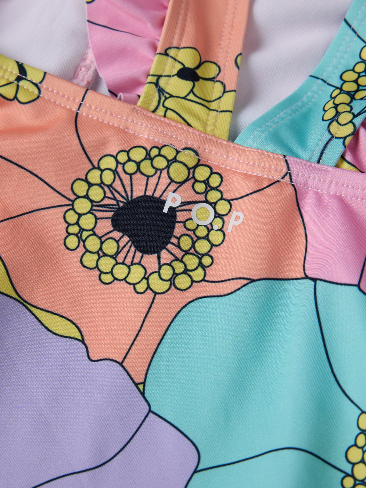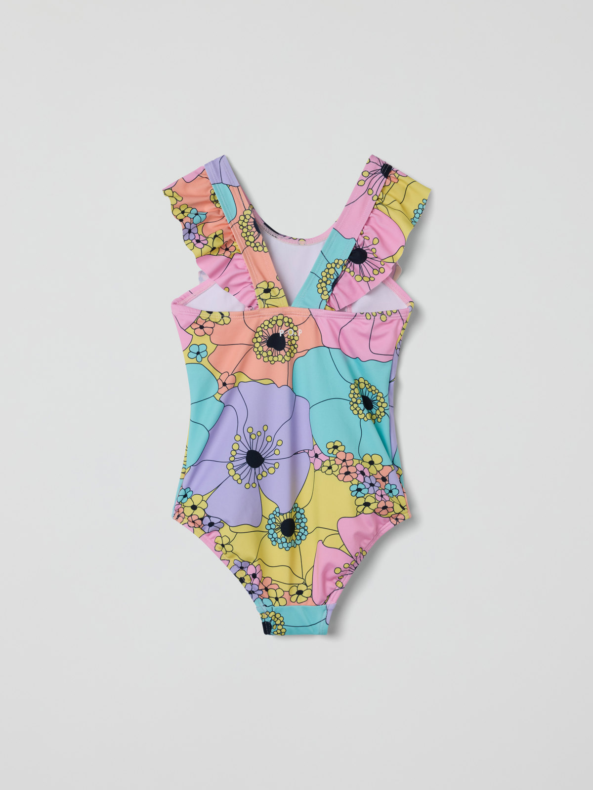 Floral swimsuit in soft and comfy fabric made of recycled polyester. The swimsuit is fully lined and has wide shoulder straps with cute ruffles over the shoulders.