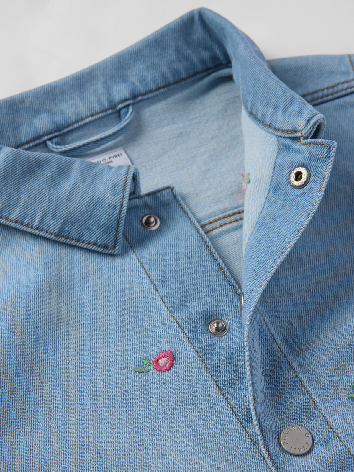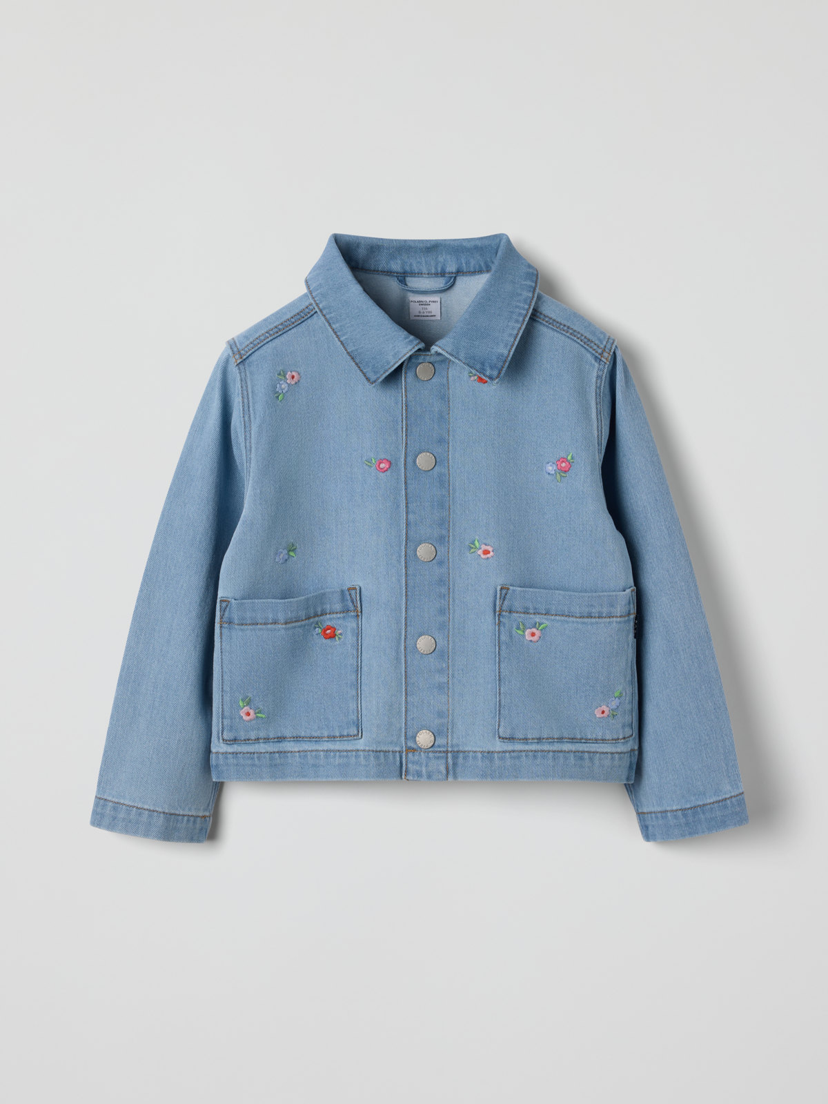 Denim jacket in soft and comfortable denim with a slight stretch – perfect for lovely spring and autumn days! The jacket features small embroidered flowers and two large front pockets. It closes with press buttons.