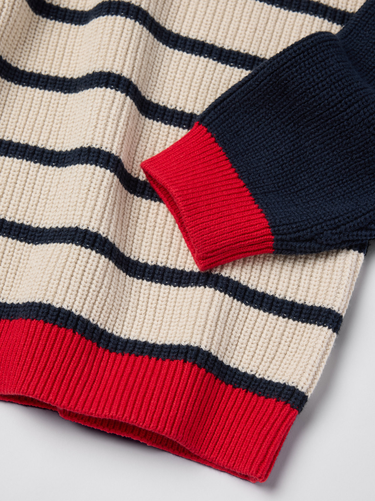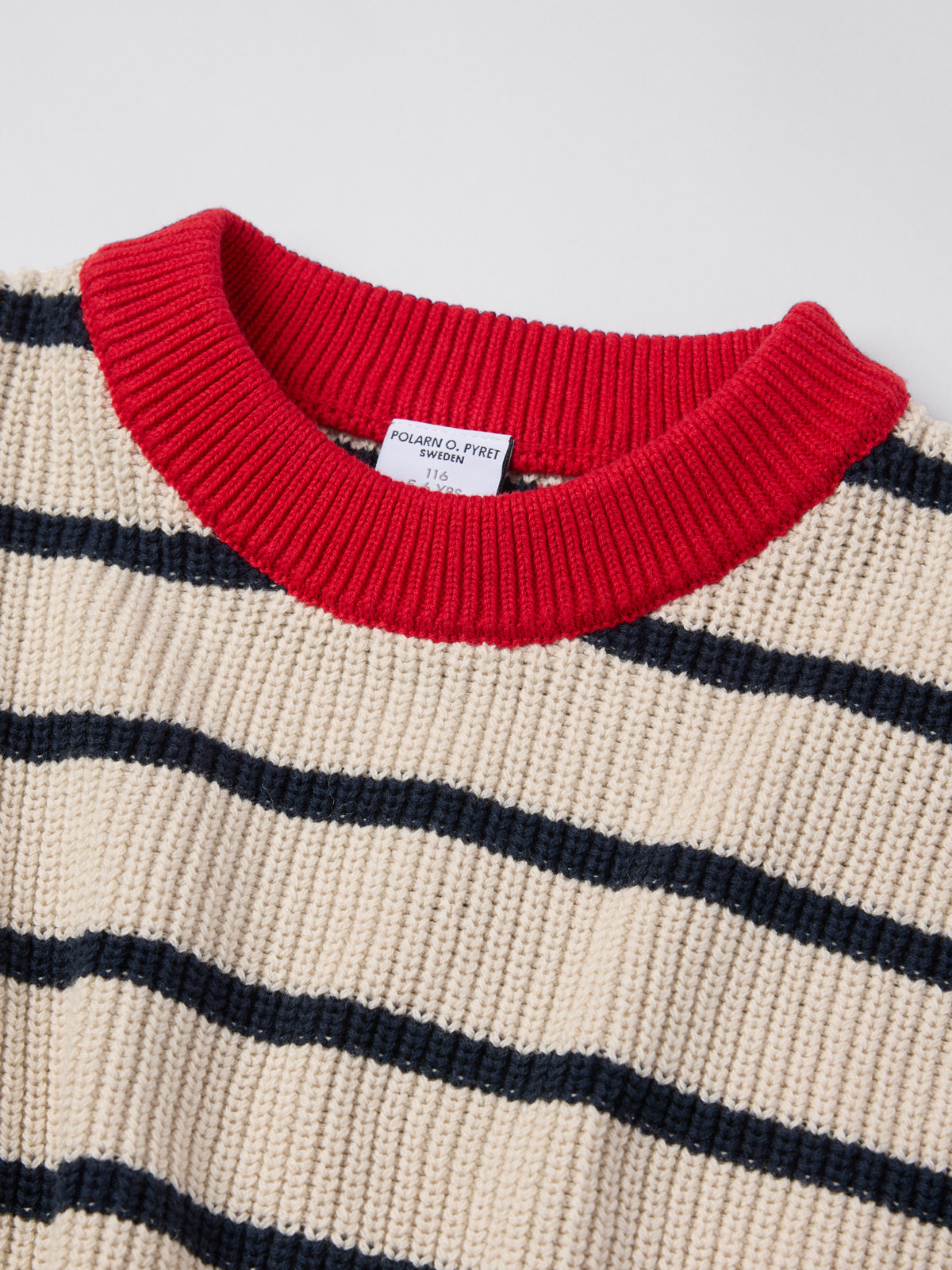 Knitted jumper in 100% organic cotton – a truly cosy autumn favourite! This jumper features stripes and colour blocking. Soft cuffs at the neckline, sleeve ends, and hem provide a comfortable fit.