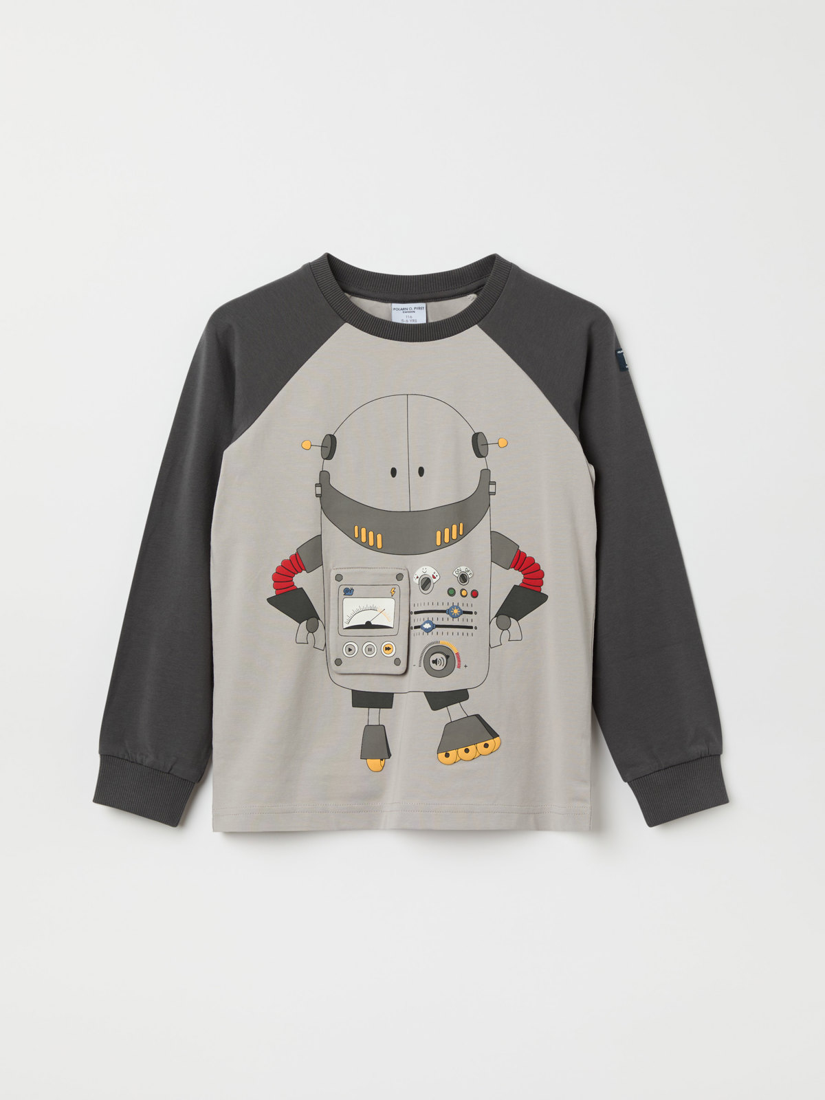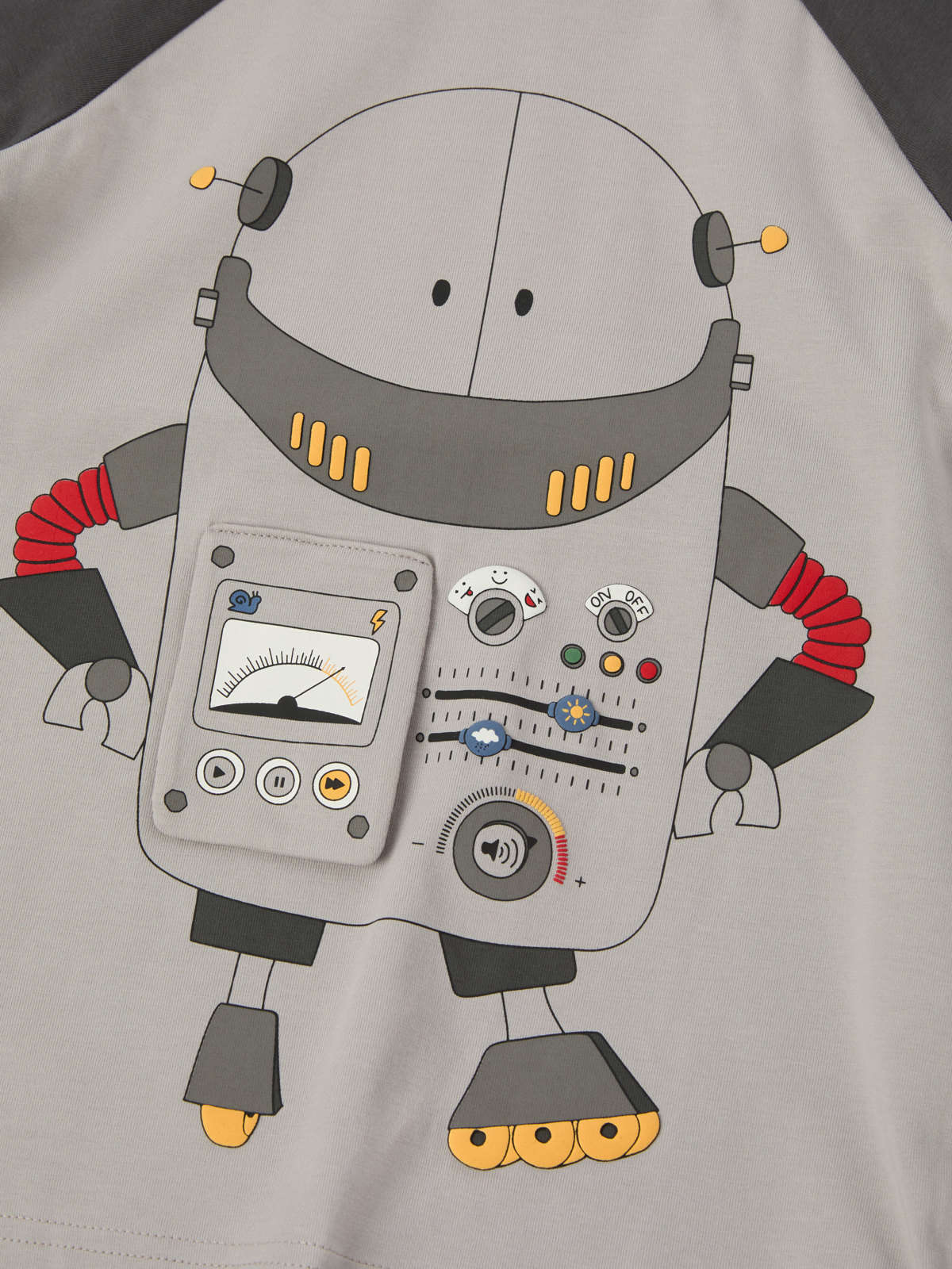 A soft and comfy top in organic cotton with a large robot print on the front. The print is a "puff print", which means that it varies in thickness, providing little fingers with an exciting sensory experience.