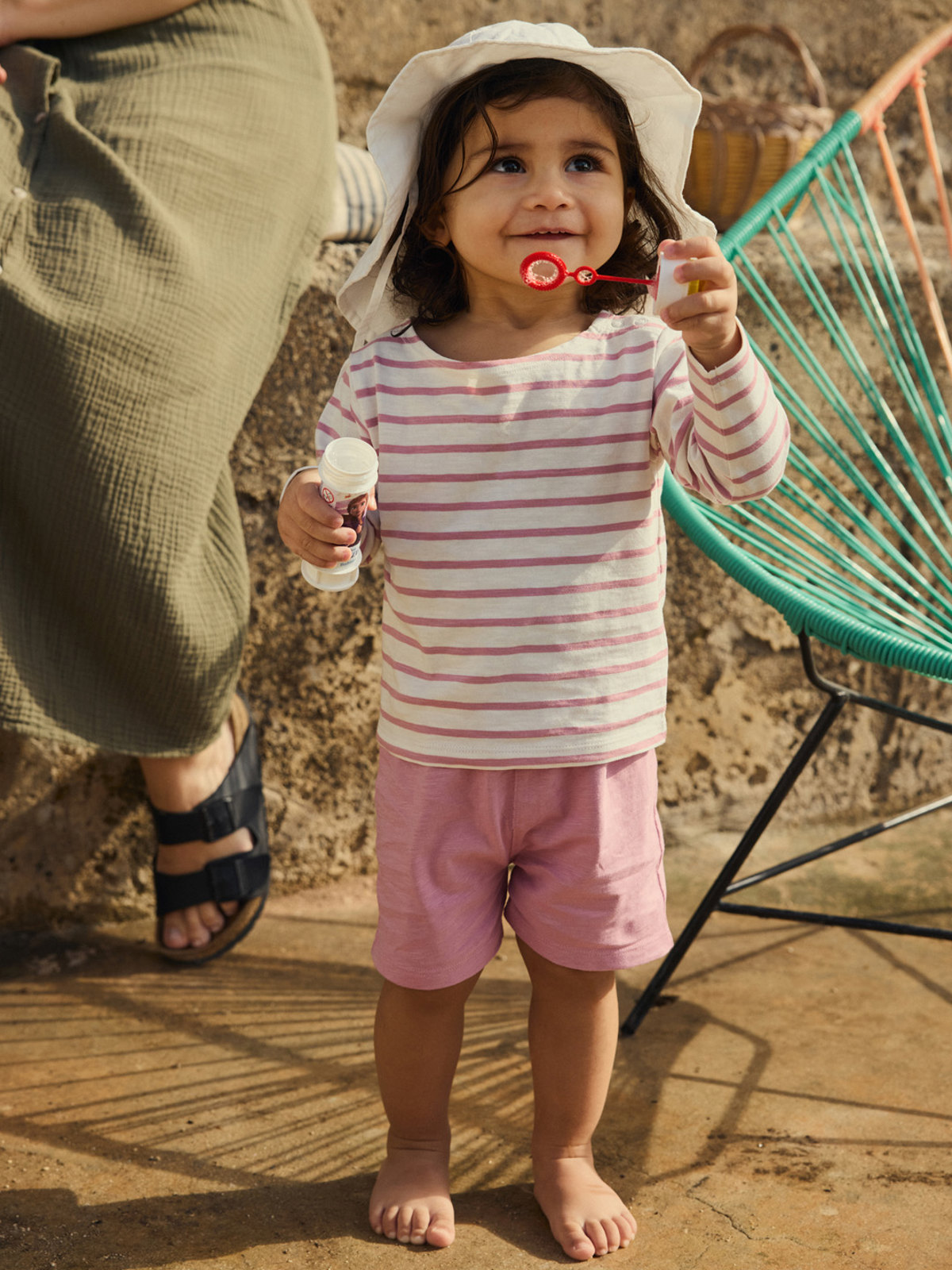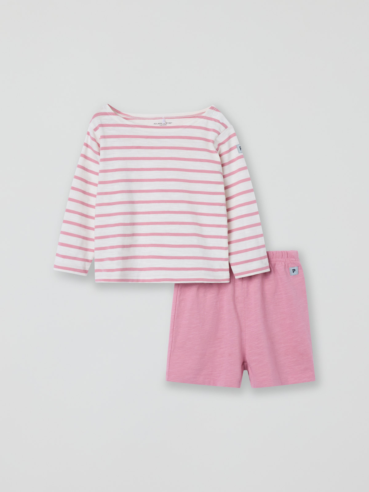 Set comprising top and shorts in 100% thin organic cotton for baby – perfect for warm days, as it provides light protection from the sun and is cool and comfy. The top has snaps on one shoulder to facilitate dressing. The shorts have an elastic waist for a comfy fit.