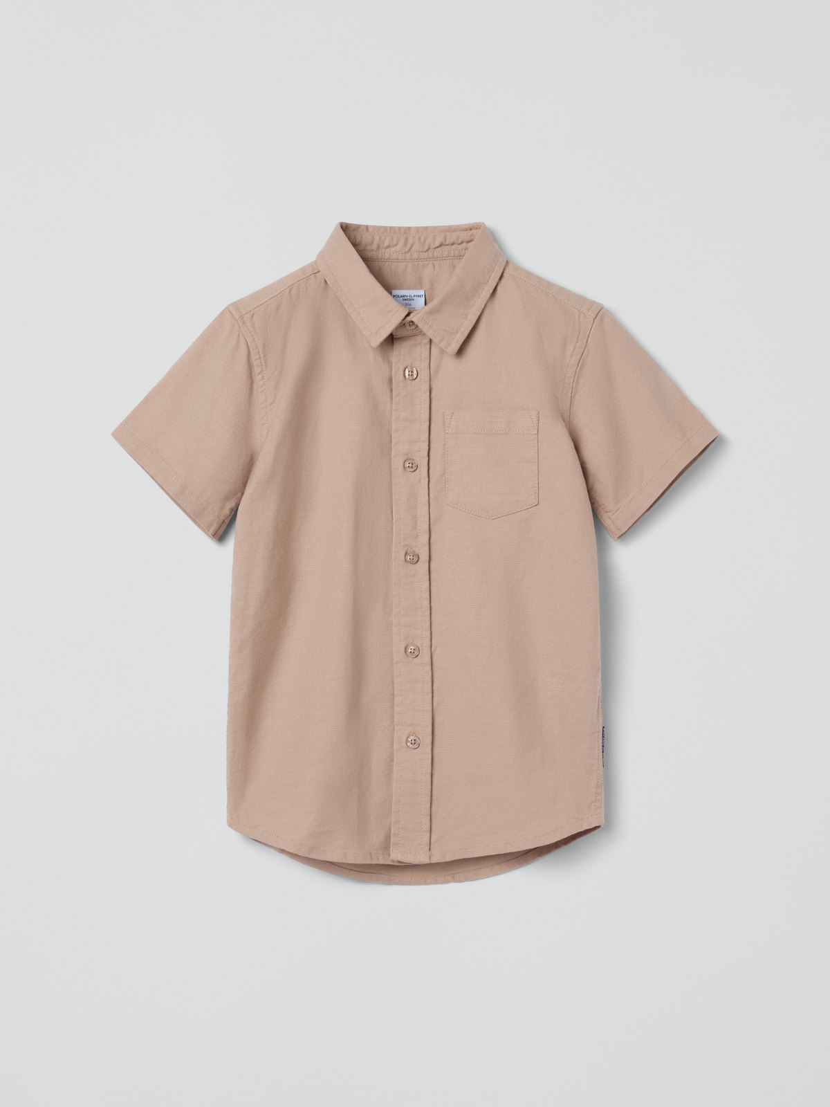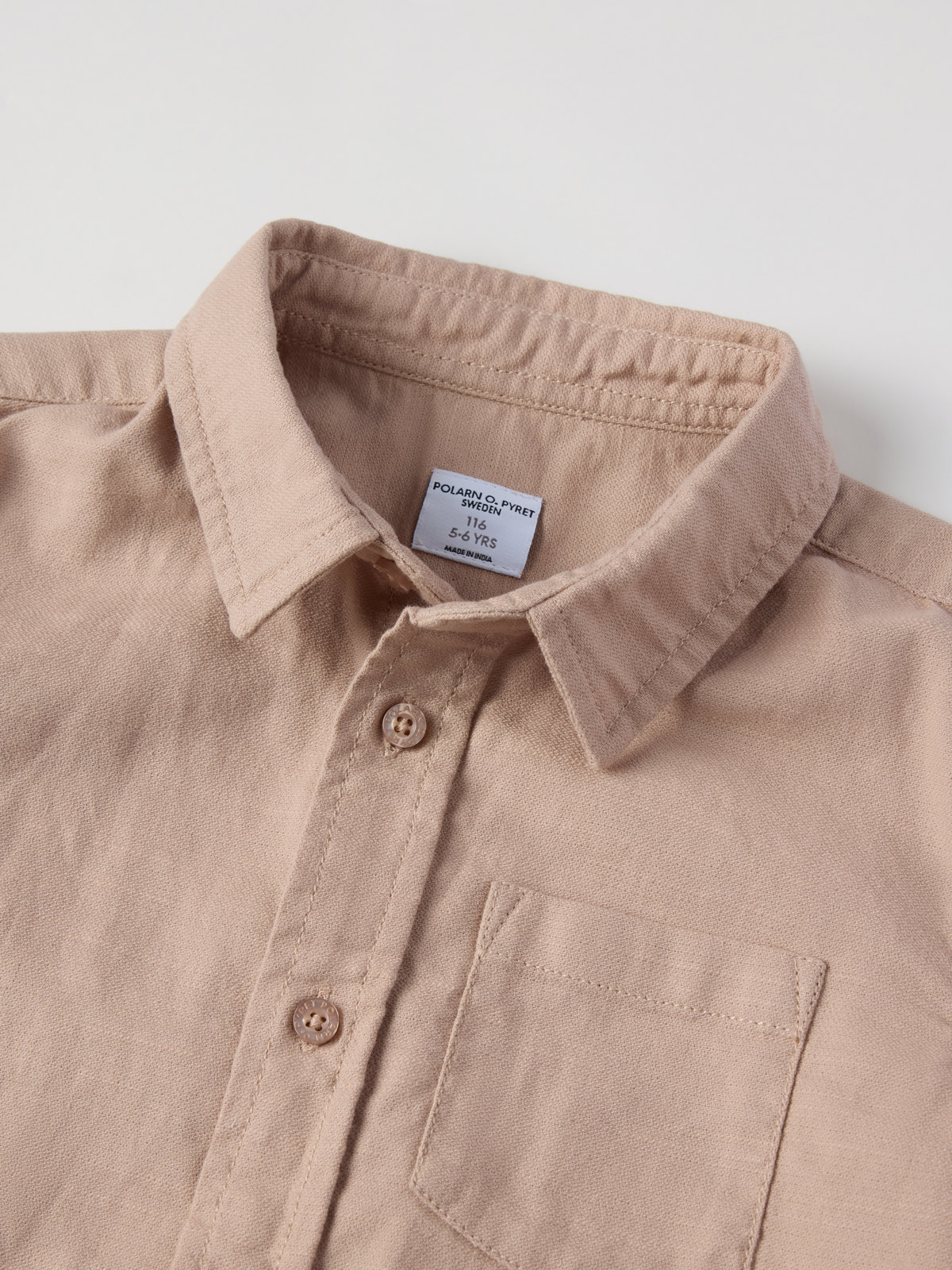 Solid color short-sleeved shirt in thin organic cotton with a linen feel – perfect for both everyday wear and summer parties! The shirt has a chest pocket and button closure at the front.