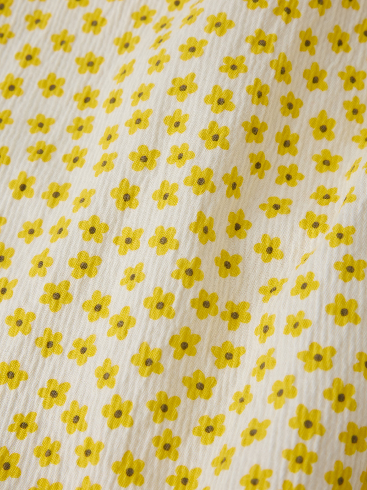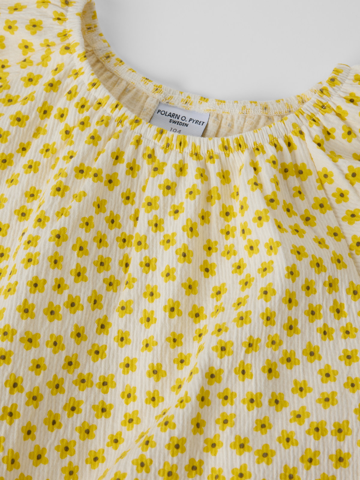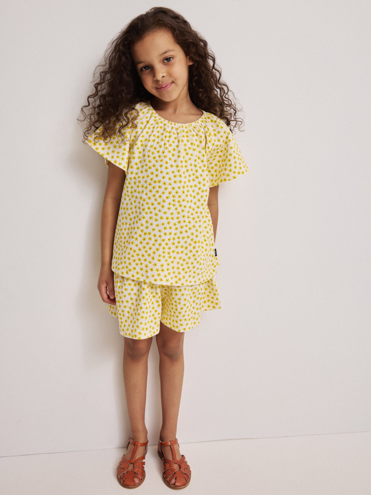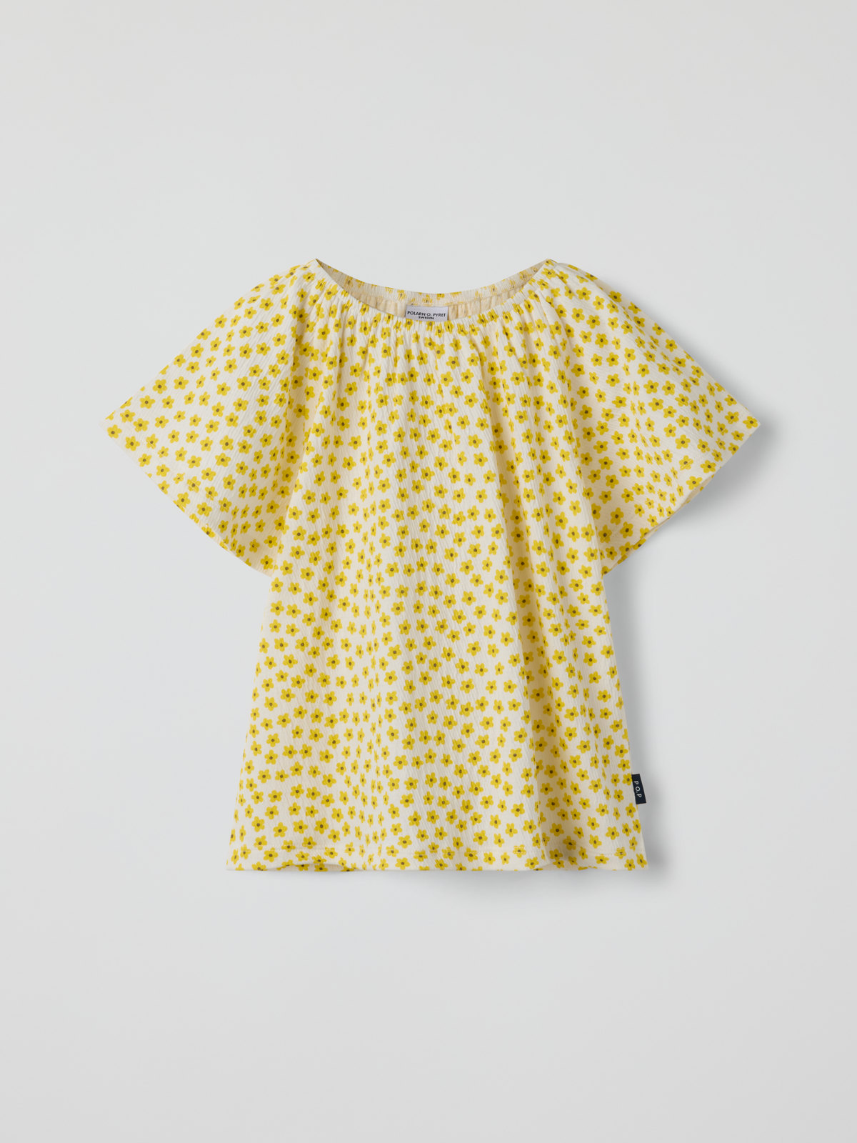 Short-sleeved patterned top in lightweight muslin jersey made from organic cotton – ideal for sunny days! The top features a breezy design with a flared hem and wide sleeves.