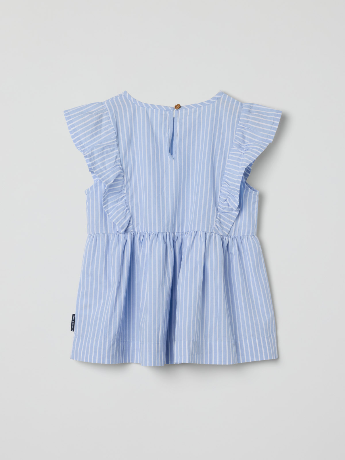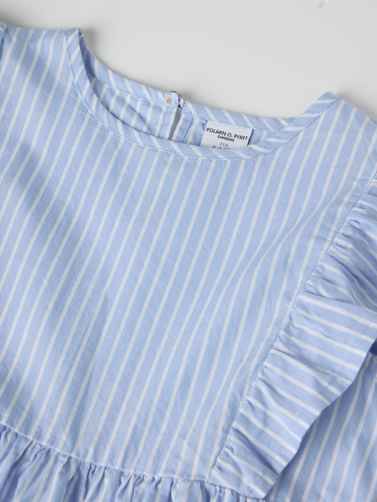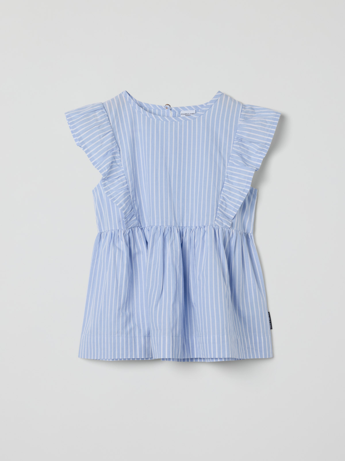 Cute striped top in thin and soft organic cotton poplin – a must-have for both end-of-school and summer parties! The top has soft ruffles over the shoulders and a gathered hem with a nice drape. It has a back placket.