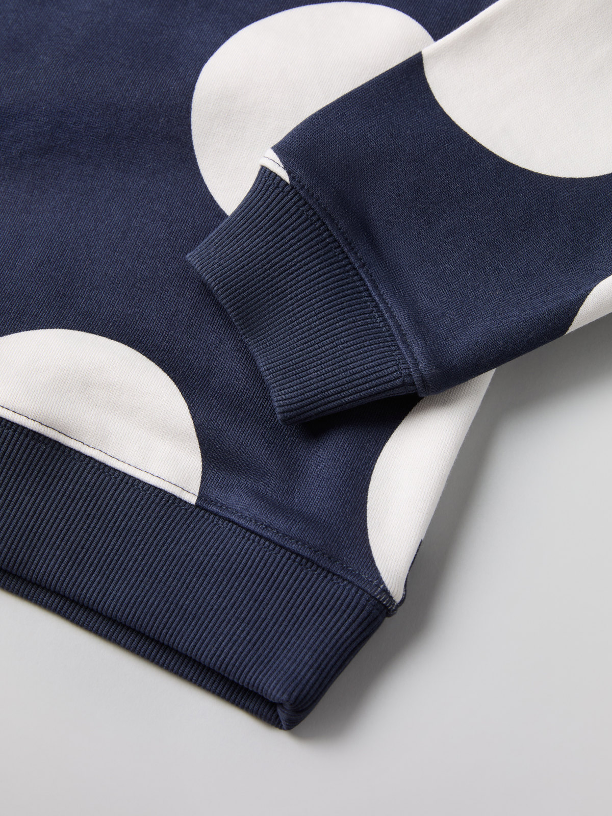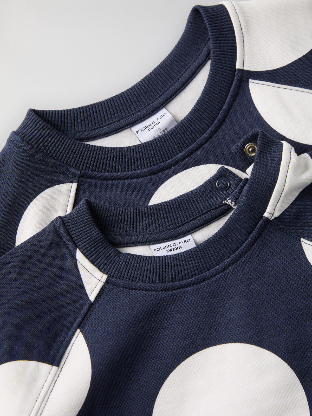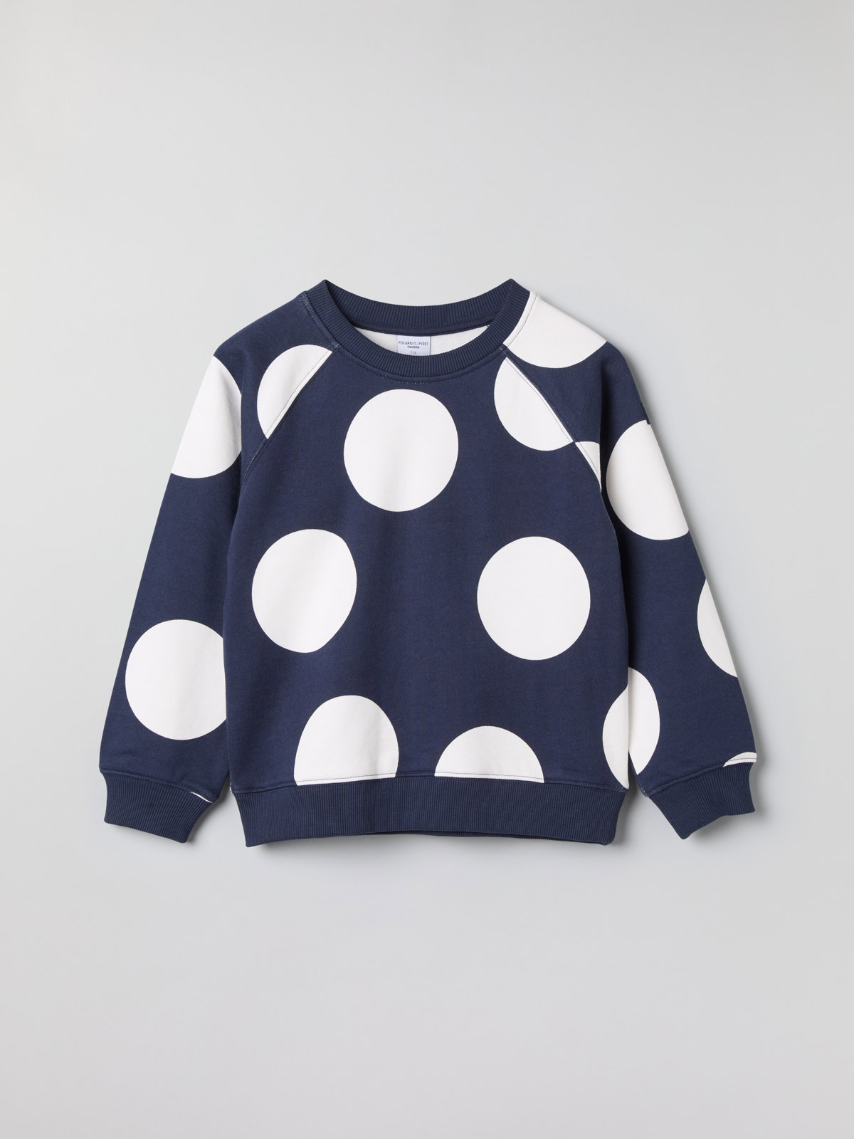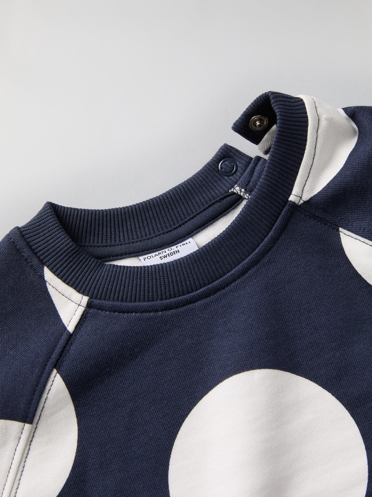 The top is spotted, and features a soft, ribbed neckline and cuffs.