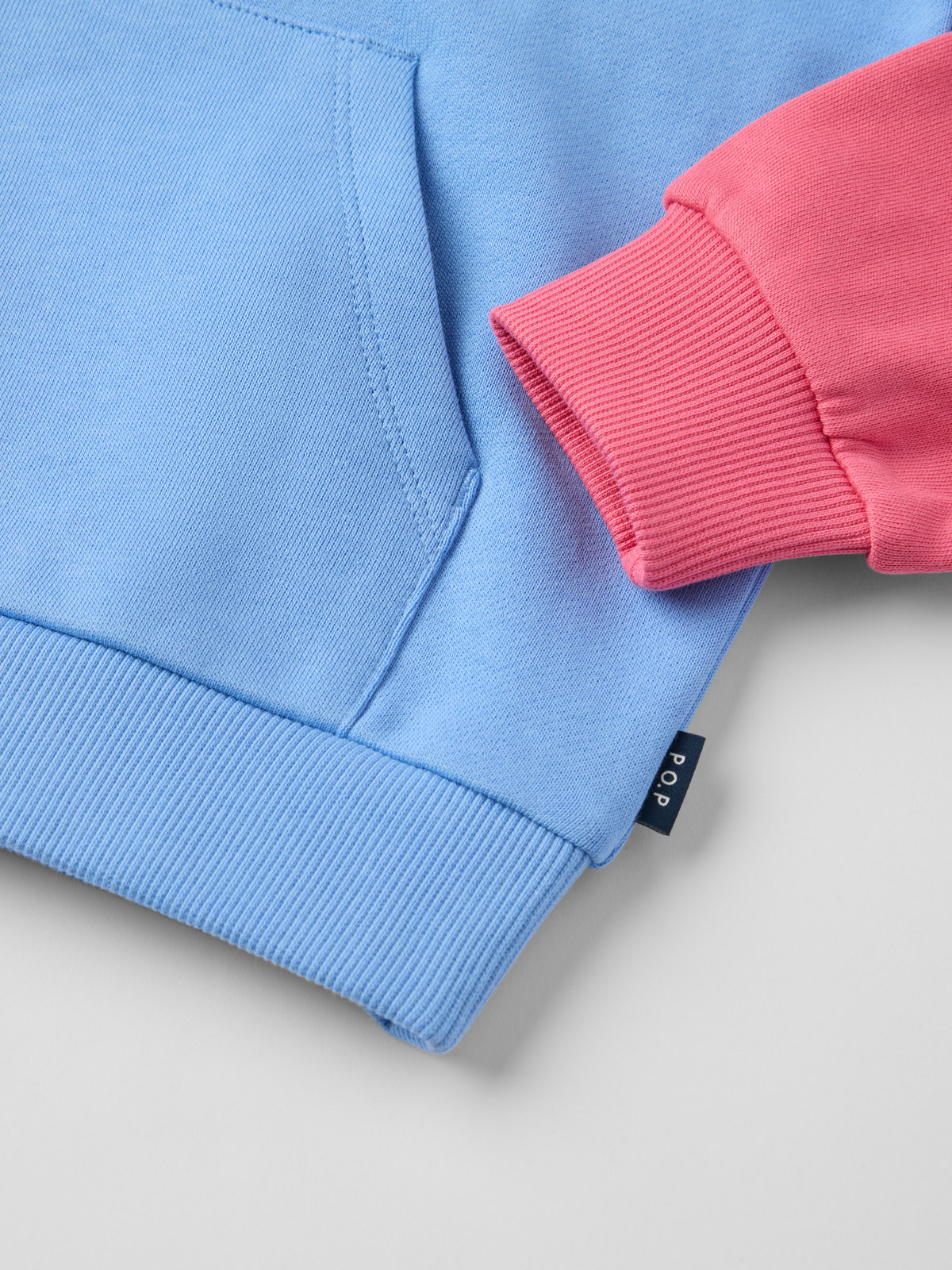 Jumper made from 100% soft organic cotton – perfect for any occasion! This jumper is colour blocked and features a front kangaroo pocket. It has a ribbed neckline and cuffs for a comfortable fit, as well as a small embroidered logo on the chest.