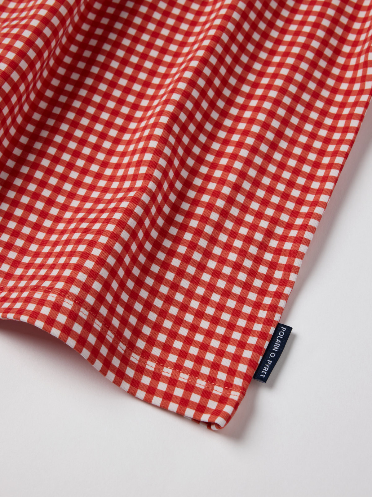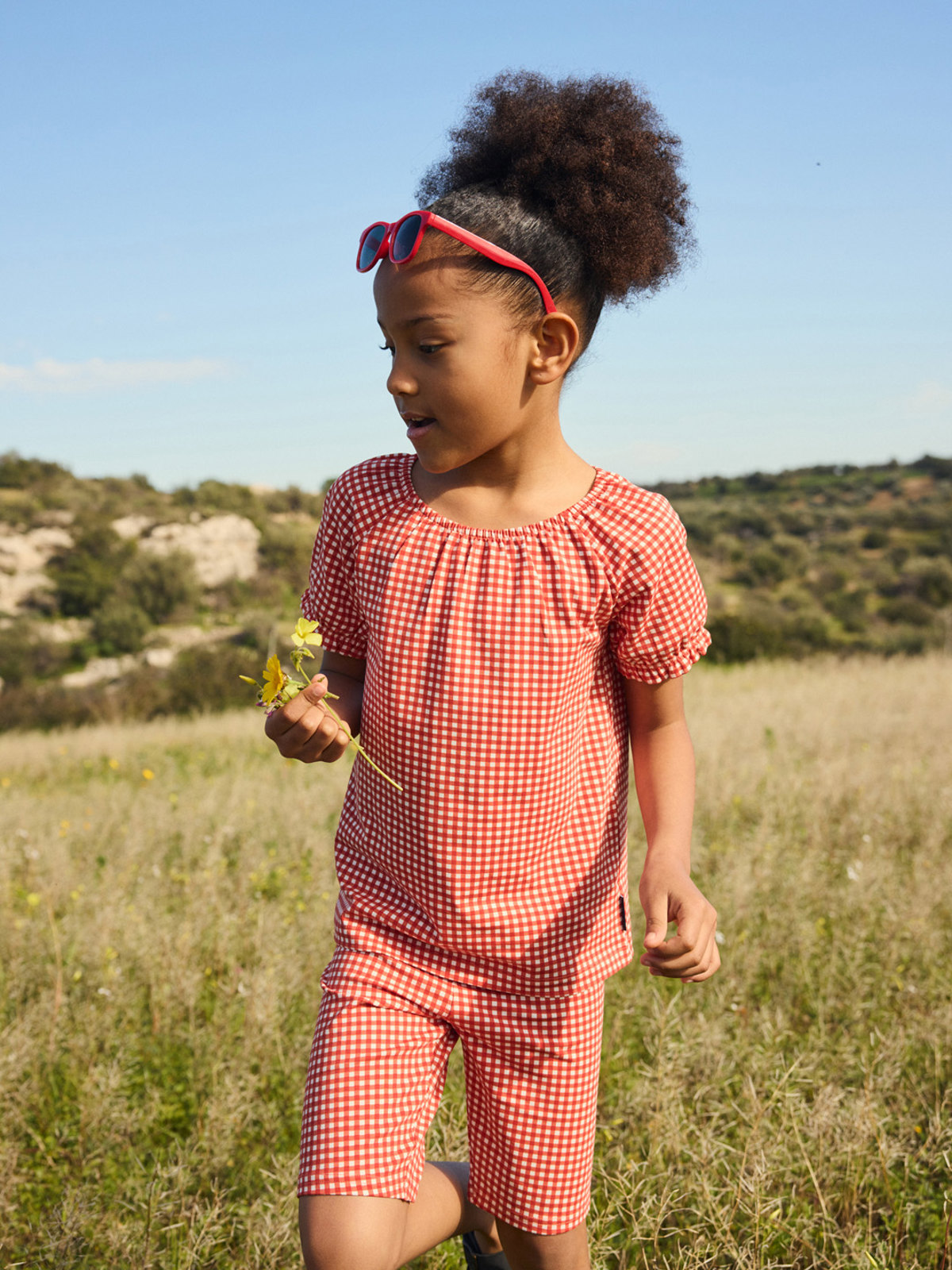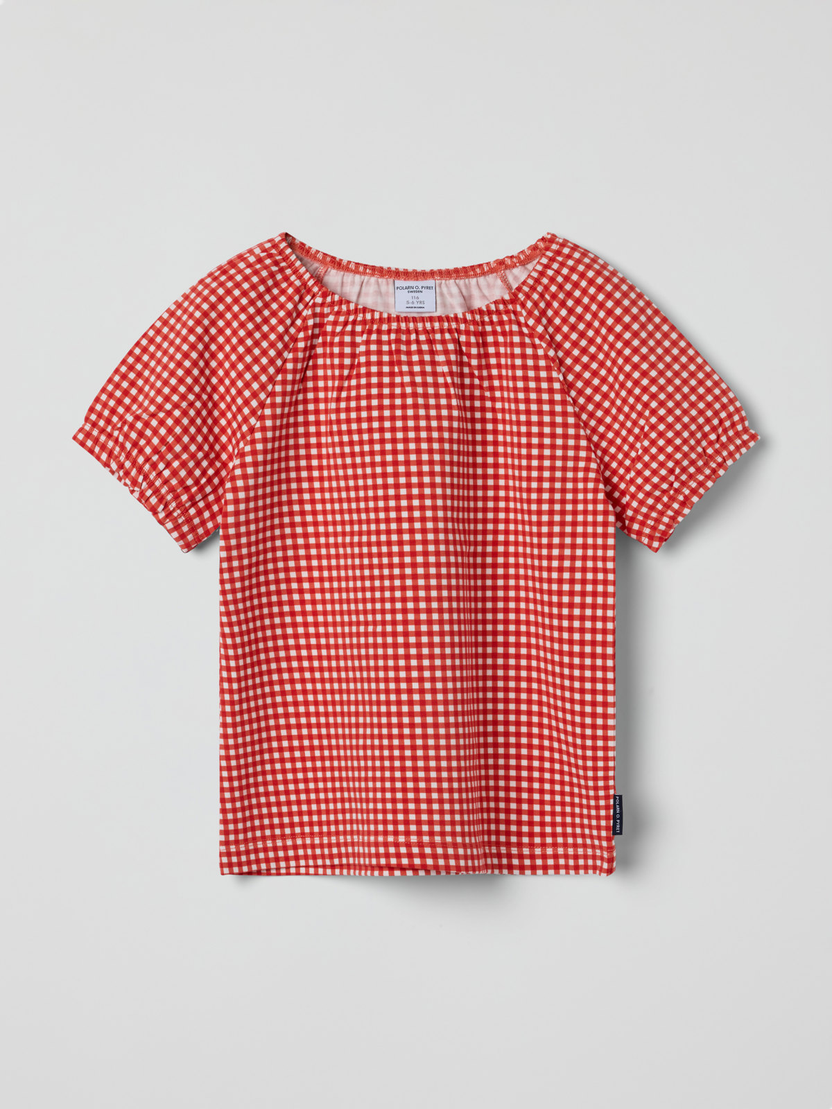 Cute checked top in organic cotton jersey with pretty puff sleeves – a summer favorite for both everyday and party wear! The top has elastic trim and small ruffle cuffs.
