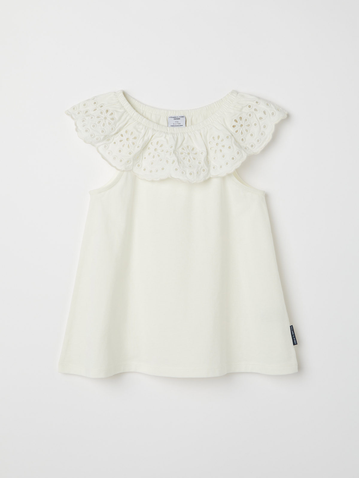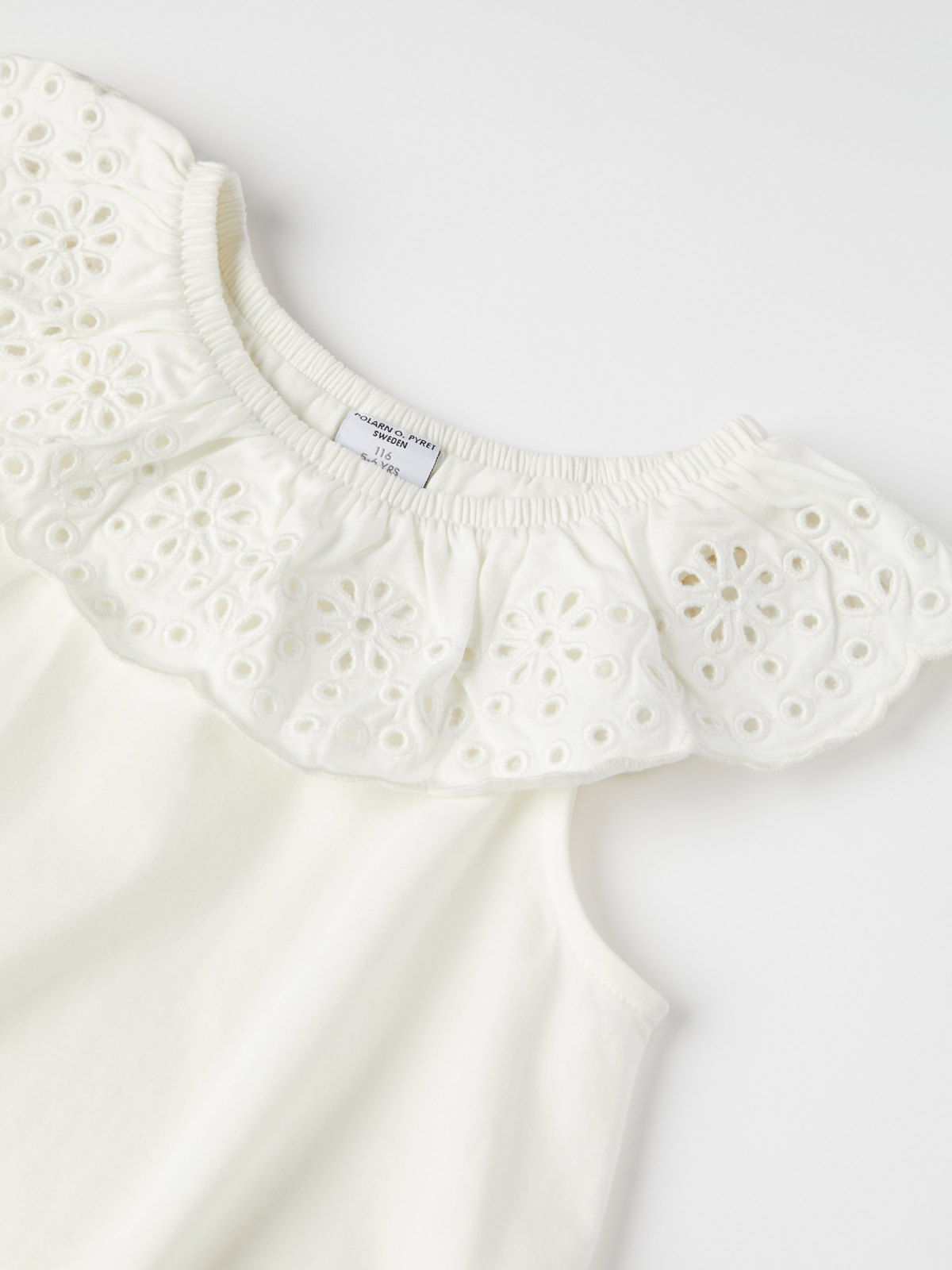 This A-line top has an elastic neckline with a fancy ruffle and embroidery.