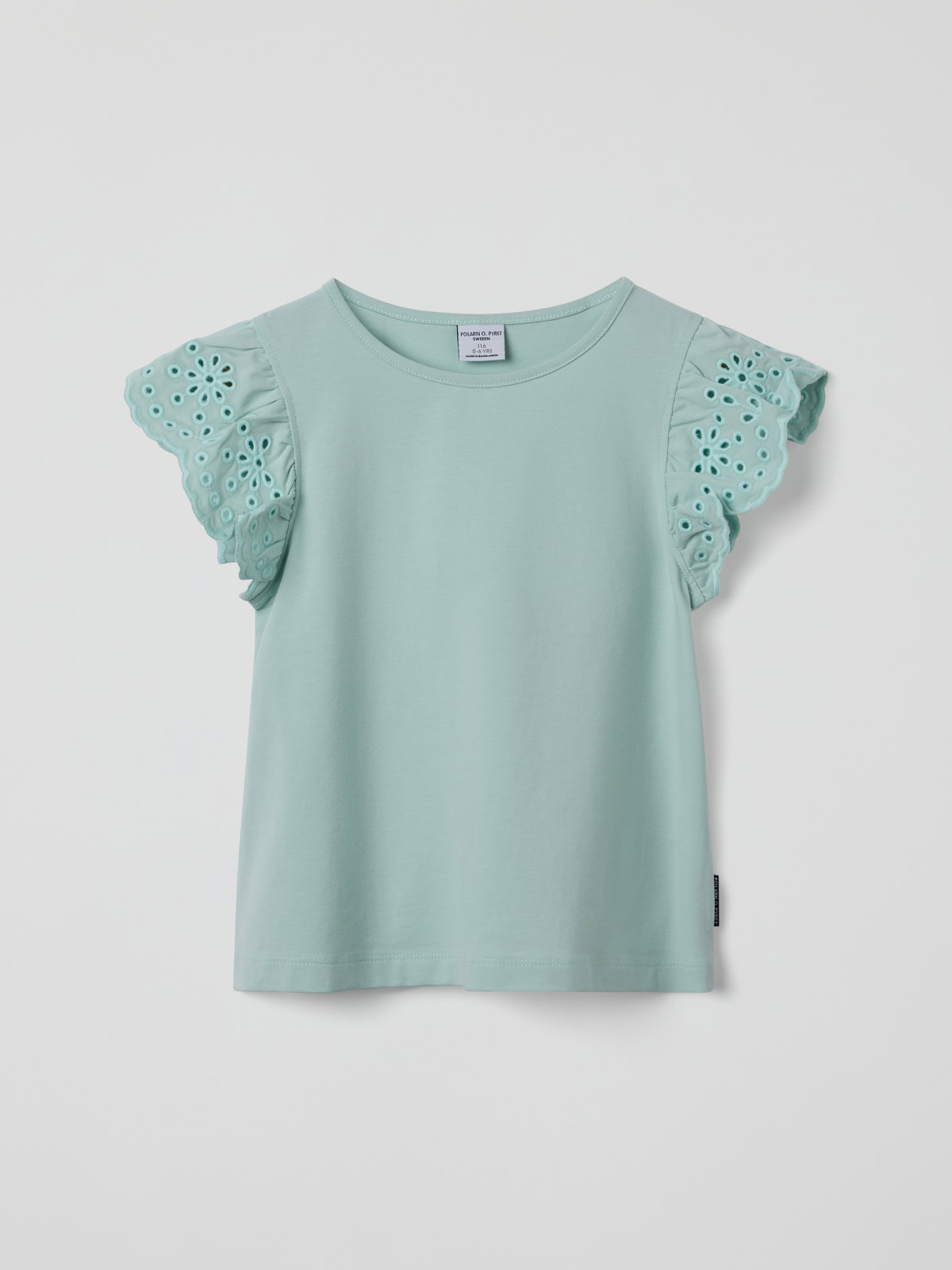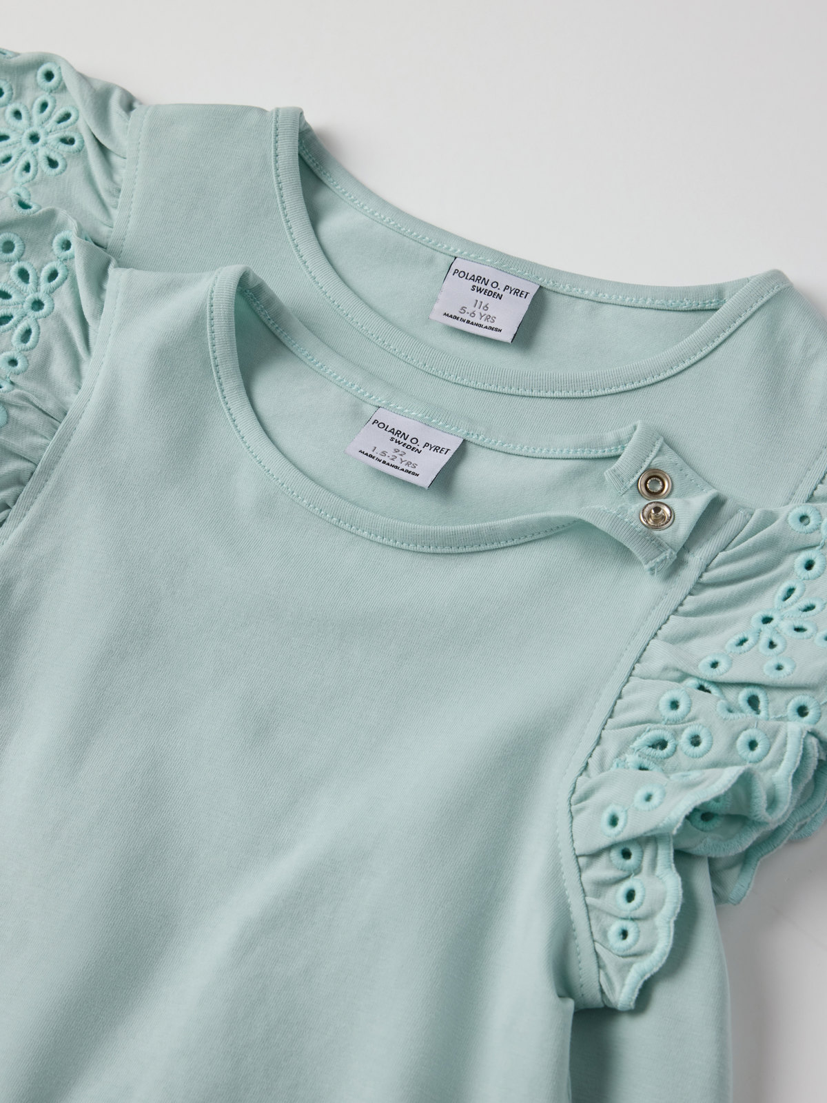 Cute top in soft organic cotton jersey with pretty lace sleeves and a wide hem – perfect for both everyday and party wear! The top is available in several different colors that match the entire collection.