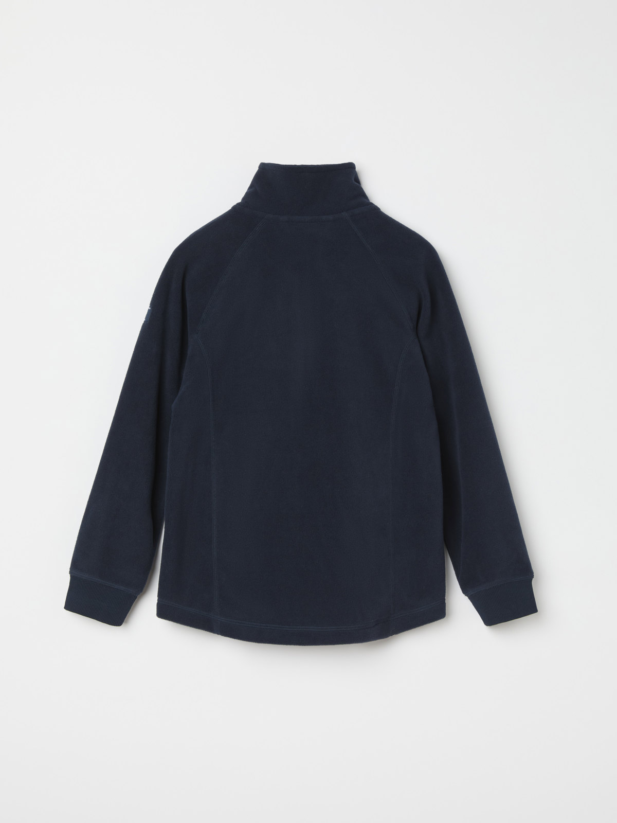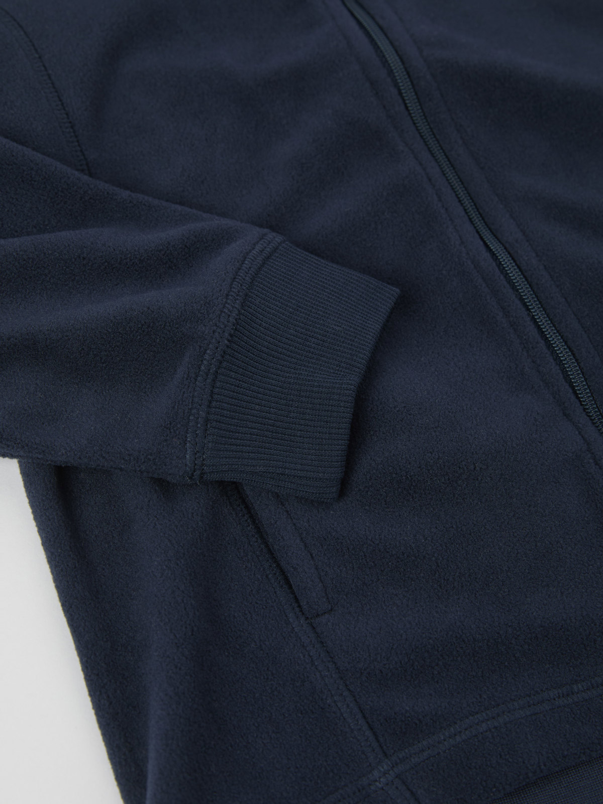 A jacket in soft and comfy fleece with side pockets and elastic cuffs. The jacket is made of recycled polyester, which wicks moisture, keeping the child warm and dry. The zipper has a chin guard that is gentle on the chin and cheeks.