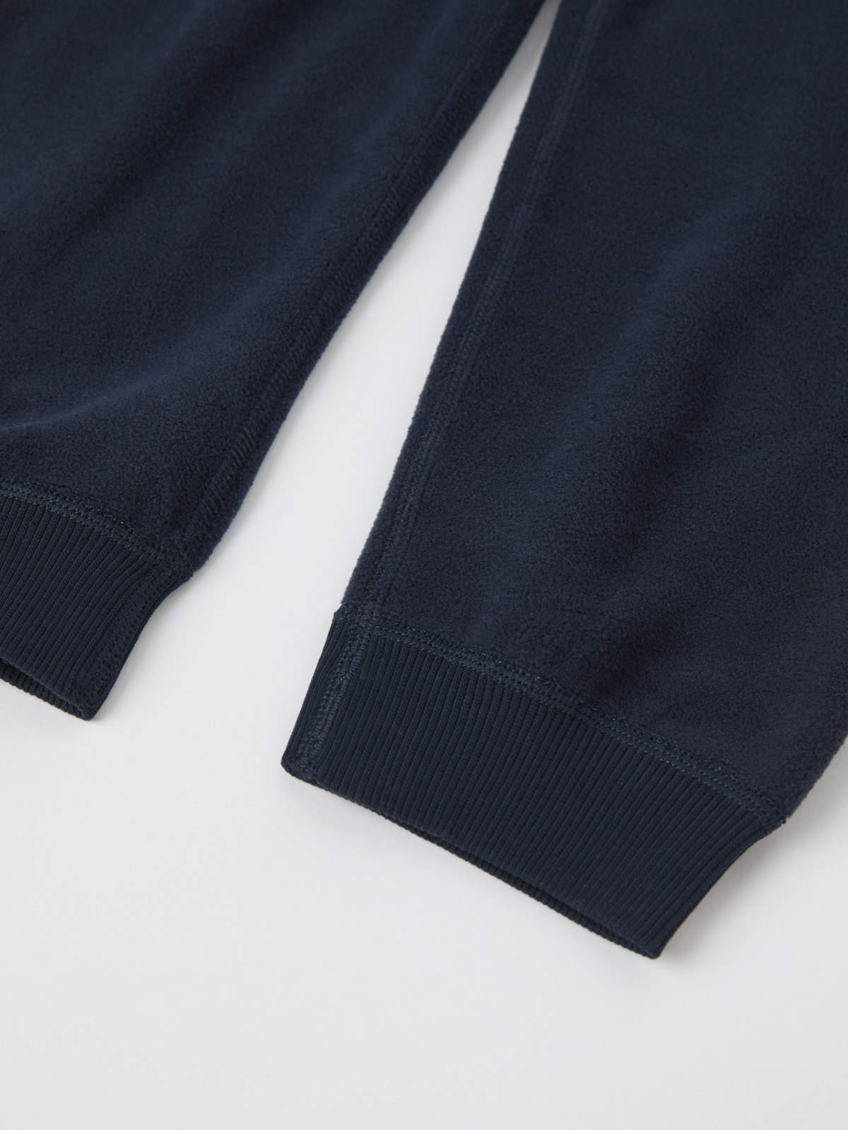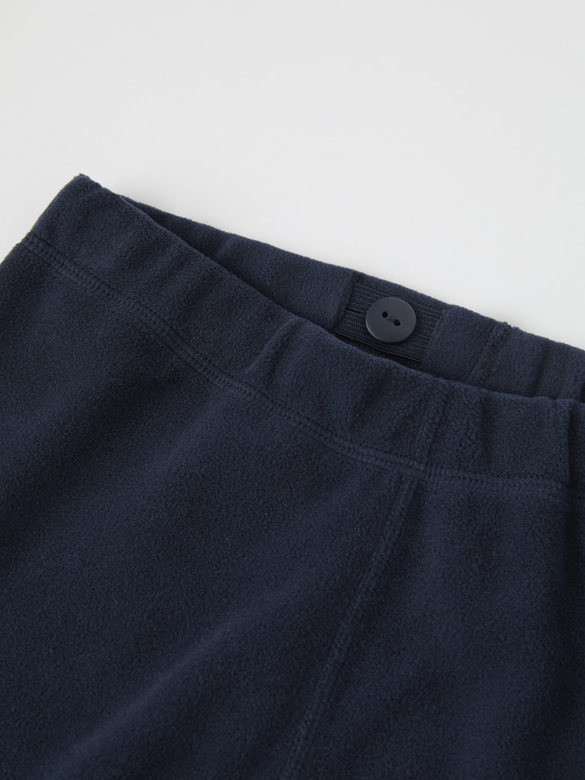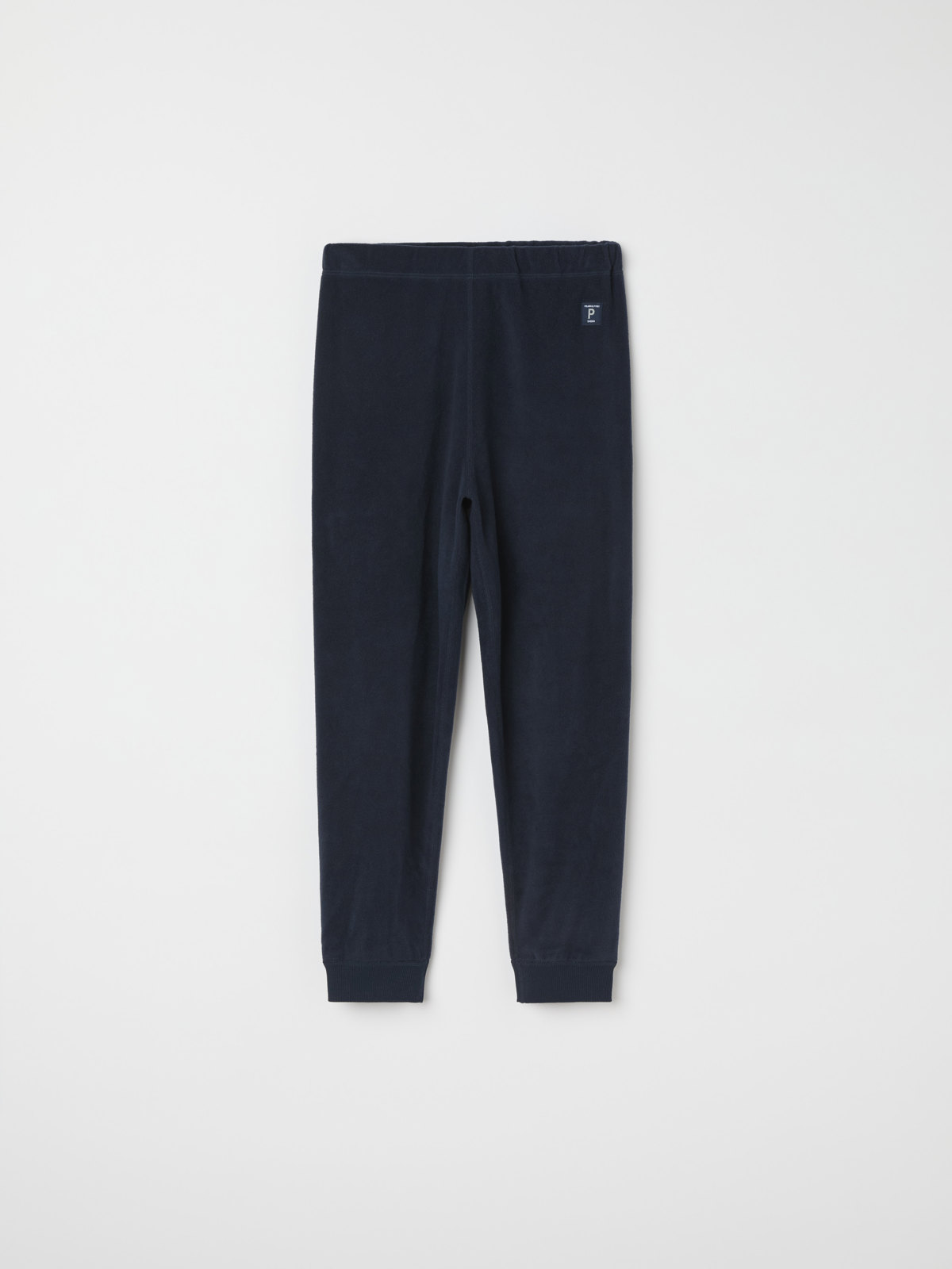 Solid color fleece pants in soft, recycled polyester that wicks moisture, keeping the child warm and dry. The pants feature an elastic waist that is adjusted with buttonhole elastic, and soft ankle cuffs.