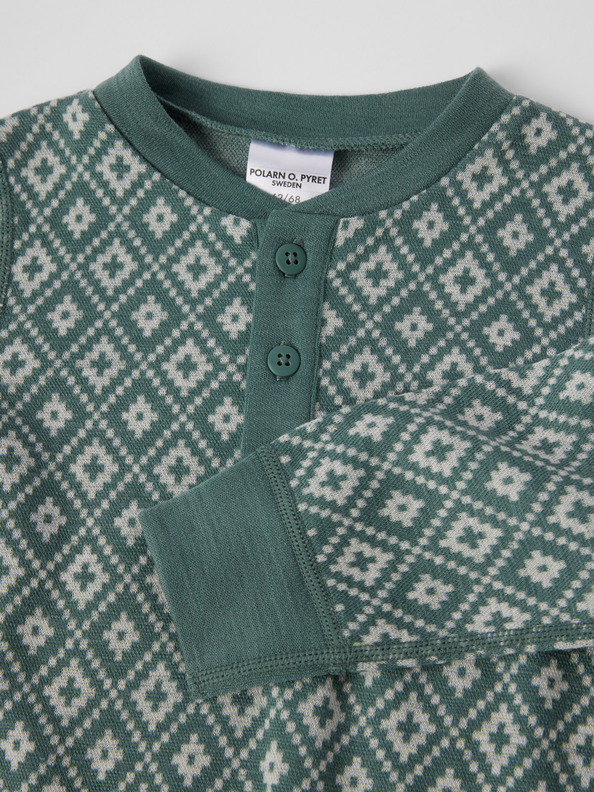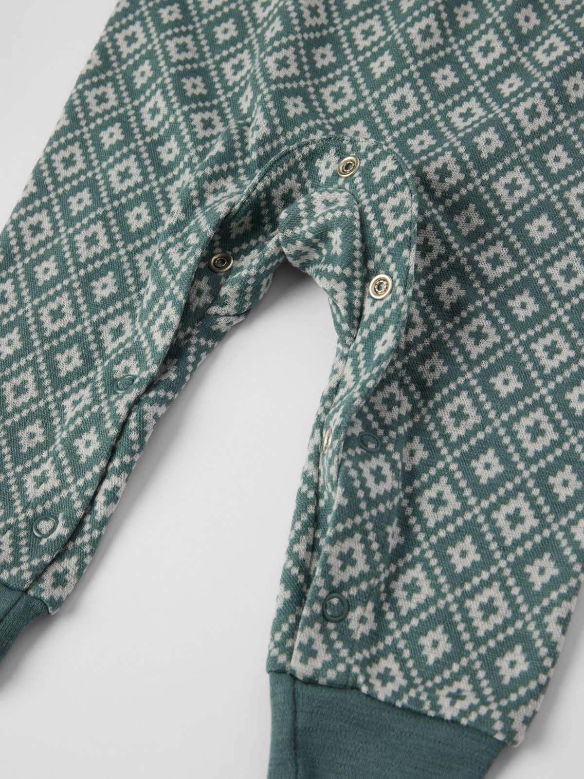 Jacquard patterned overall in soft and warming merino wool – perfect as a base layer under outerwear! Merino wool retains warmth even when wet and helps regulate body temperature. It's also incredibly soft against the skin. The overall has ribbed cuffs at the neckline, sleeves, and leg ends and closes with a front button placket.