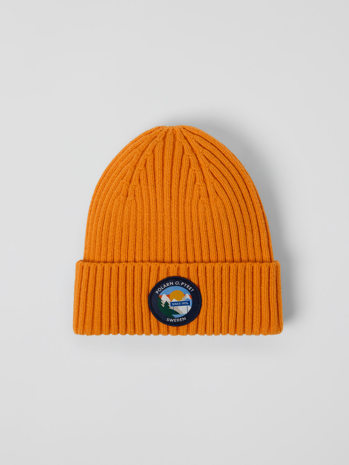 Ribbed hat in a warm wool blend. The beanie has a soft turn-up with a pretty appliqué on the front.