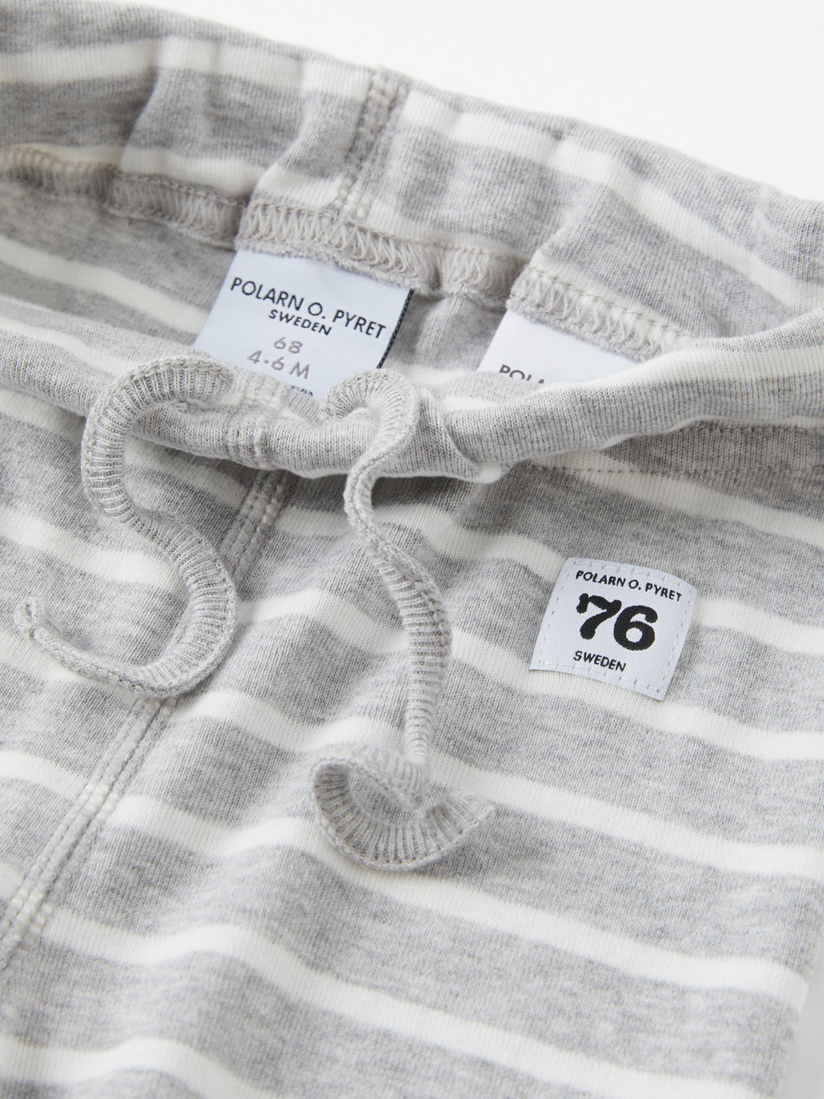 Striped pants in 100% organic cotton for baby. The pants feature our classic stripes and an elastic waist that can be adjusted with drawstring. The pants also have soft, elastic ankle cuffs.