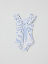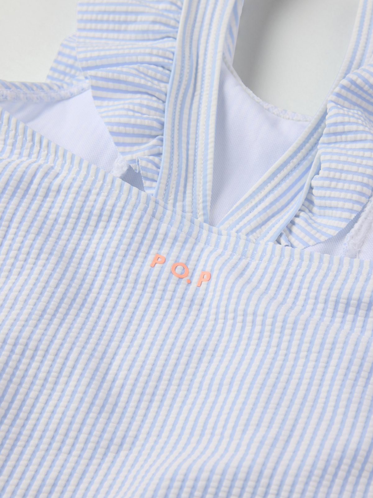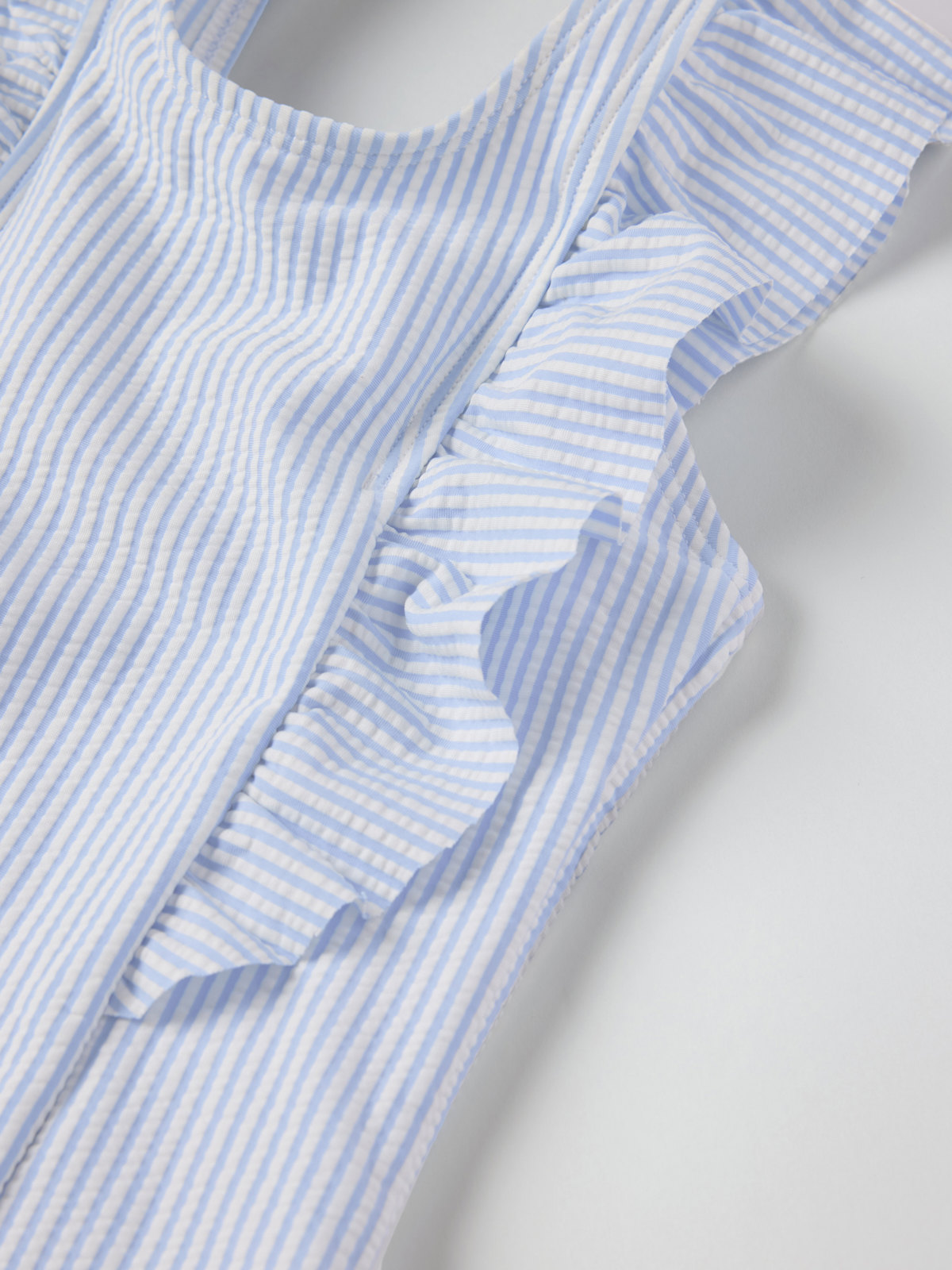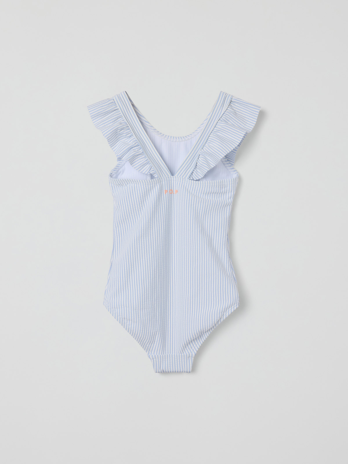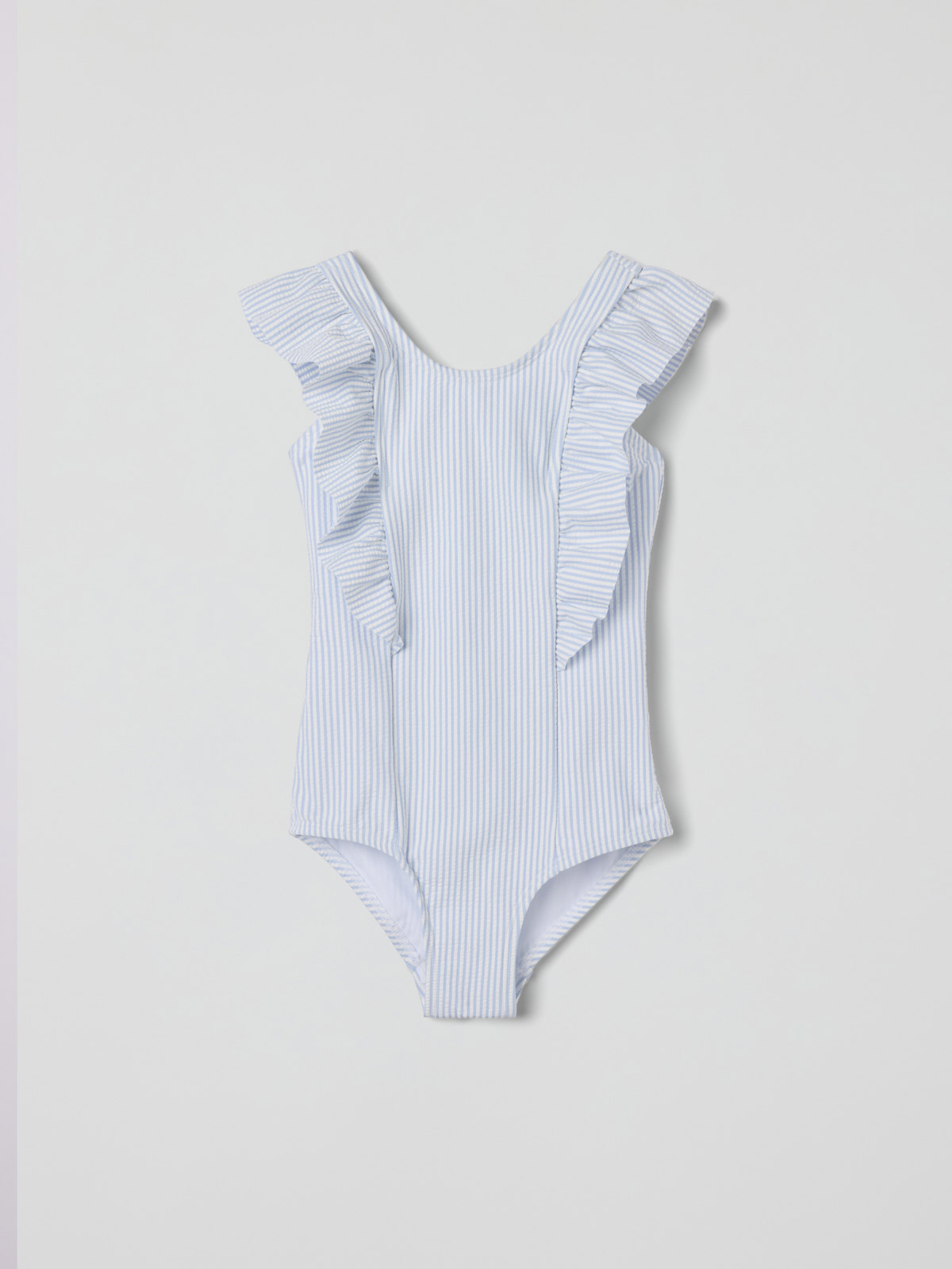Striped swimsuit in soft and stretchy fabric made from recycled polyester and polyamide. The swimsuit is fully lined and has wide shoulder straps with cute ruffles over the shoulders.