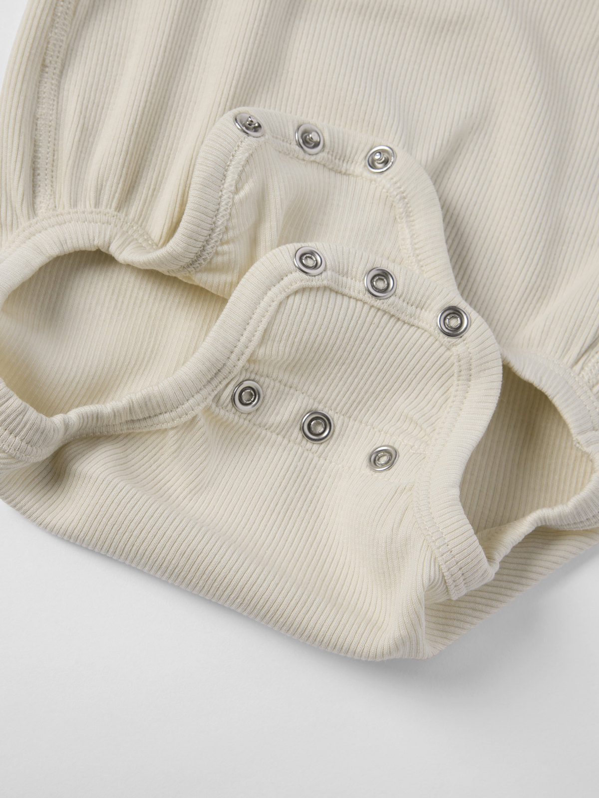 Popper fastening at the crotch for quick nappy changes.