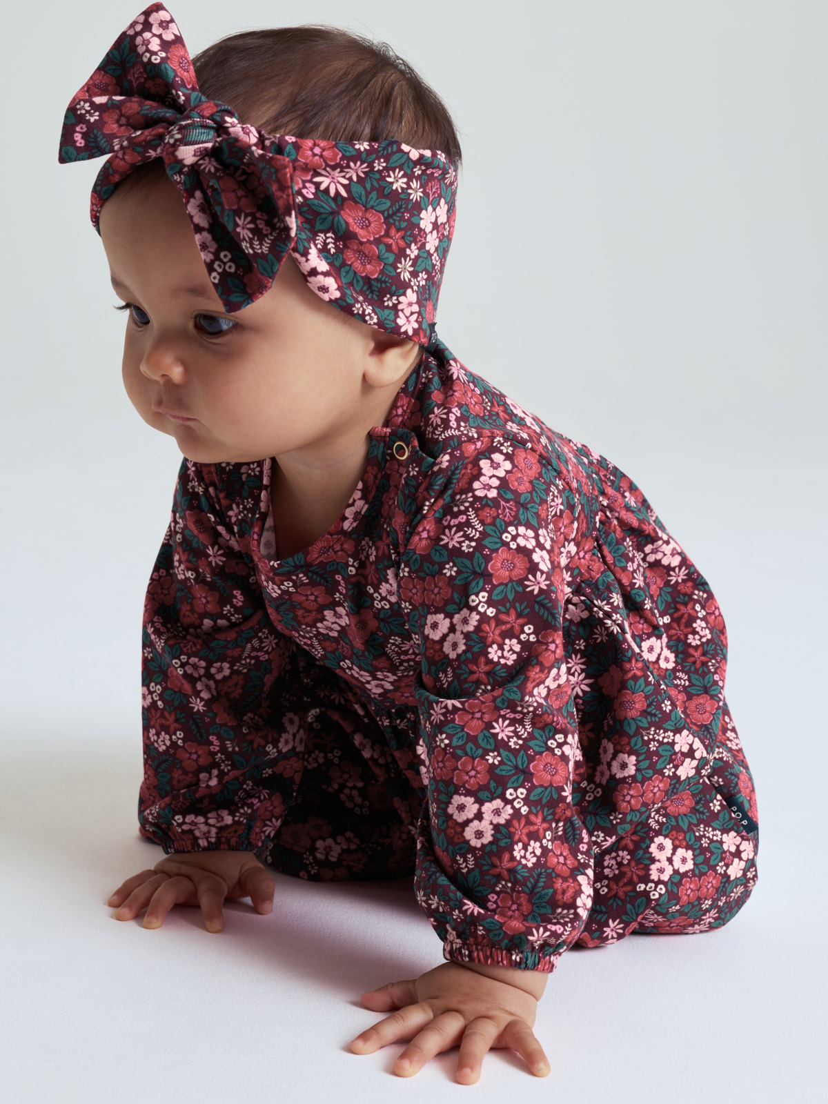 Elastic headband in soft, organic cotton jersey. The headband features an allover print of small hearts and a fancy bow.