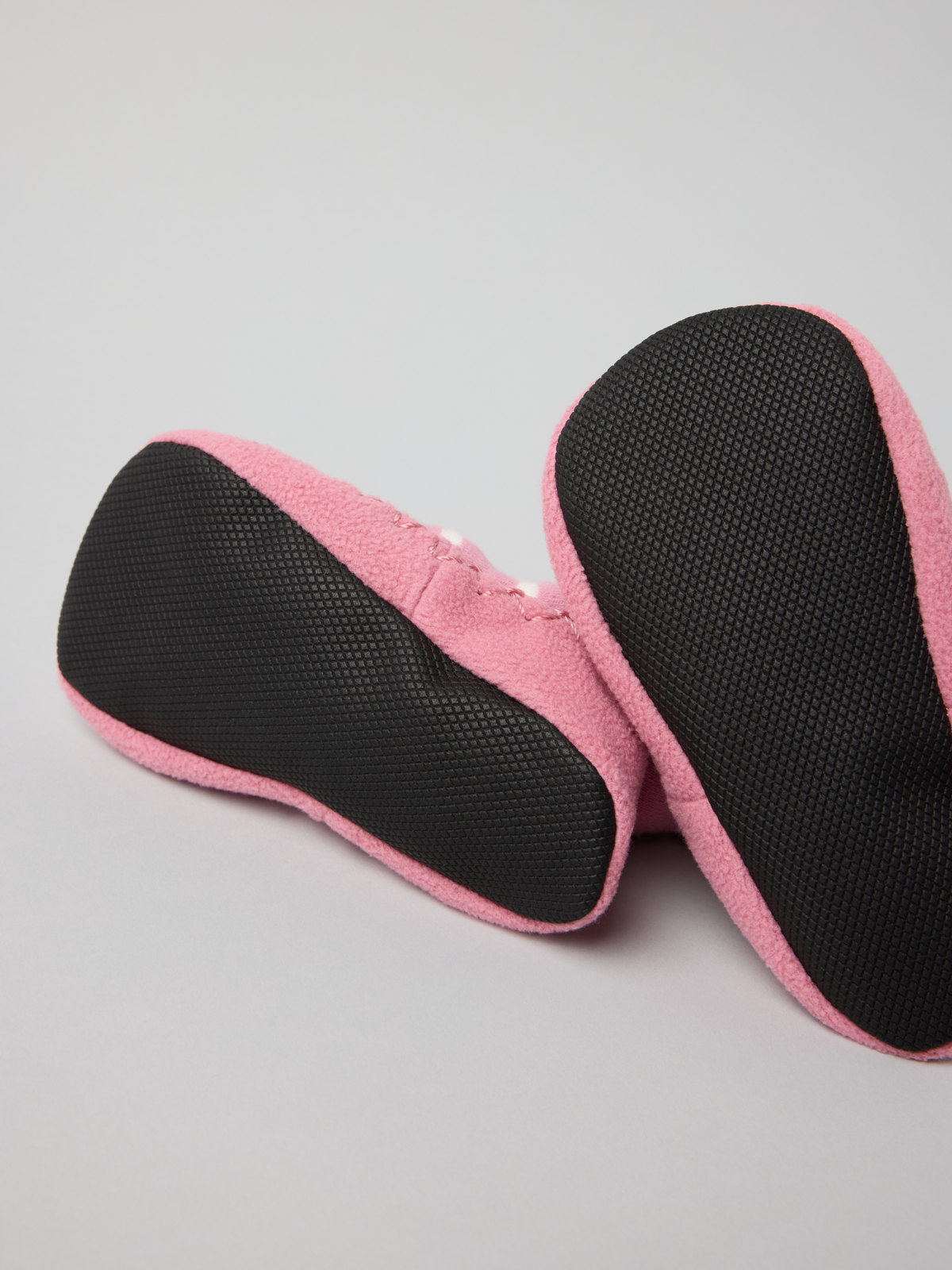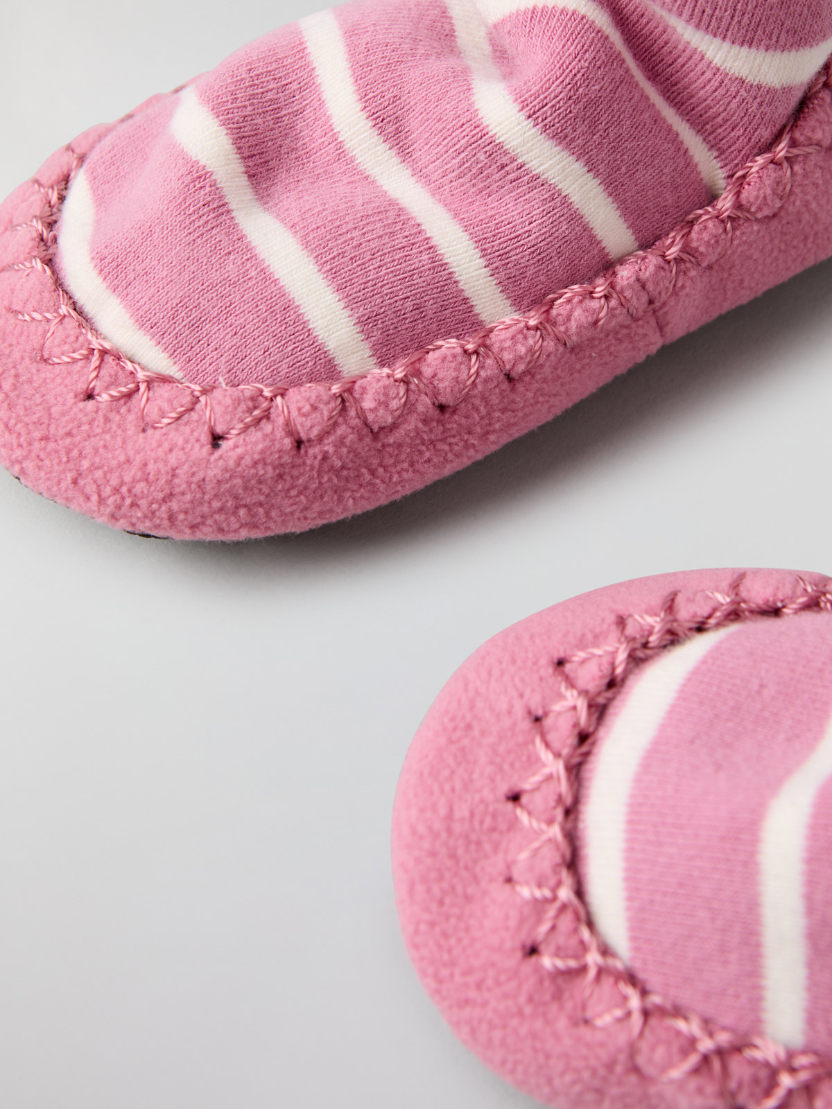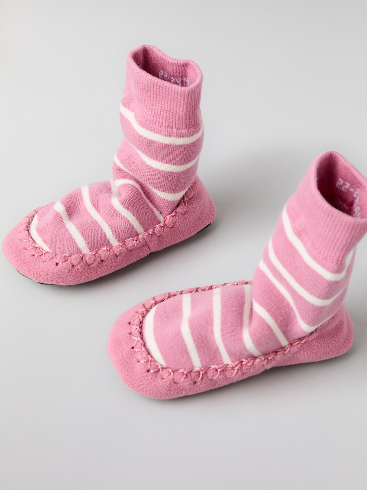 The moccasin has a grip sole made of durable fabric, and a soft fleece trim. The upper is made of jersey for a comfy fit and to facilitate dressing.