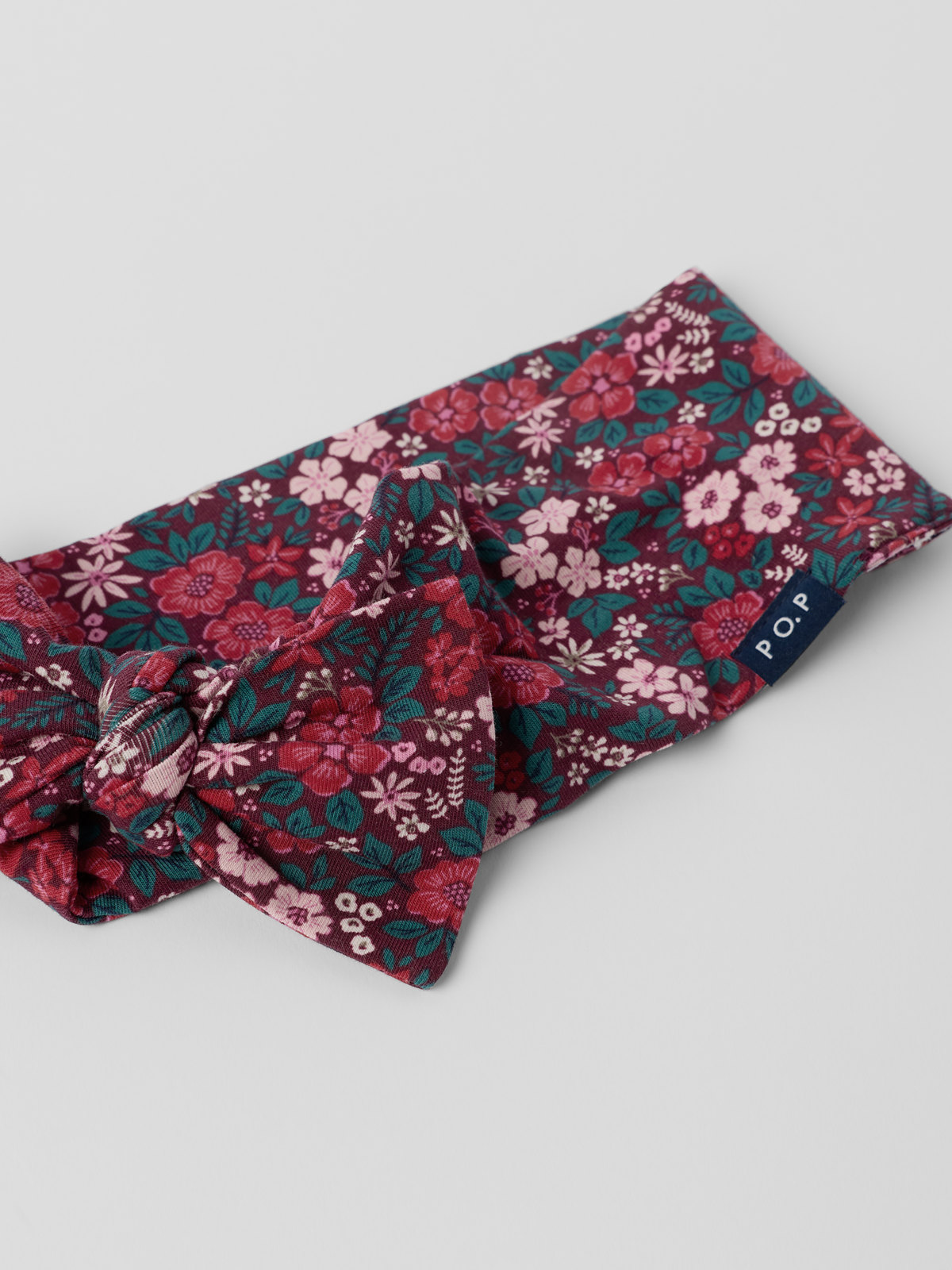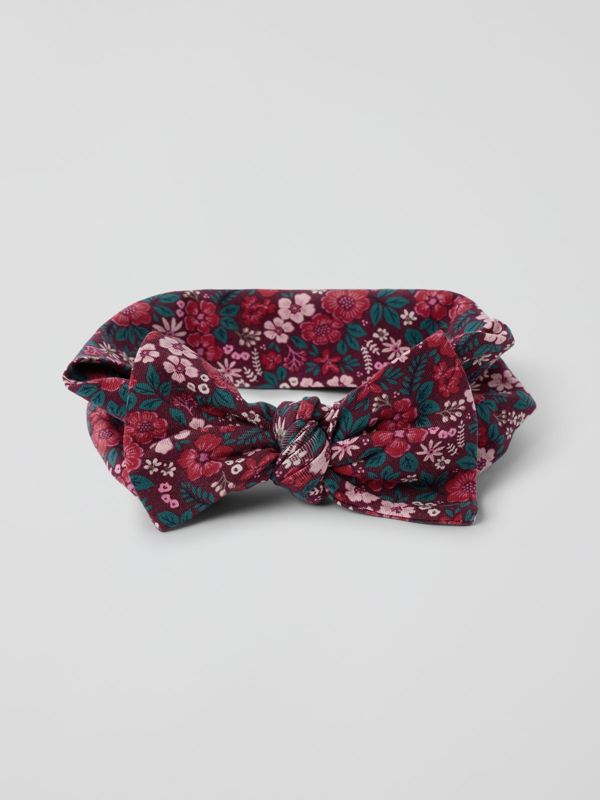 Elastic headband in soft, organic cotton jersey. The headband features an allover print of small hearts and a fancy bow.