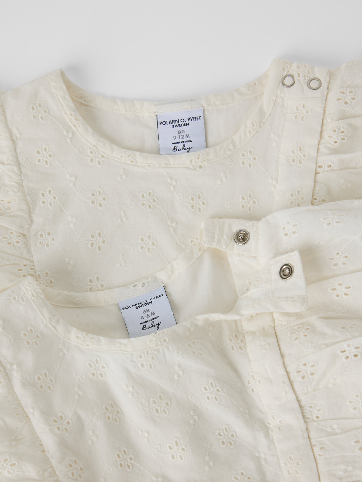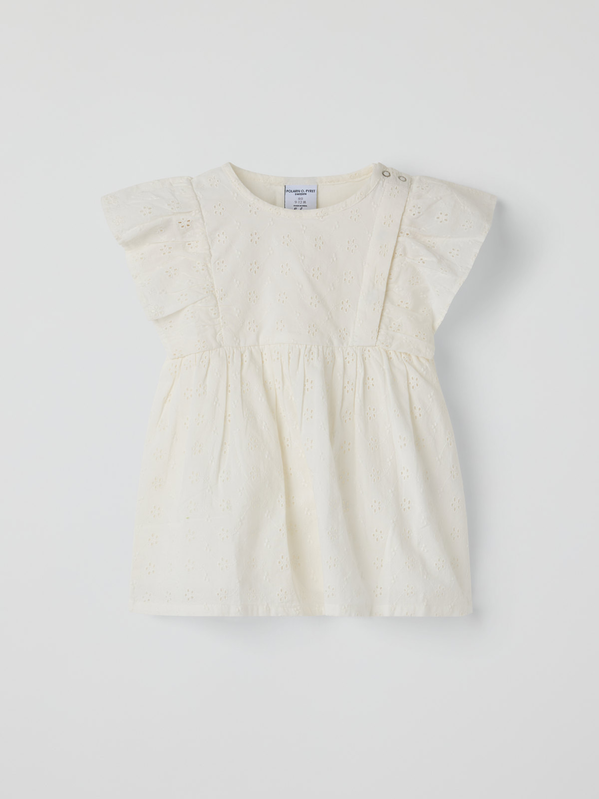 Adorable dress in soft muslin made from 100% organic cotton for baby – a must-have for summer celebrations! The dress features gentle frills over the shoulders and beautiful embroidery on the chest. Practical press studs on one shoulder make changing easy.