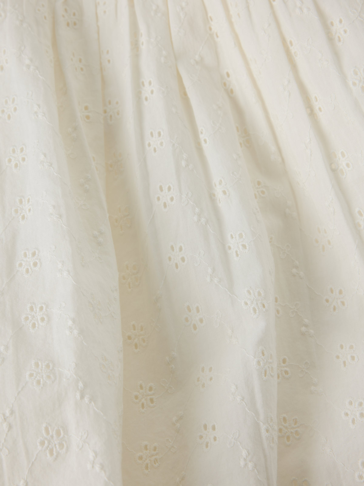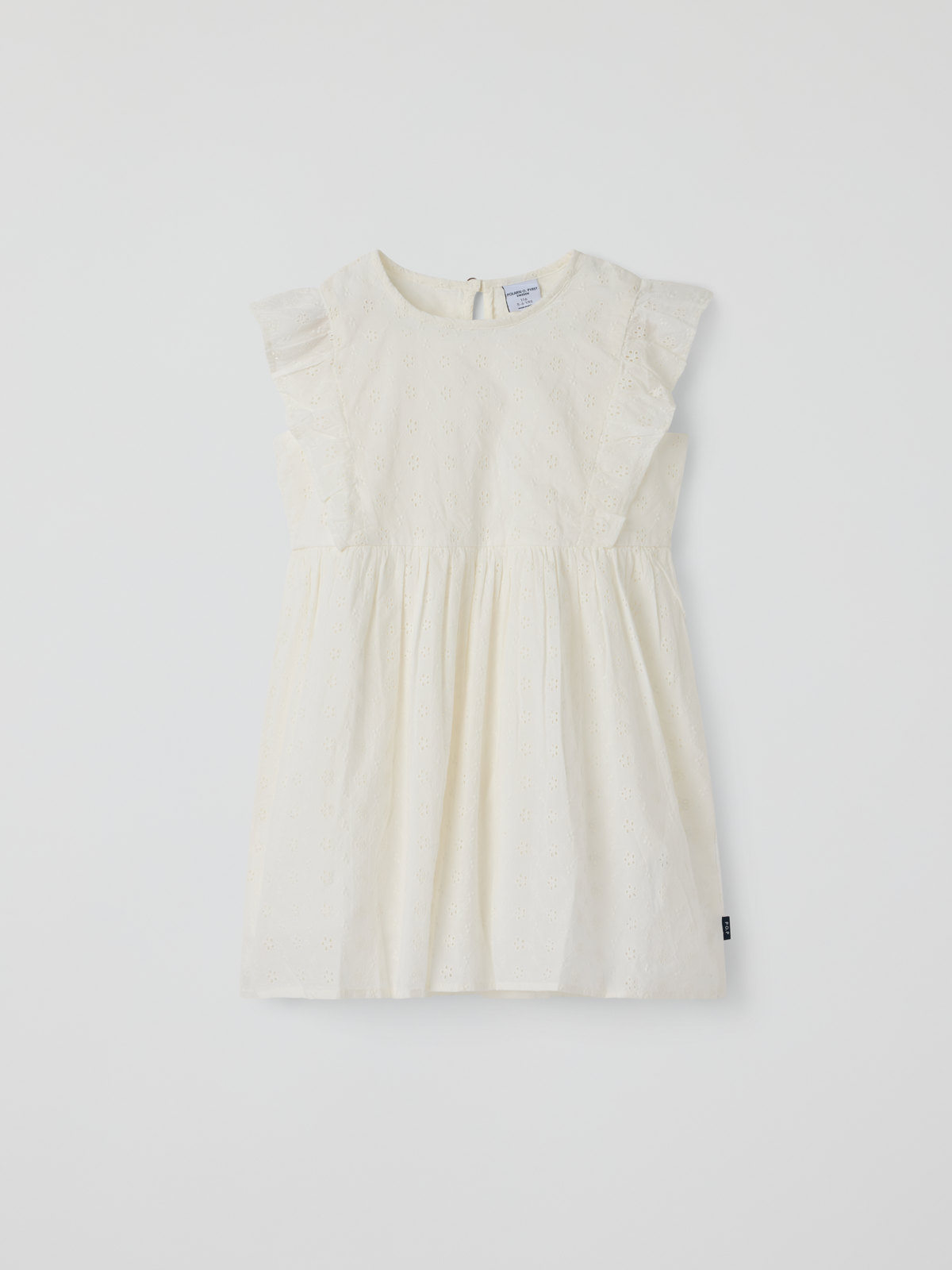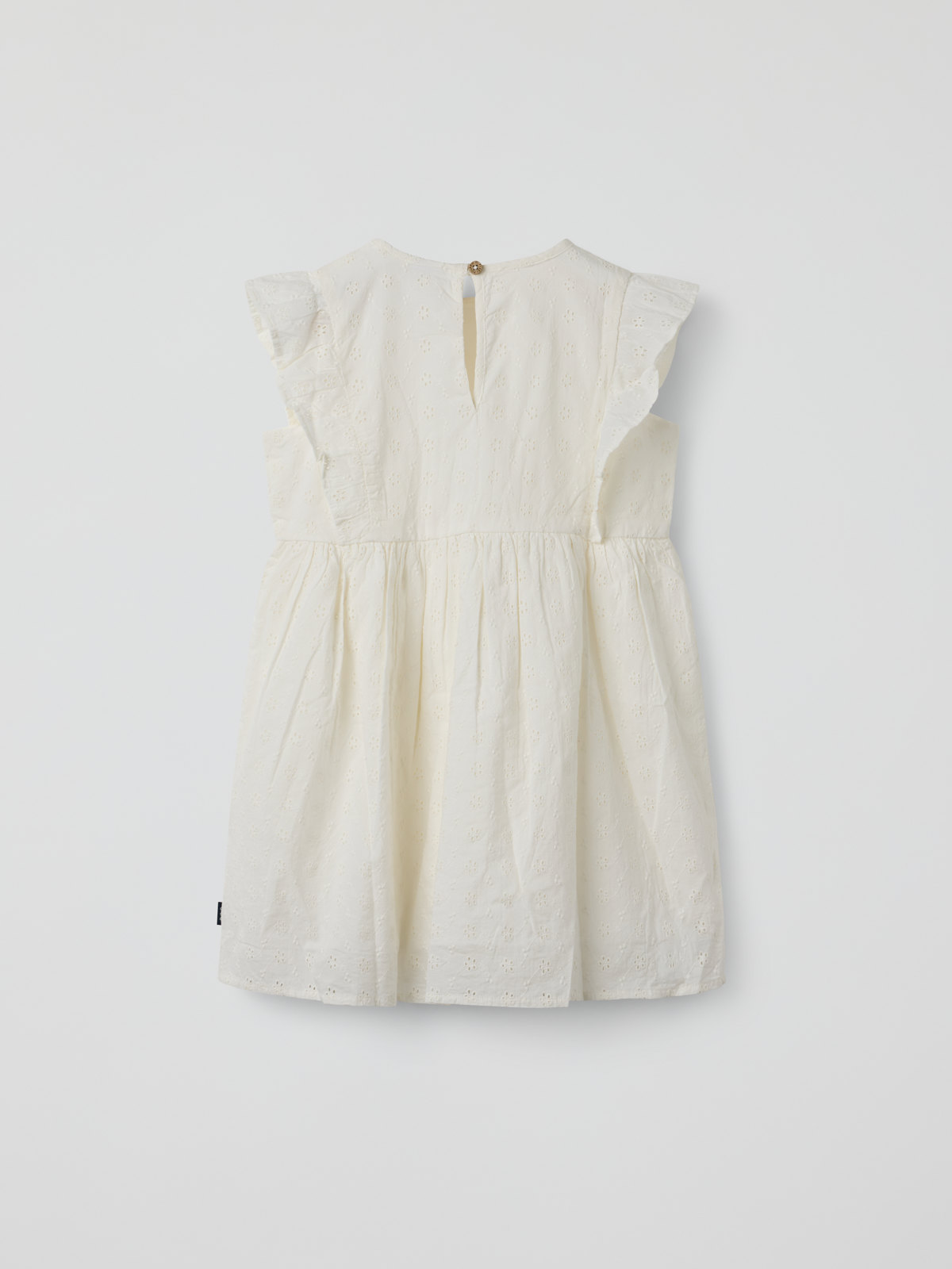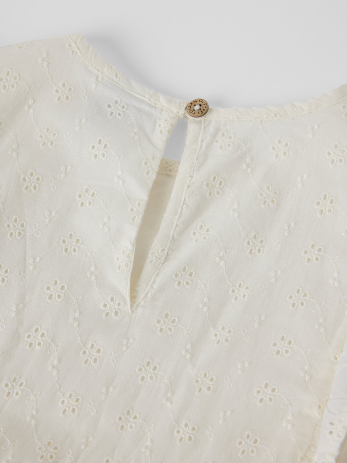 Adorable dress in soft muslin made from 100% organic cotton – a must-have for summer celebrations! The dress features gentle frills over the shoulders and beautiful embroidery on the chest. Fastens with a button at the back. Perfect for sibling matching!