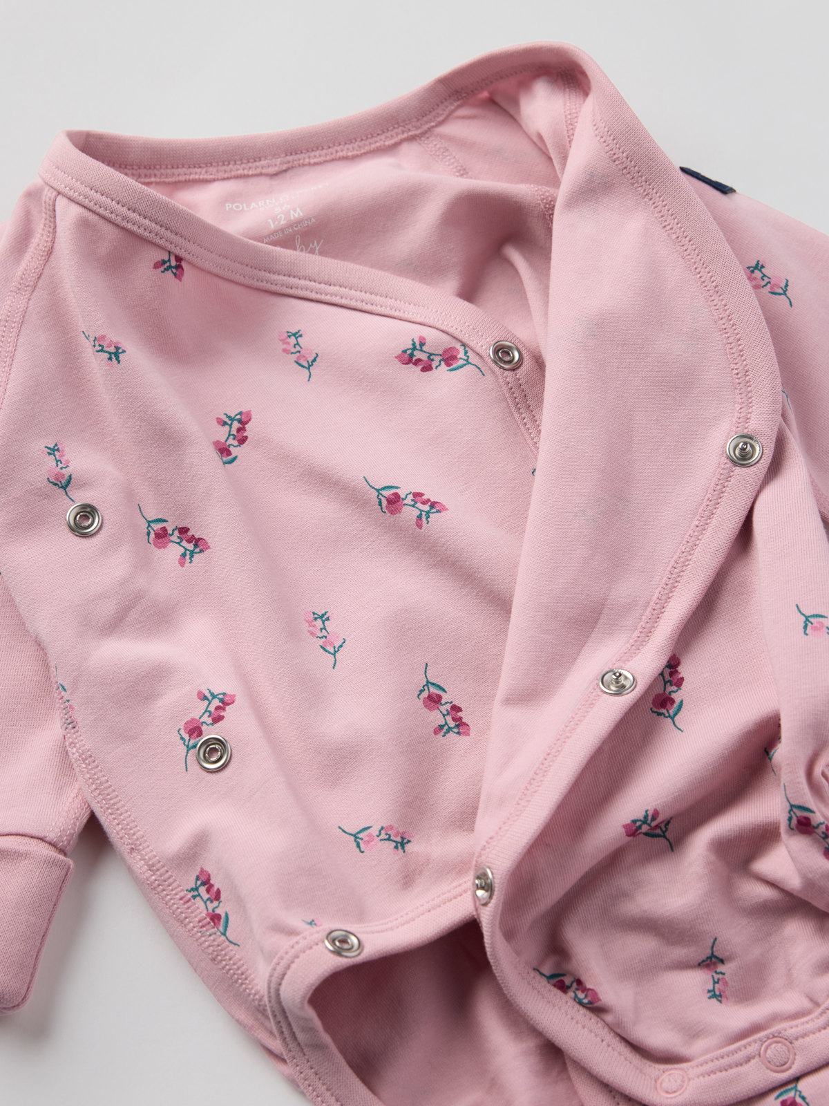 Wraparound babygrow in 100% organic cotton. Thanks to the clever solution featuring an extra row of snaps at the crotch and fold-down cuffs, this babygrow can grow with your little one.