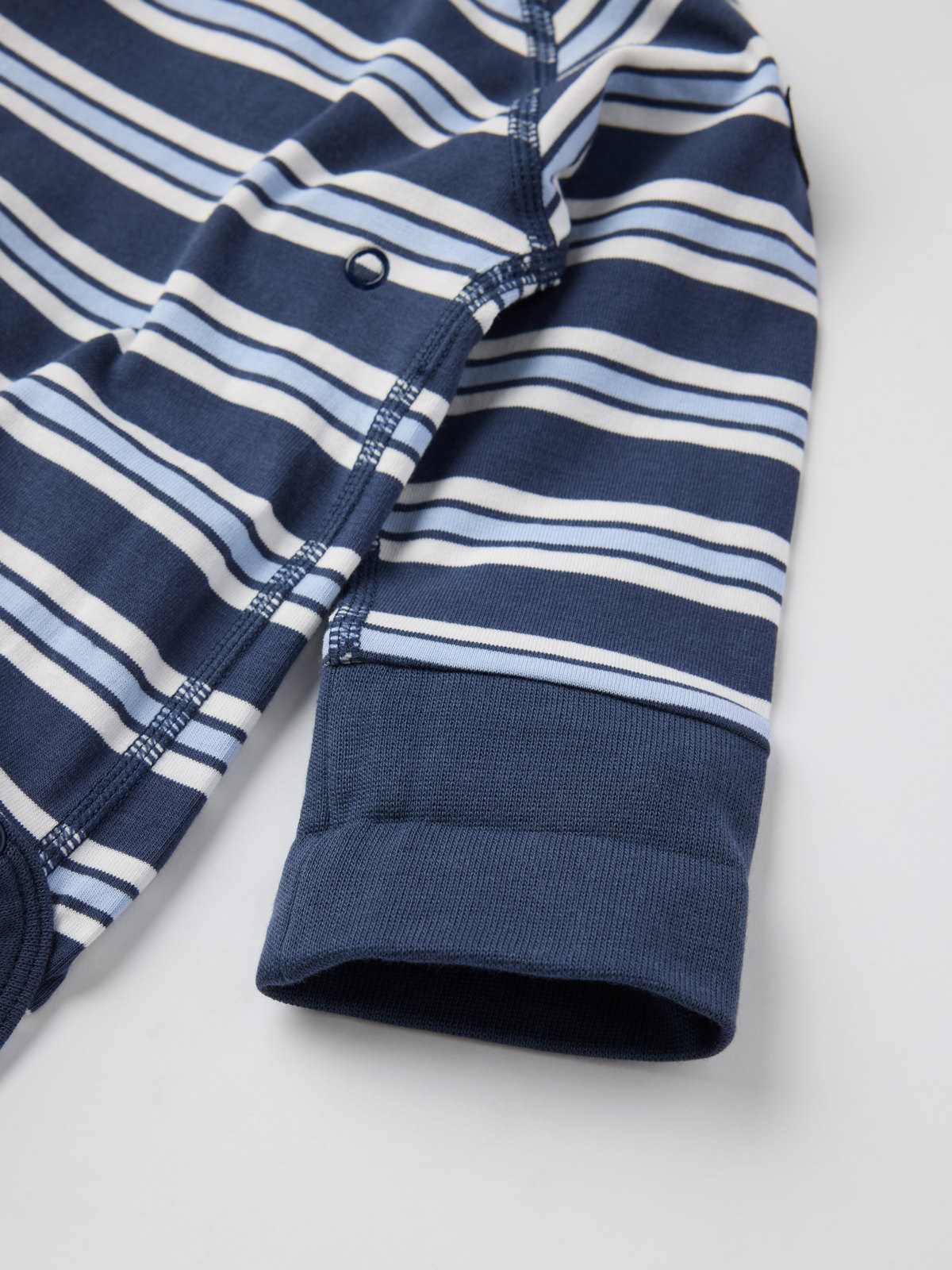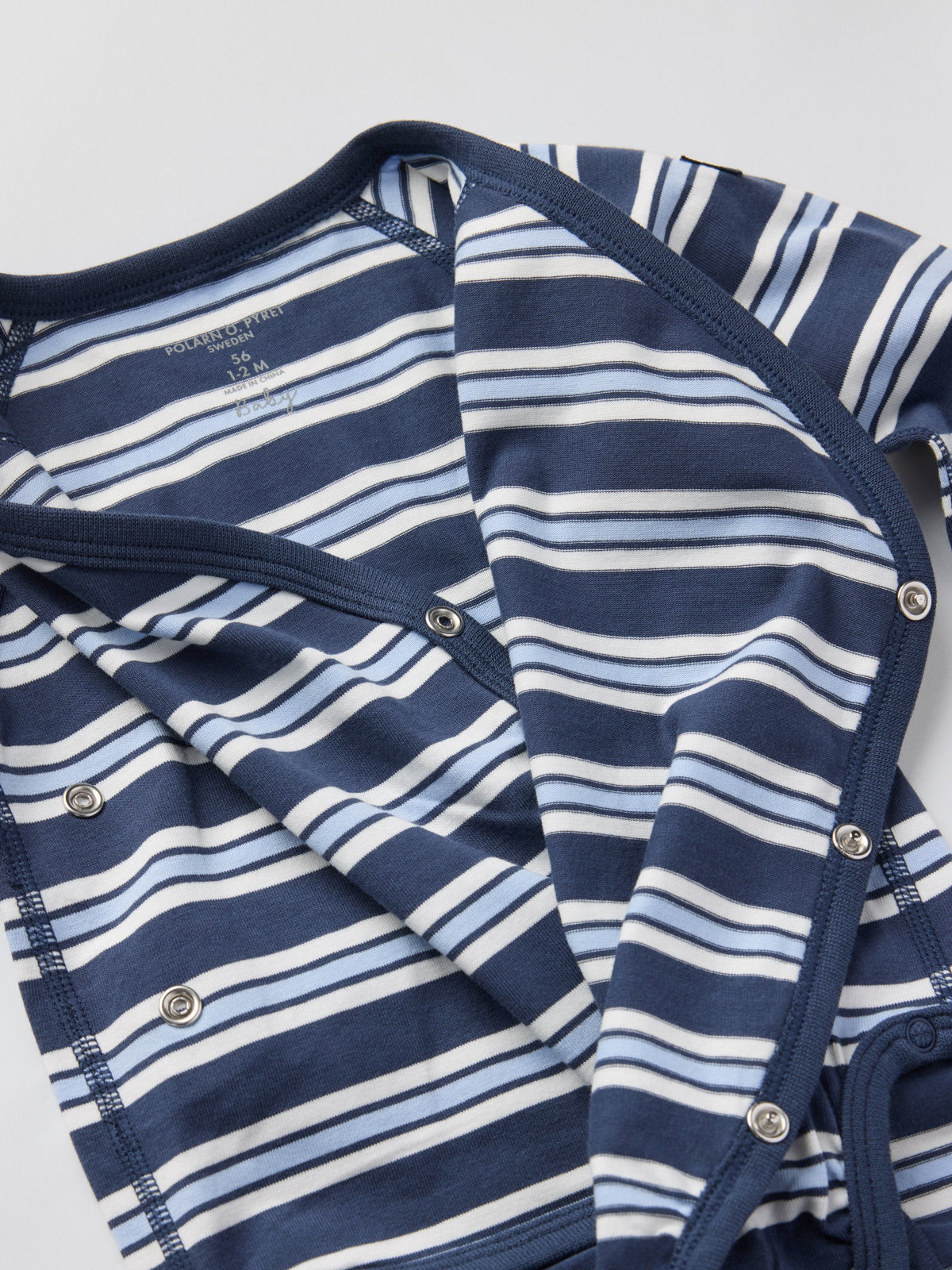 Striped wraparound babygrow in 100% organic cotton. Thanks to the clever solution featuring an extra row of snaps at the crotch and fold-down cuffs, this babygrow can grow with your little one.