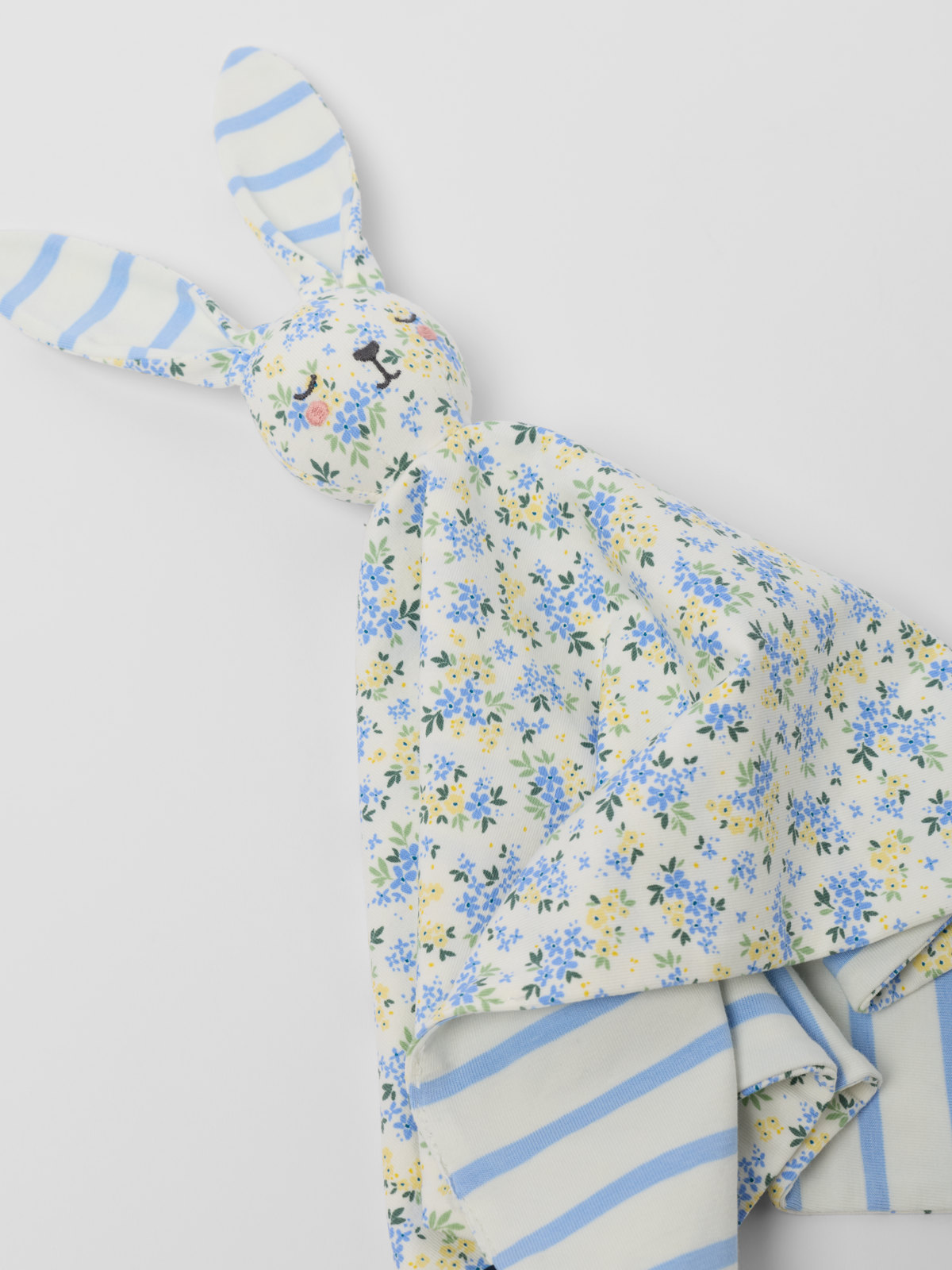 Soft comfort blanket made from organic cotton, gentle on delicate skin – ideal for the pram, cot or when travelling. Features a padded little bunny head with long ears. Pair with the matching blanket, sun hat, dress and jumpsuit. A lovely gift idea! Size: 20 x 20 cm. snuttefilt kanin