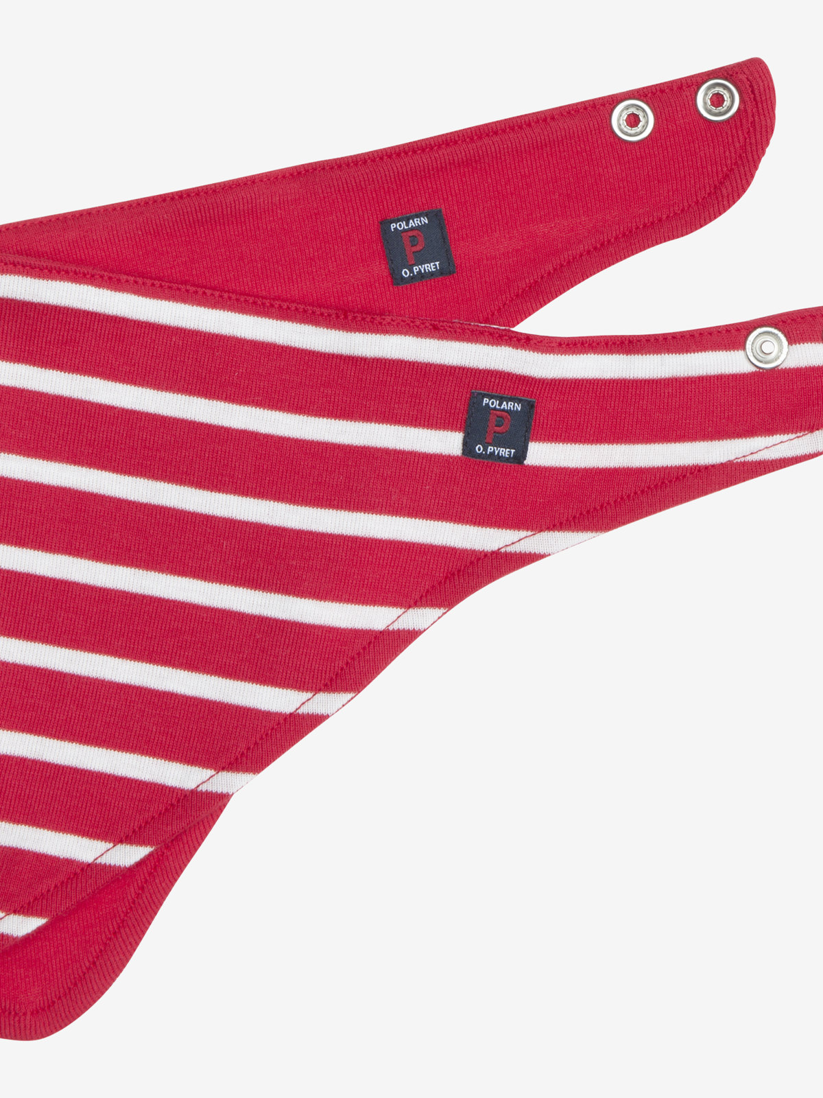 Double-sided dribble bib in soft tricot for baby. The dribble bib protects clothing and is made of 100% organic cotton. One side features our classic stripes, while the other is solid color. The neck size can be adjusted with snaps.