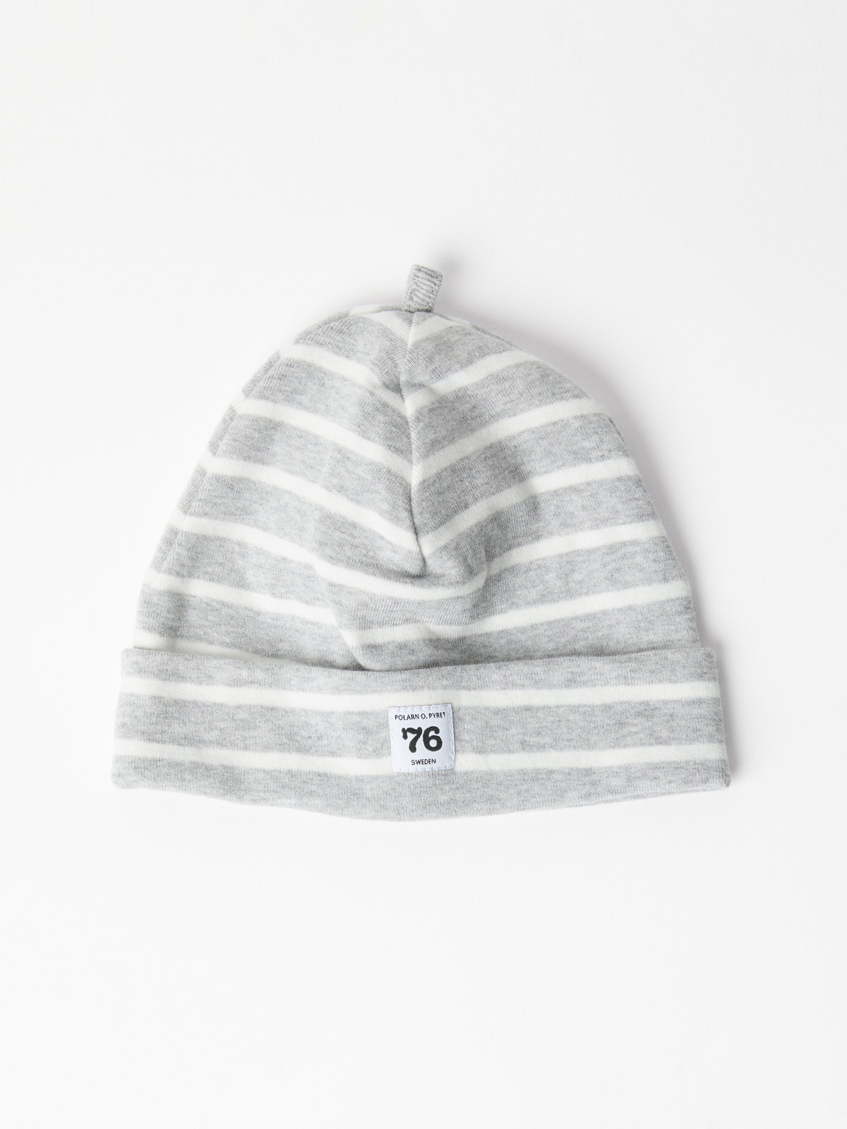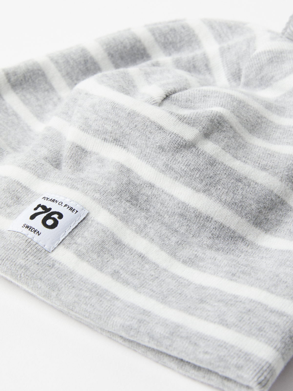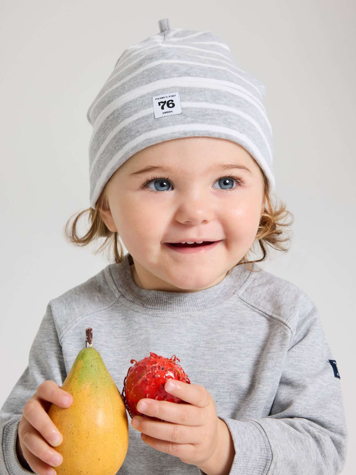 A striped beanie in 100% organic cotton. The beanie features our classic stripes and a fold-up brim that can be adjusted to the head size.