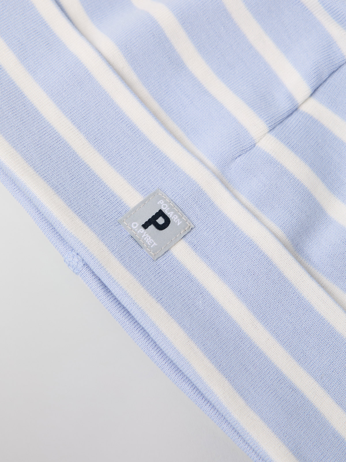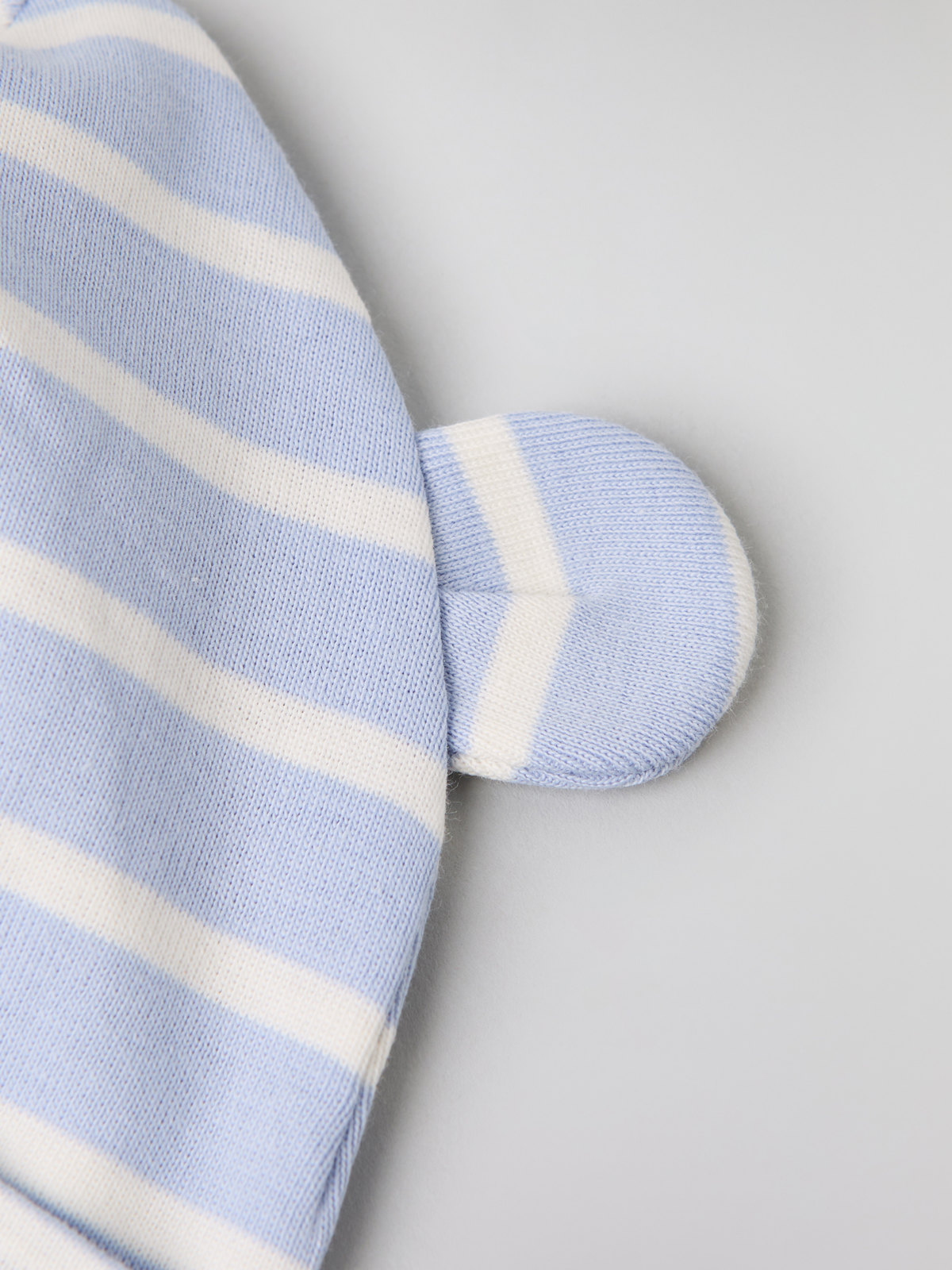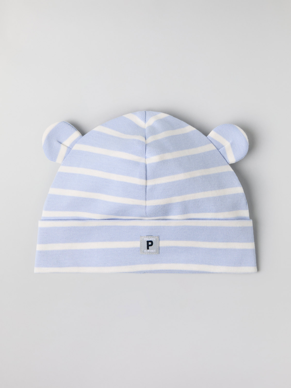 Striped beanie in 100% organic cotton jersey for baby. The beanie is adorned with ears and has a foldup brim that can be adjusted to fit the child’s head.
