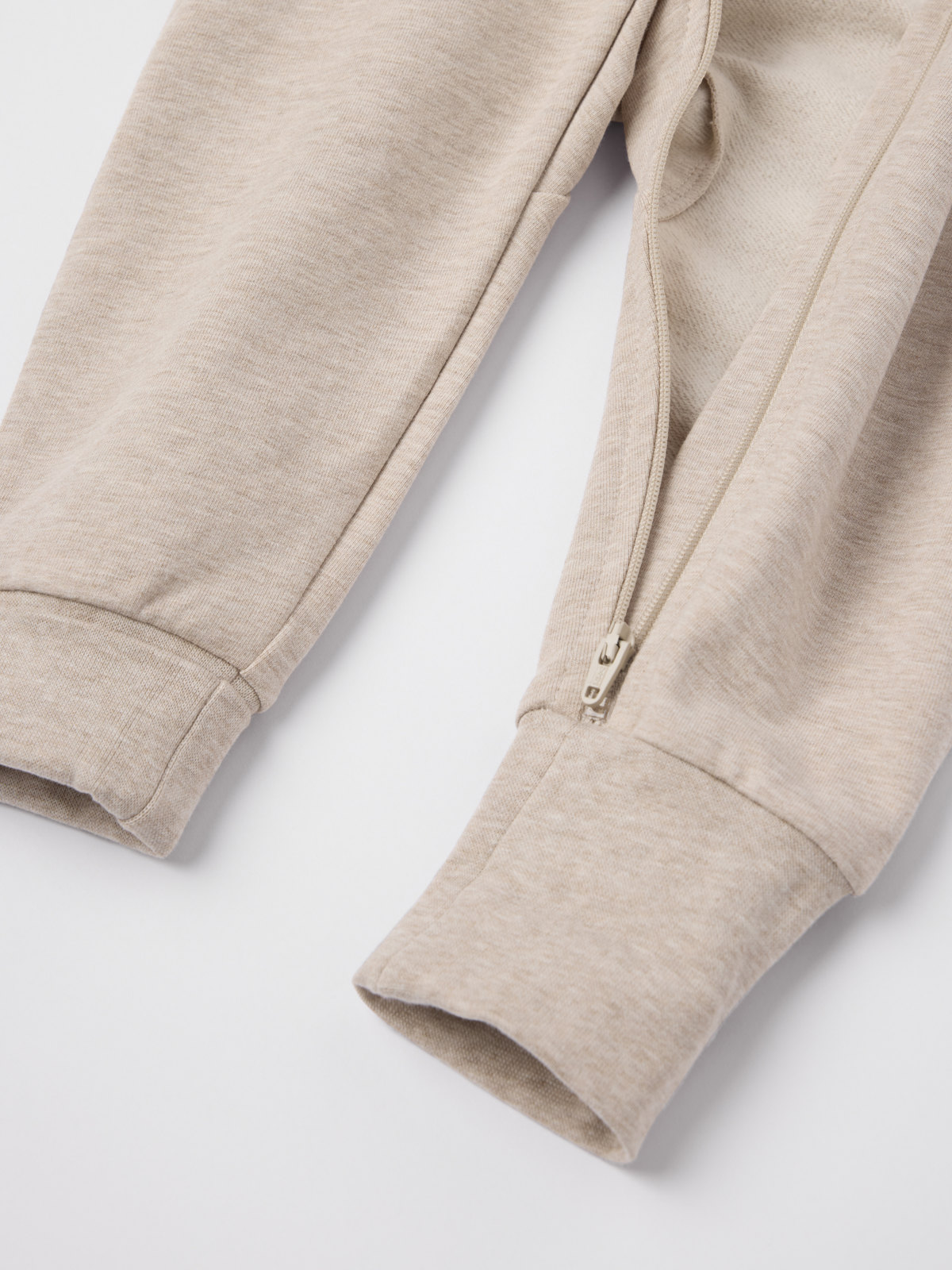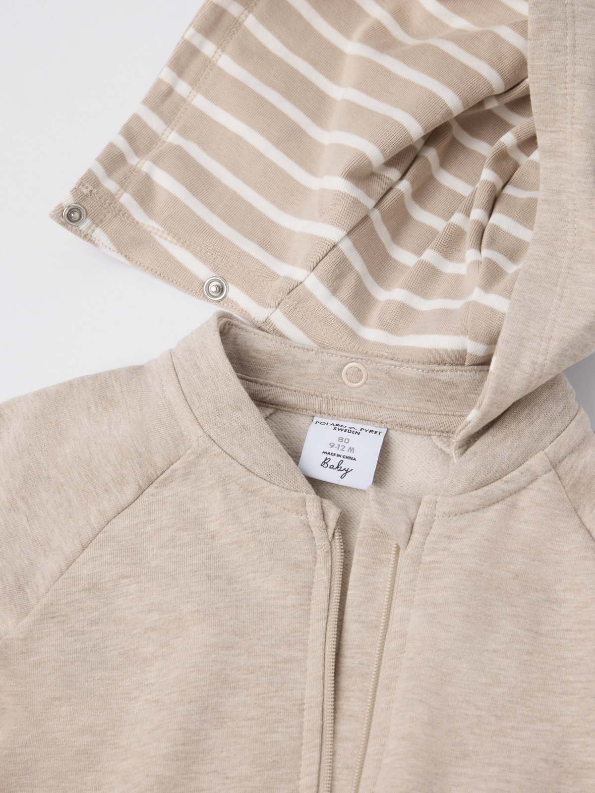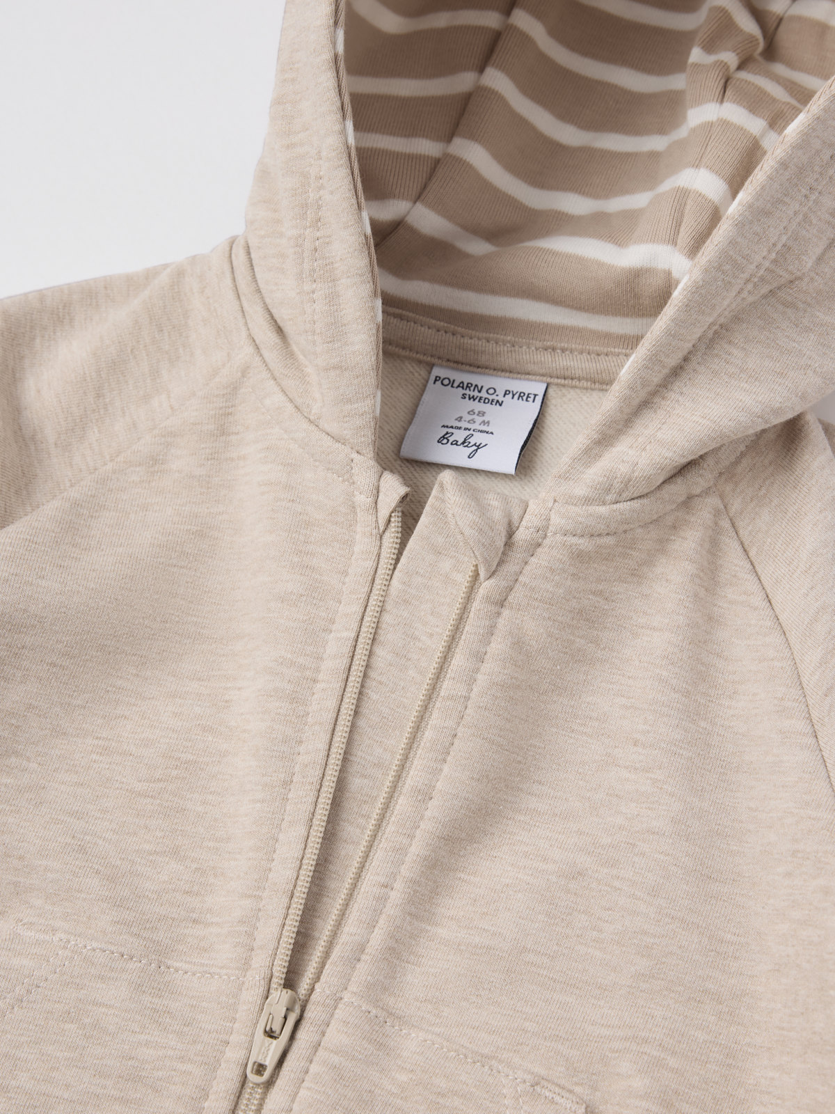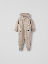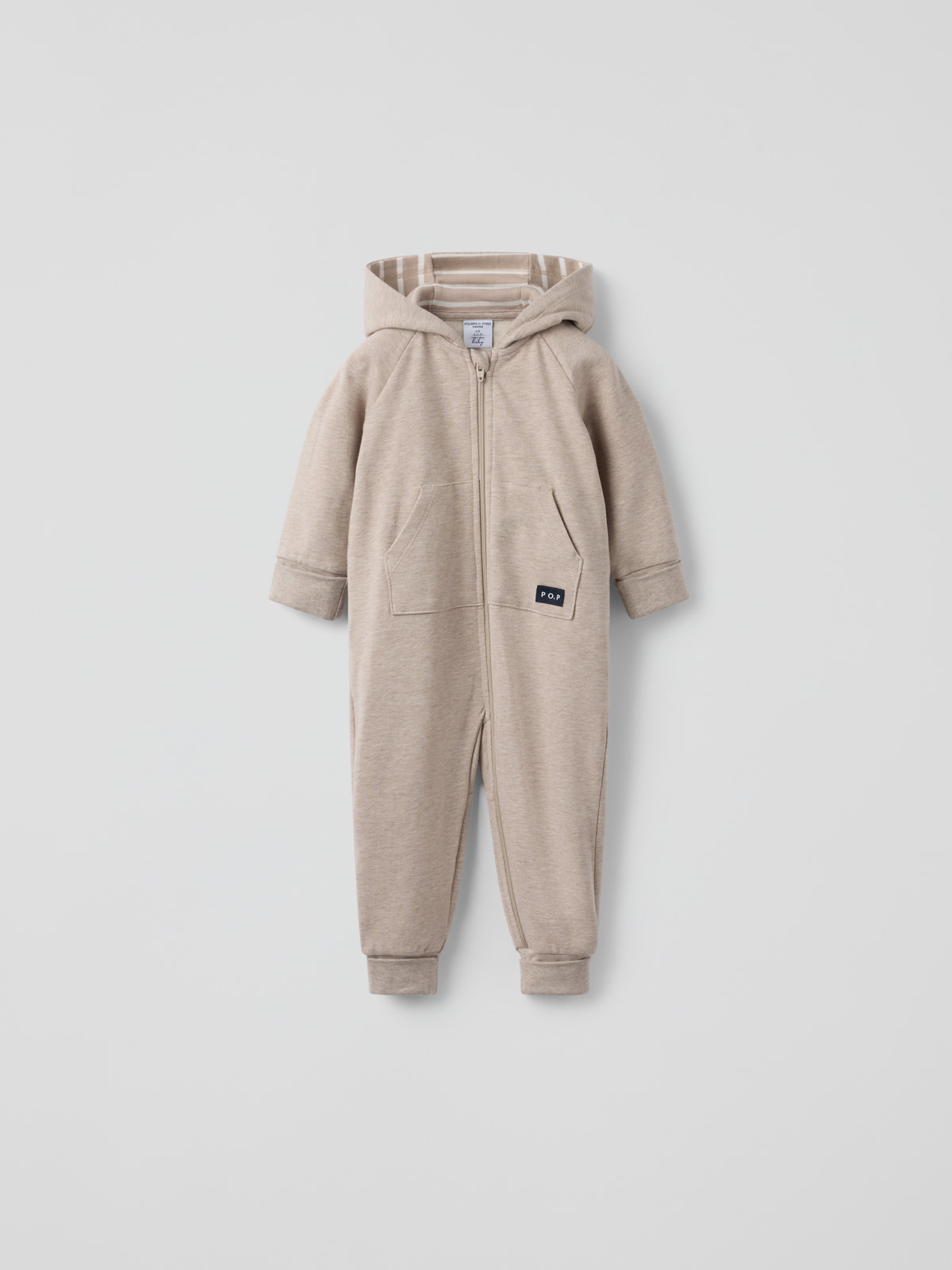 Soft all-in-one in organic cotton for, with a comfy sweatshirt feel and brushed lining. The all-in-one has a pouch pocket and an integral hood with soft cotton jersey lining. The neck-to-ankle zipper makes dressing easier and the chin guard is gentle against baby's chin and cheeks. This all-in-one has extra long, ribbed wrist and ankle cuffs that can be folded down as baby grows.