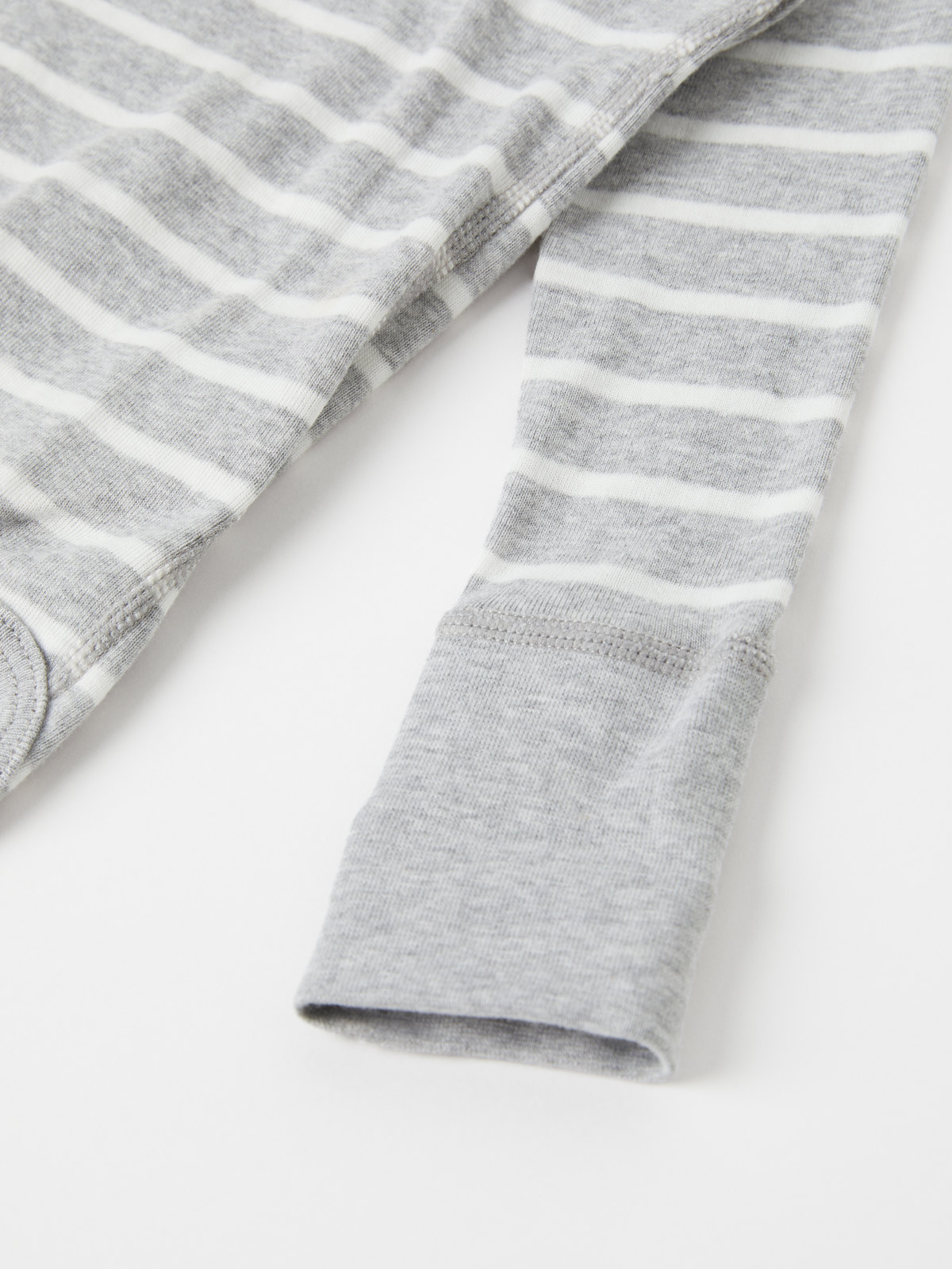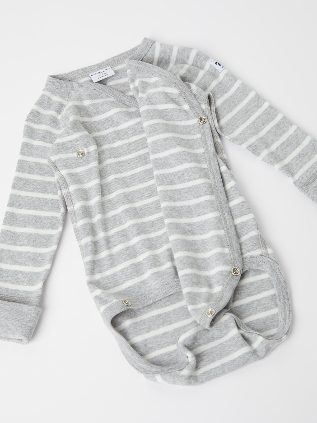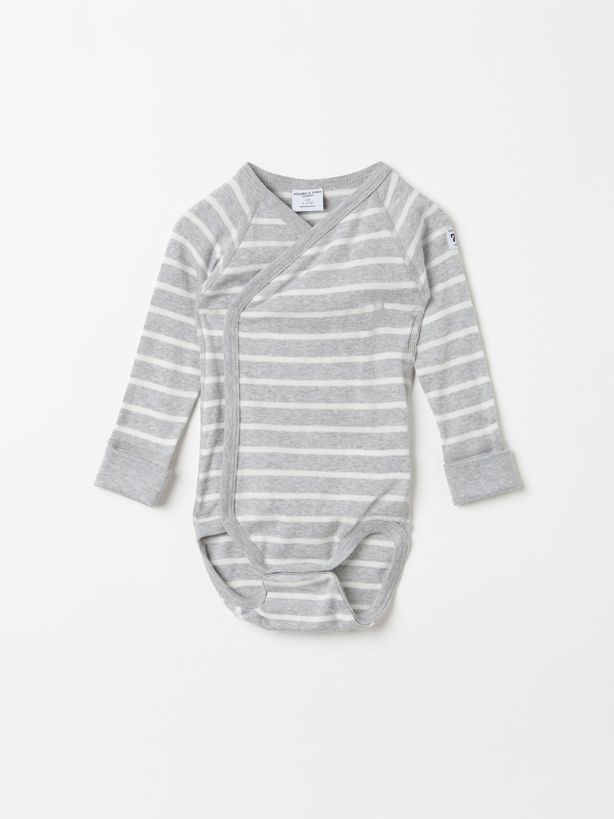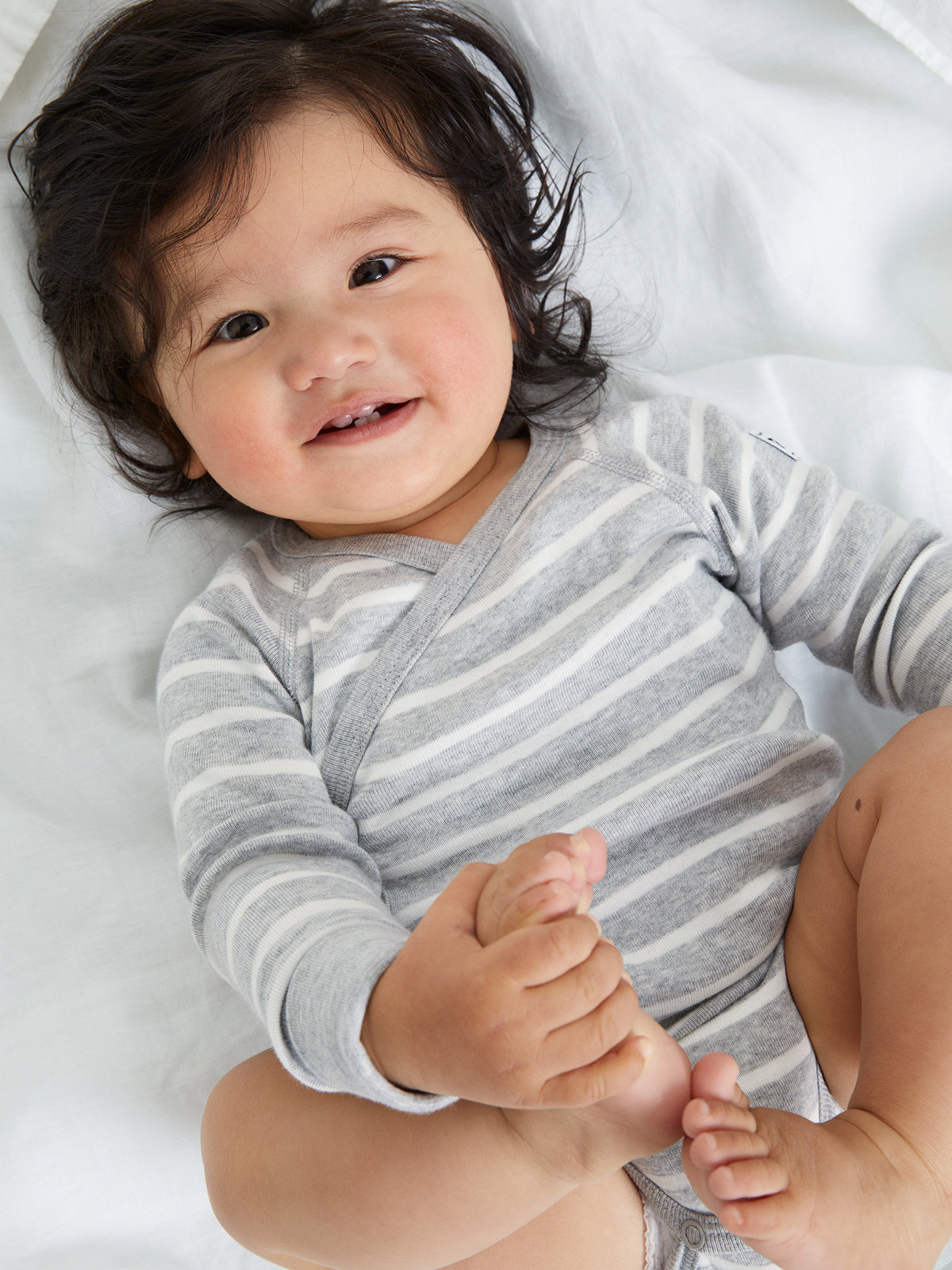 Wrap bodysuit in organic cotton for newborn. The bodysuit features our classic stripes and soft, ribbed cuffs that can be folded down as the baby grows. Snaps along the closure and at the crotch facilitate dressing and diaper changes.