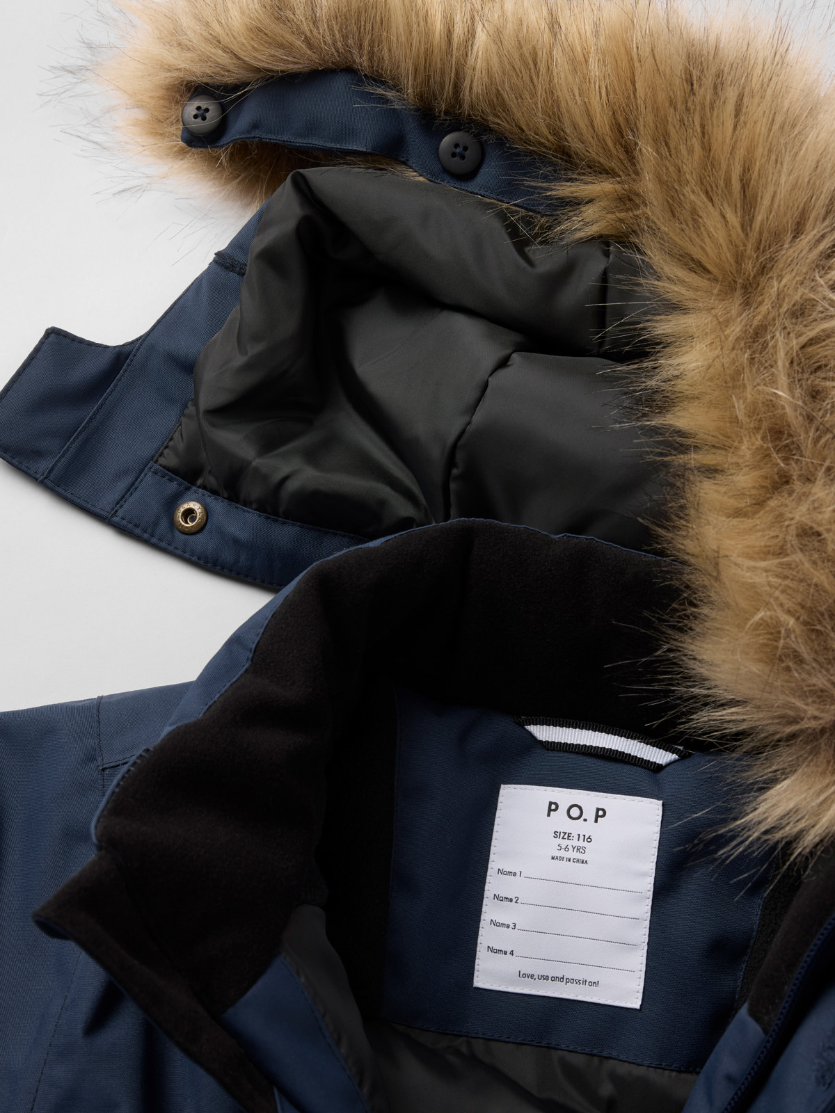 • Adjustable, detachable hood with snap buttons for safety – with removable faux fur trim