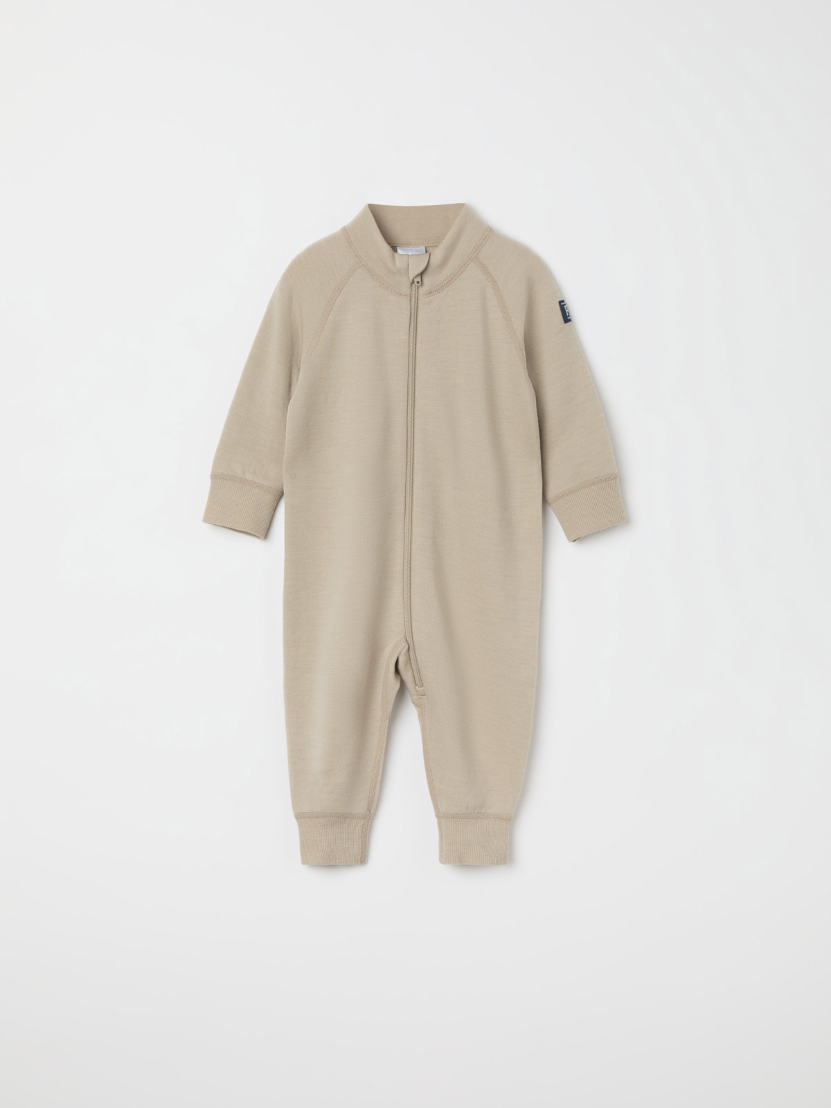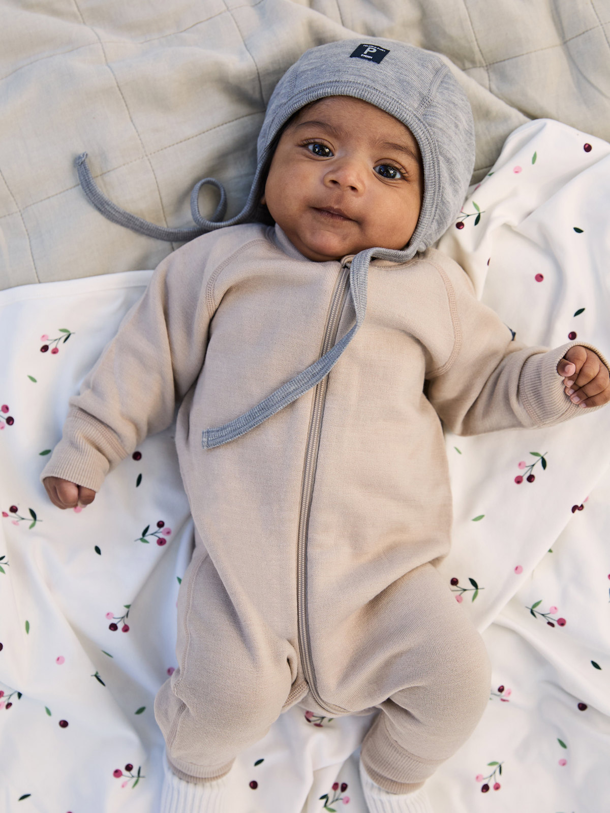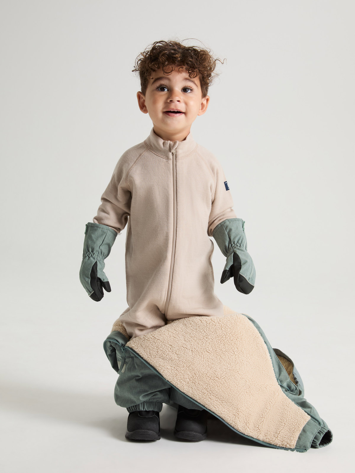 A warm all-in-one in soft and comfy merino wool terry that absorbs moisture, keeping the child warm and dry.