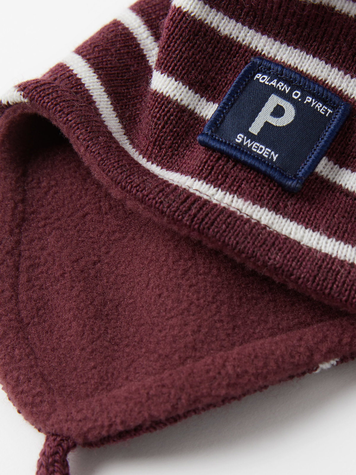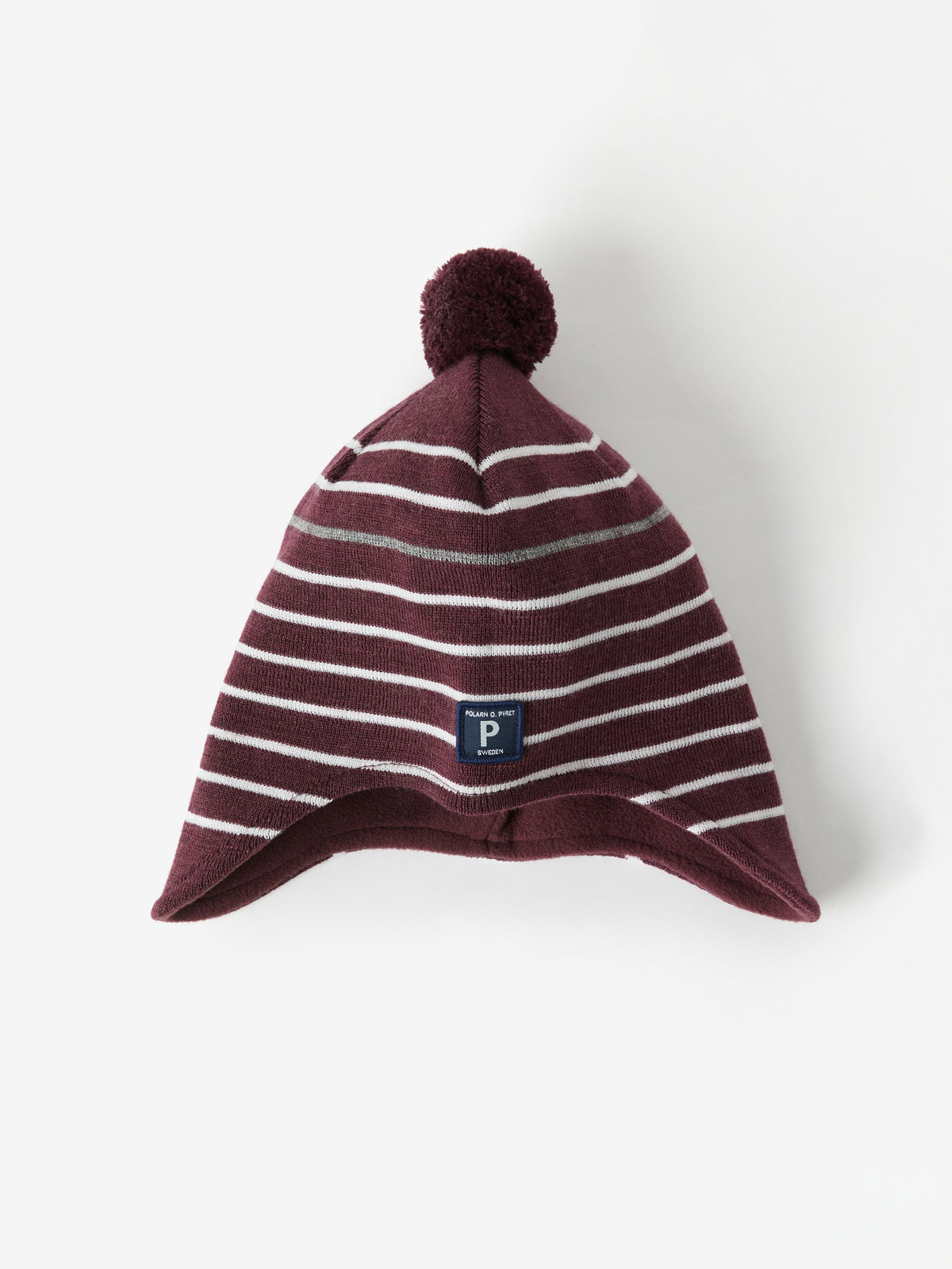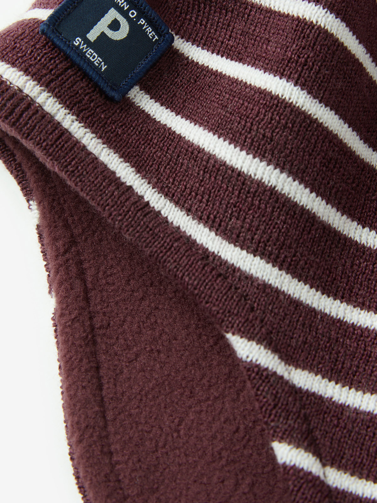 Striped helmet hat in cozy wool blend. The windproof hat has a soft, comfy fleece lining and goes down over the ears. The tie strings under the chin help to keep the hat in place. Size 52/54 is without ties. Wool retains warmth even in wet conditions.