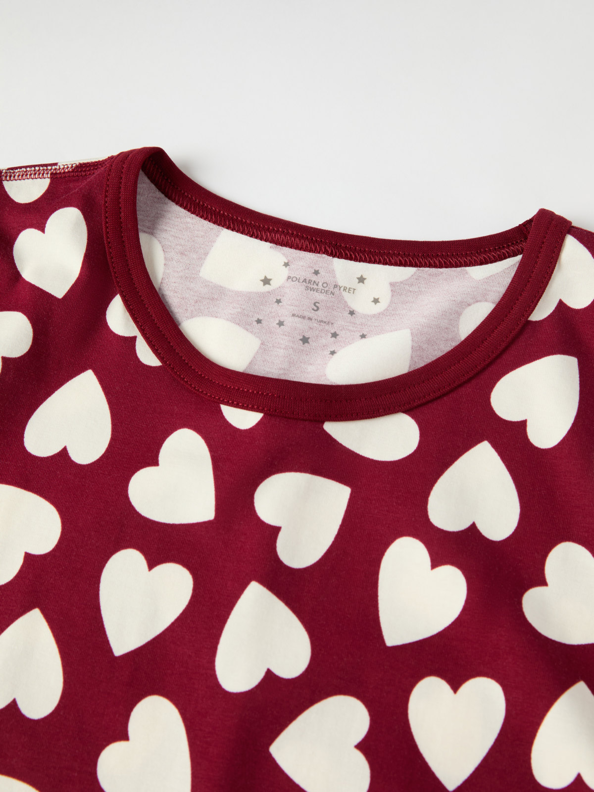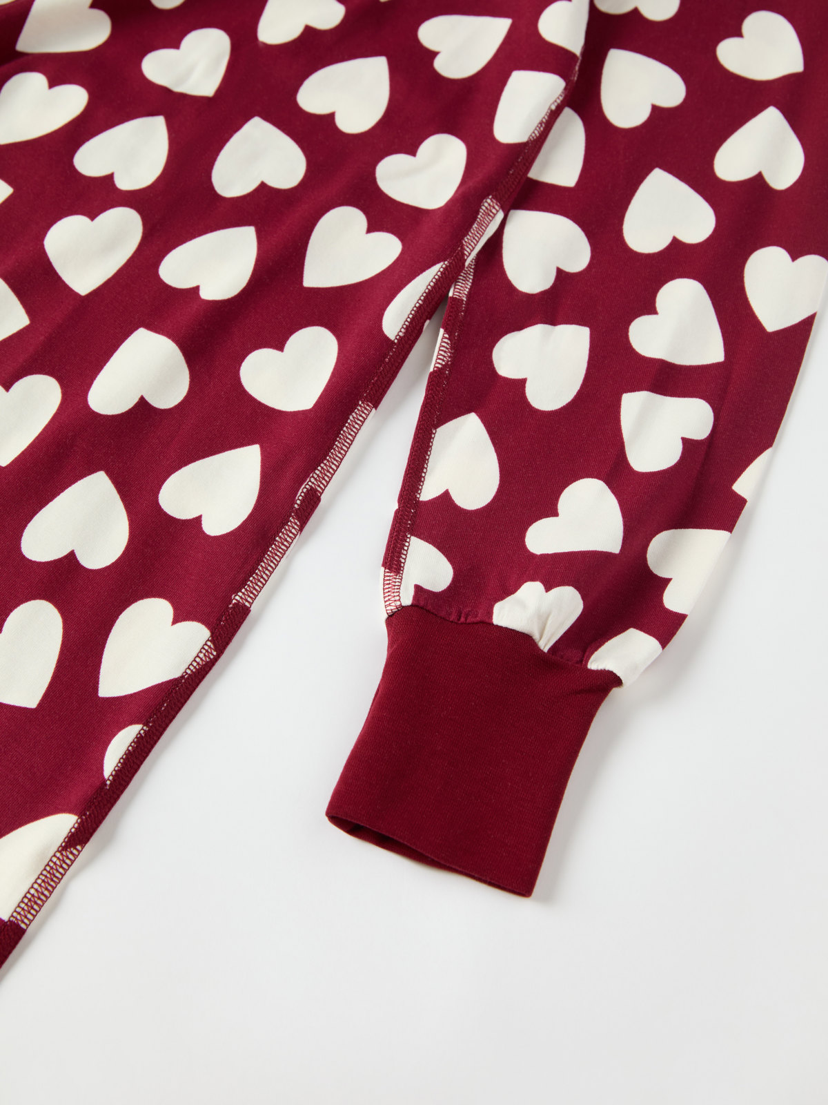 The nightgown features an allover print of small hearts, and a soft, solid color neckline and cuffs.