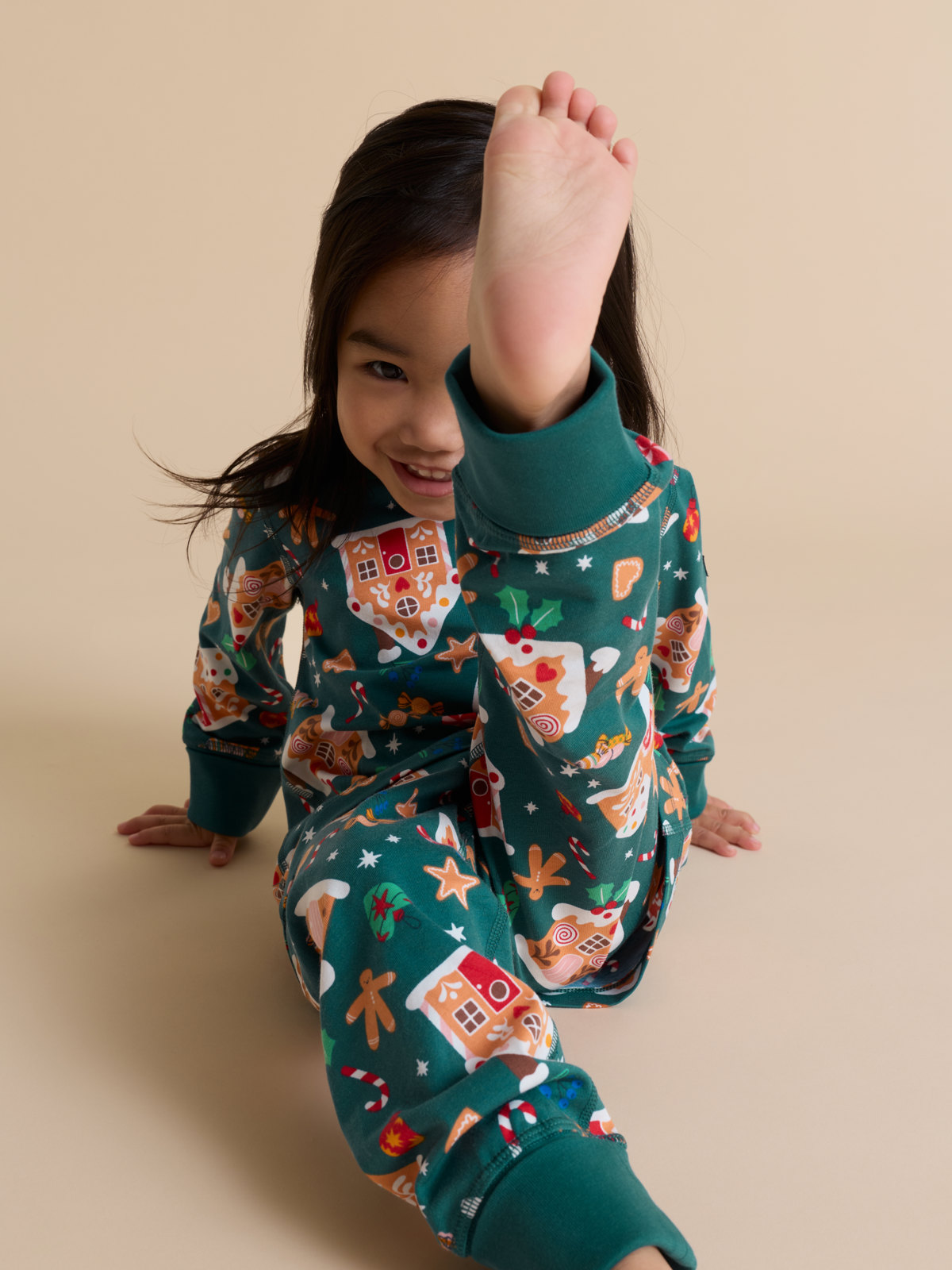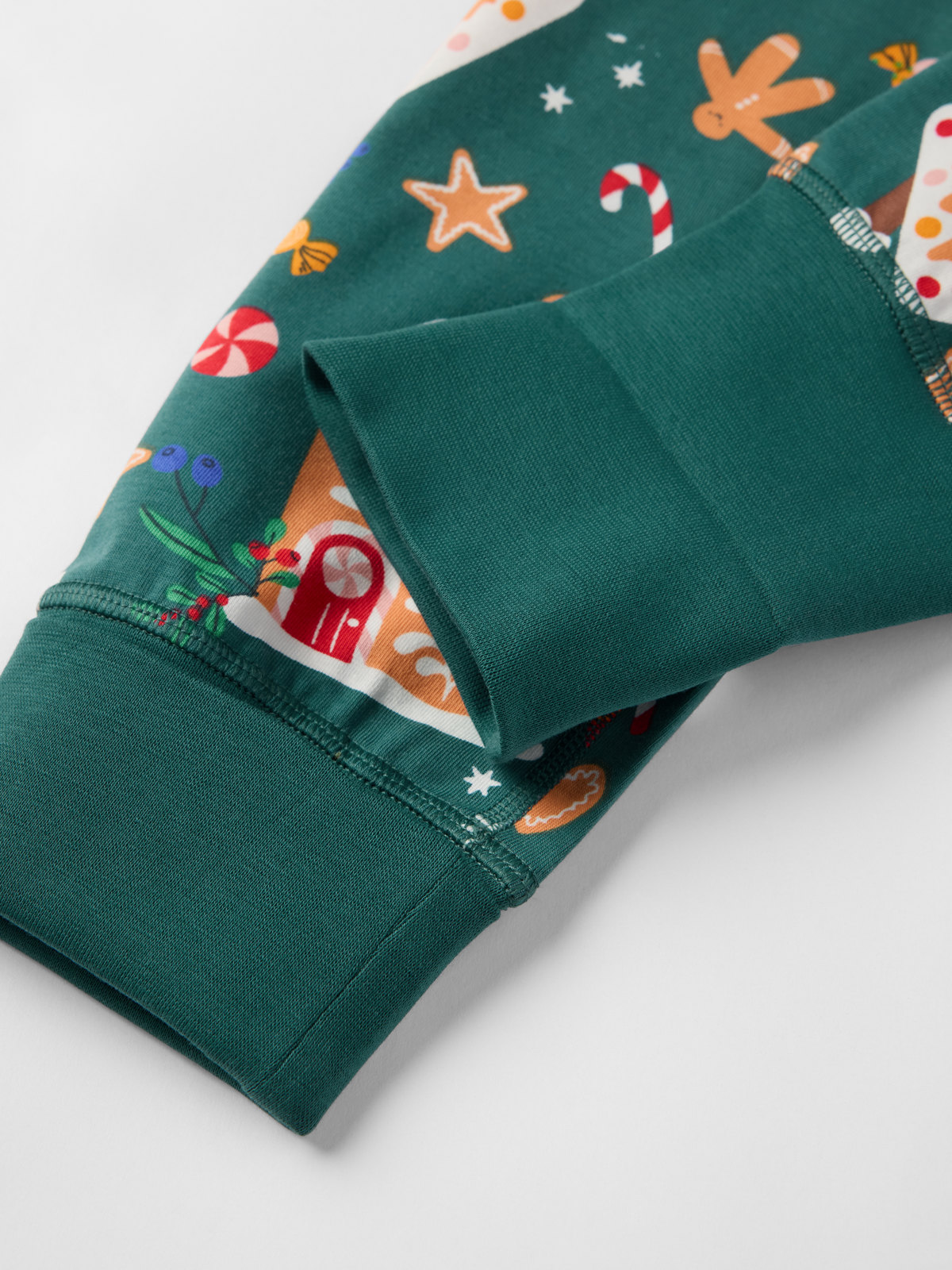 Two-piece pyjamas in soft organic cotton. The top has long sleeves with extra long cuffs that can be folded up or down. The bottoms have an elastic waist and extra long ankle cuffs.