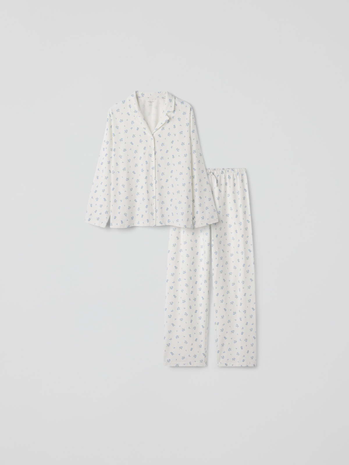 MAMA pyjamas in soft organic cotton jersey – perfect for sleeping and lounging, both during pregnancy and after your baby has arrived. The shirt features a soft collar and front buttons. The trousers have straight legs and an elastic waistband that rests gently under the growing belly. The waist can also be adjusted with a drawstring.