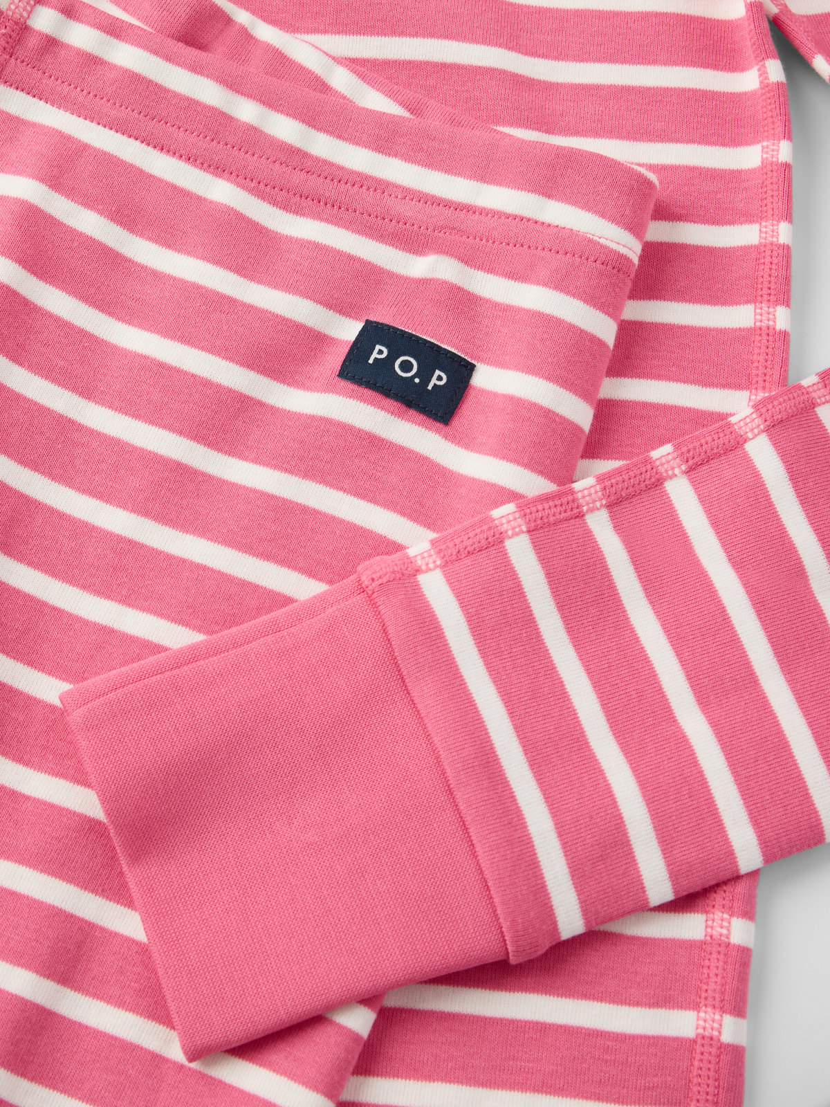 A set of top and trousers in our classic stripes, in adult sizes. The top features a soft, ribbed neckline and cuffs. The bottoms have an elastic waist and soft, ribbed ankle cuffs.