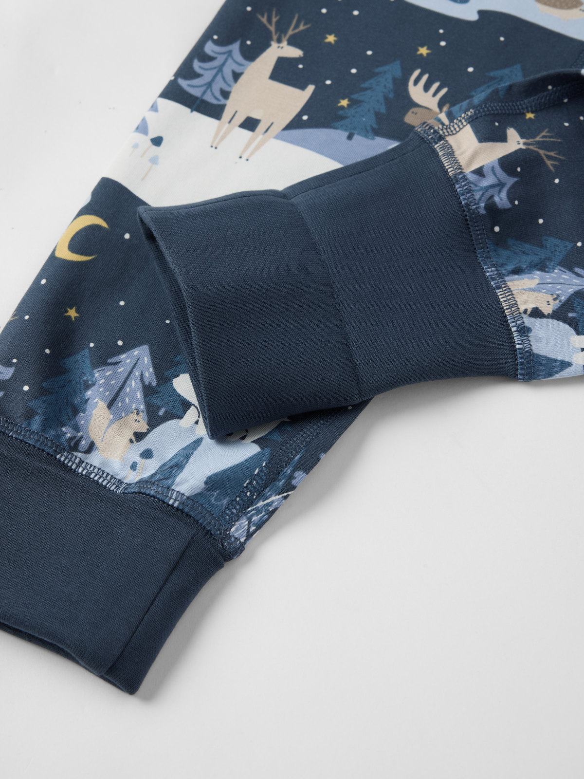 Two-piece pyjamas in soft organic cotton. The top has long sleeves with extra long cuffs that can be folded up or down. The bottoms have an elastic waist and extra long ankle cuffs.
