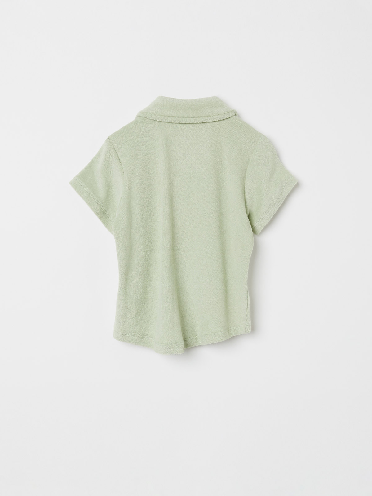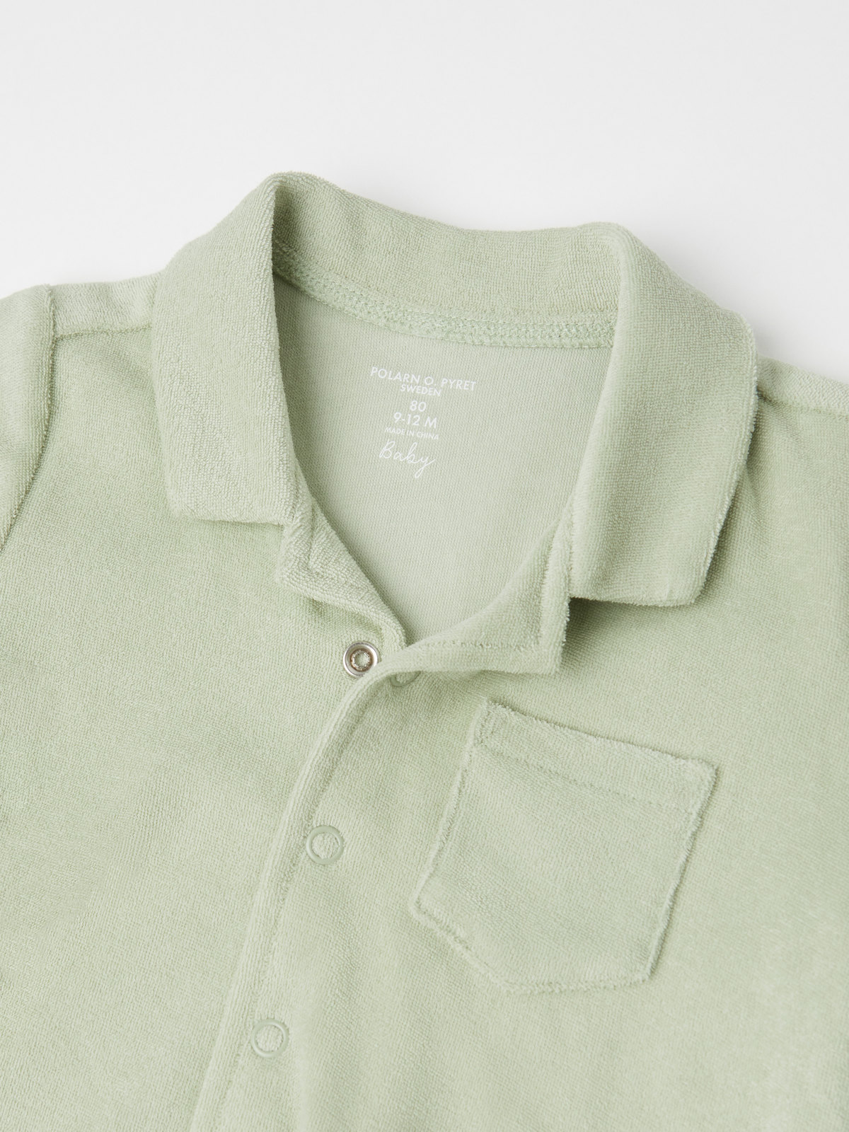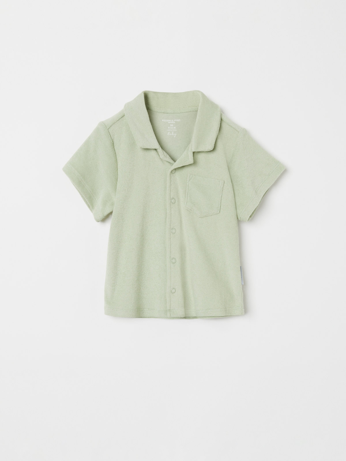 New! Short sleeve shirt in 100% organic terry cotton for baby. The shirt has a chest pocket and a snap closure at the front.