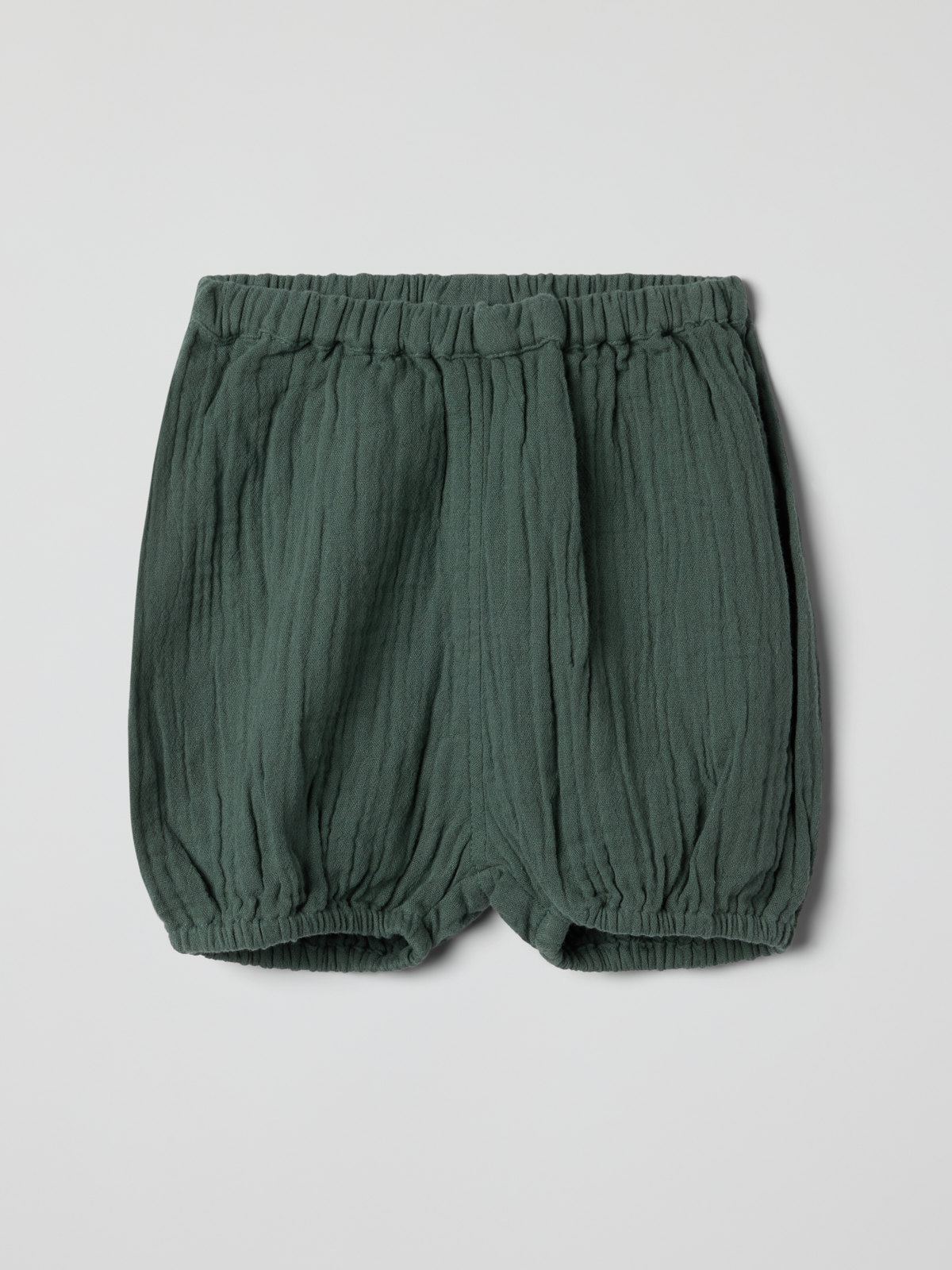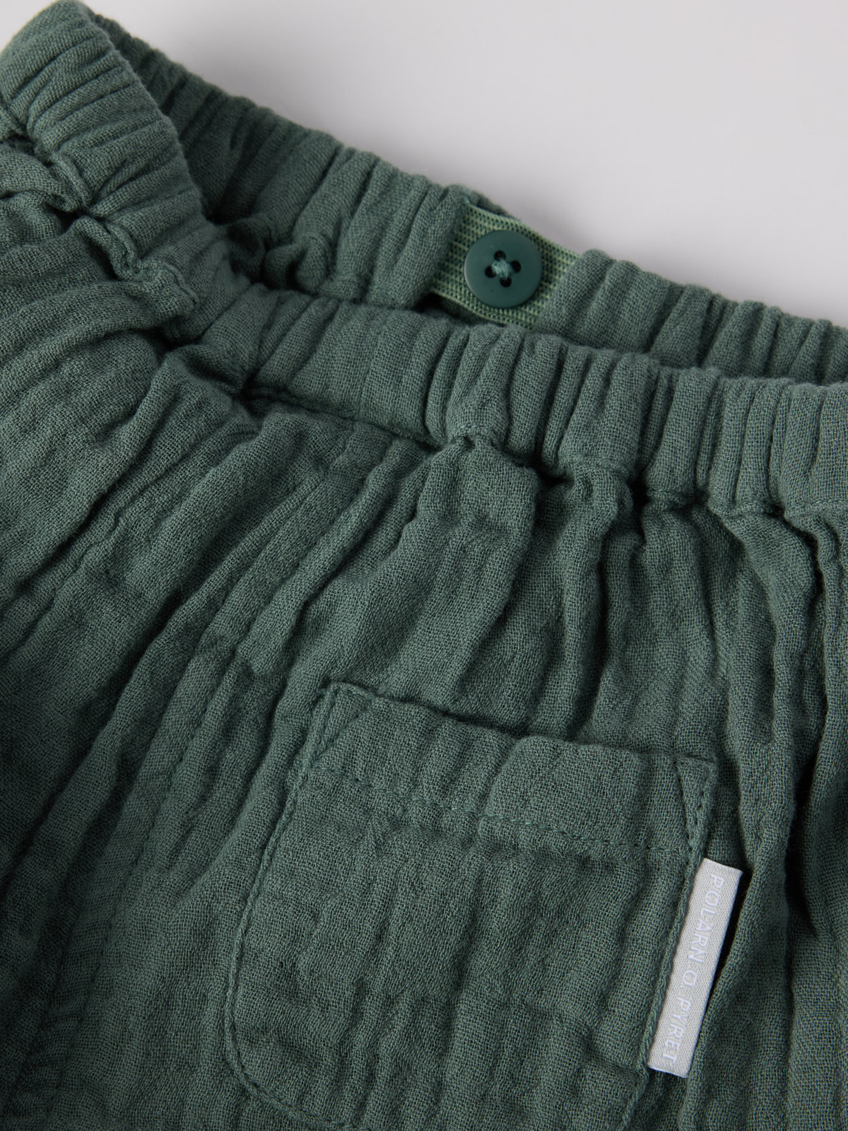 Shorts in thin and soft 100% organic cotton muslin for baby – a perfect everyday garment for the summer wardrobe! The shorts have an elastic waist and ankle cuffs for a comfy fit, and a back pocket.