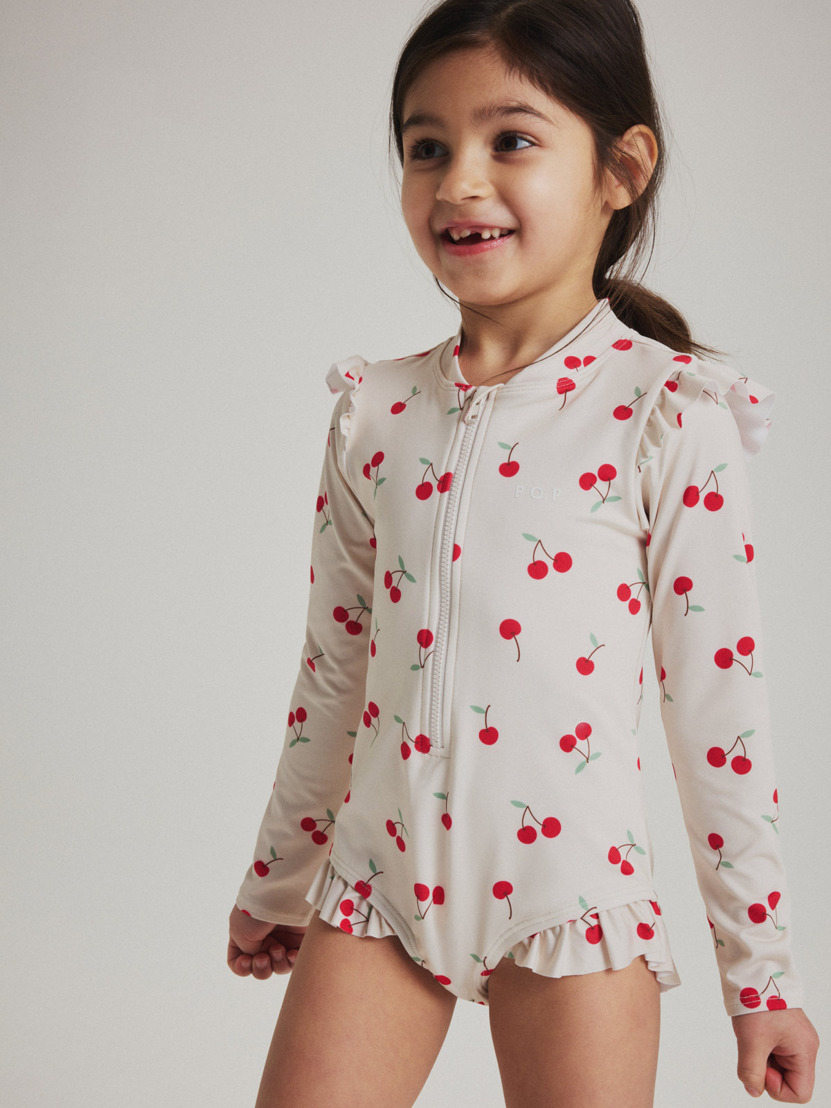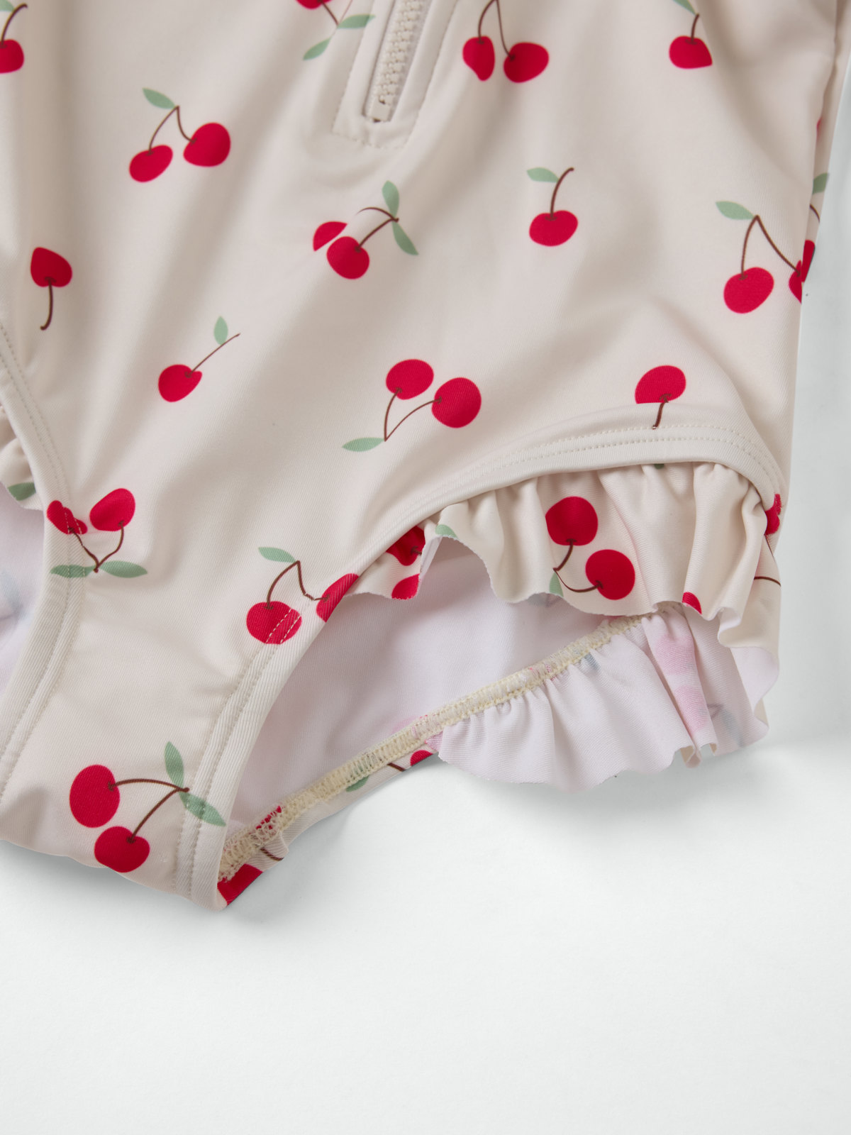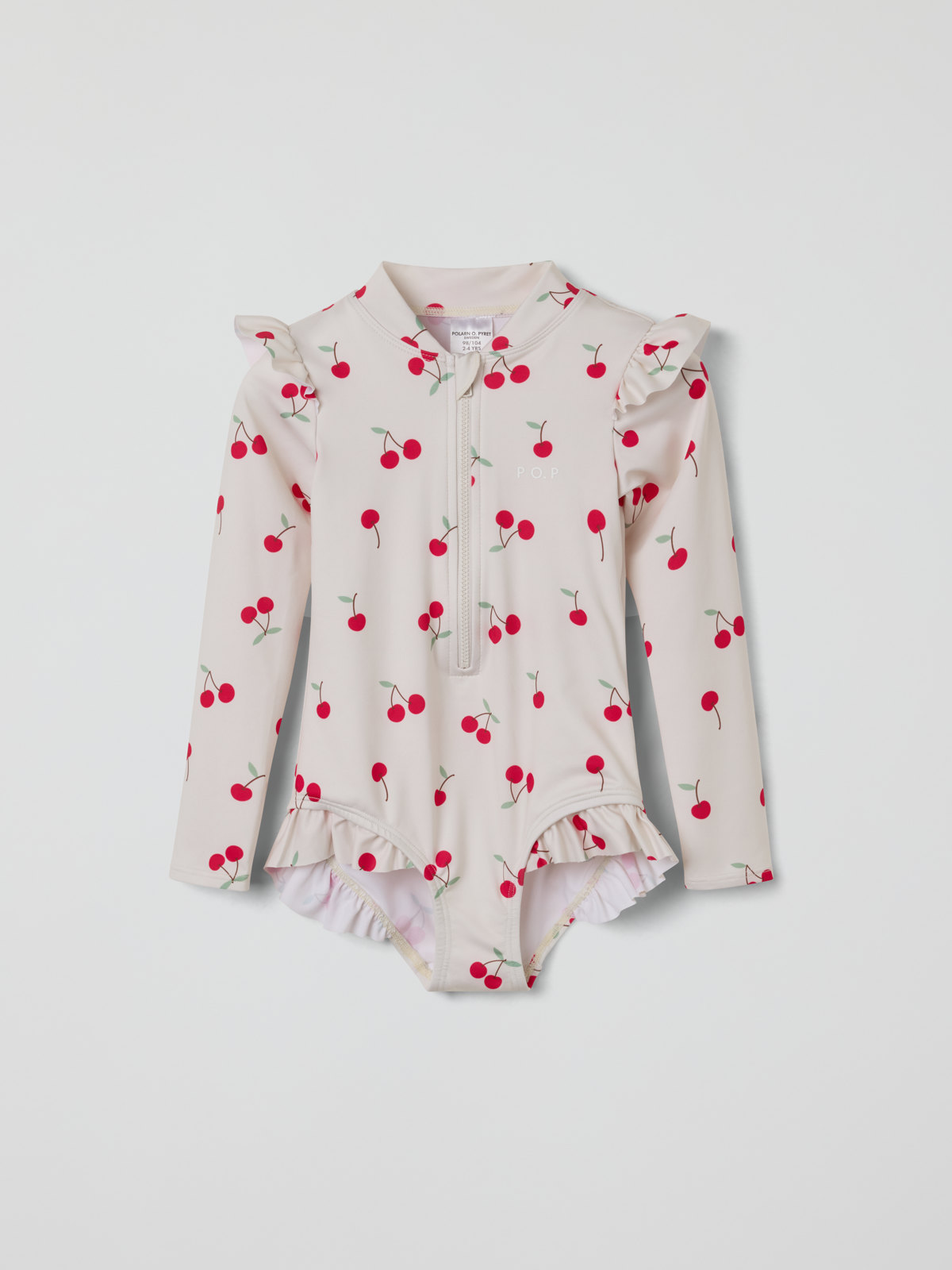 Long-sleeved swimsuit made from soft, comfortable recycled polyester – ideal for little ones who love to spend hours in the water! The swimsuit features a clever front zip and is covered all over with cherries. Adorable frills decorate the shoulders and legs.