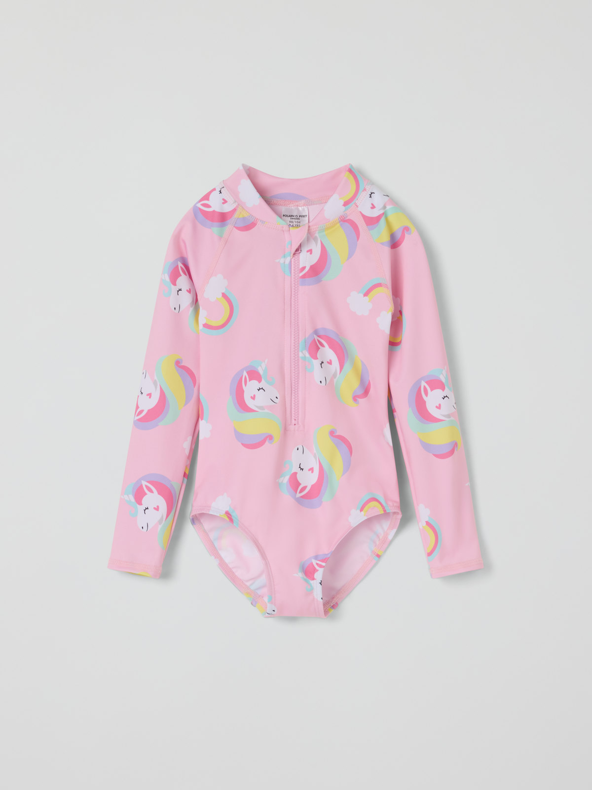 Long-sleeved swimsuit made from soft, comfortable recycled polyester – ideal for little ones who love to spend hours in the water! The swimsuit features a clever front zip and is covered all over with unicorns.